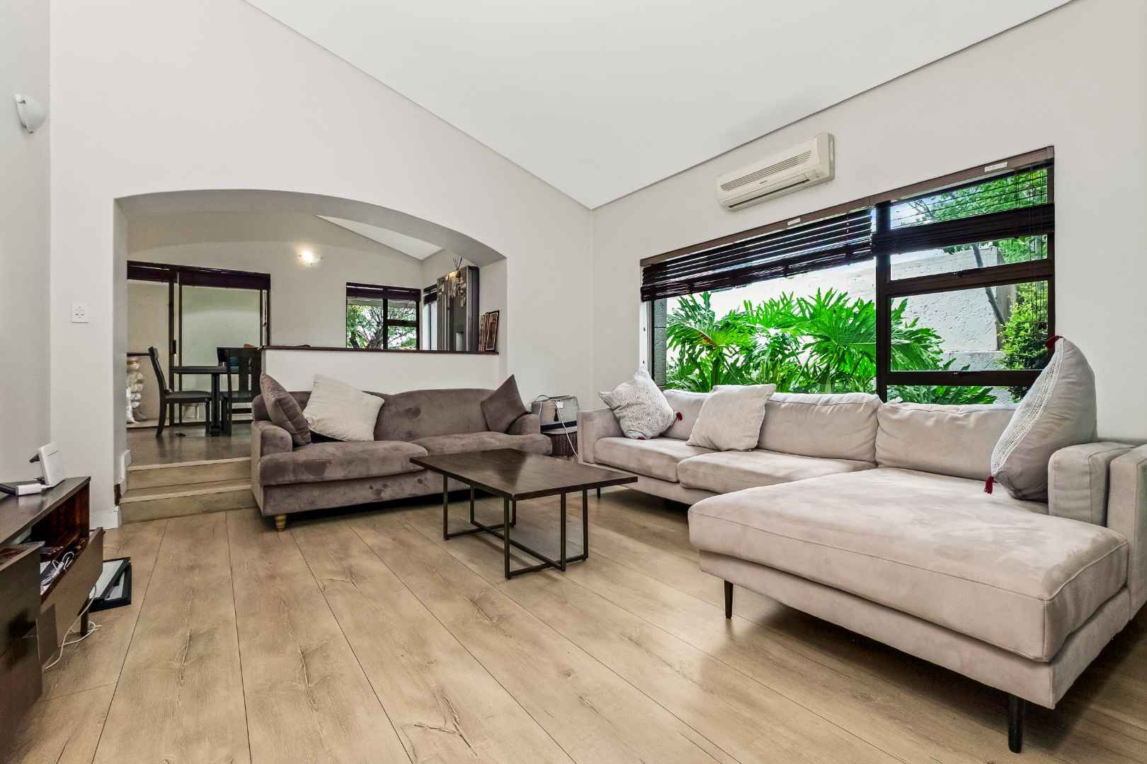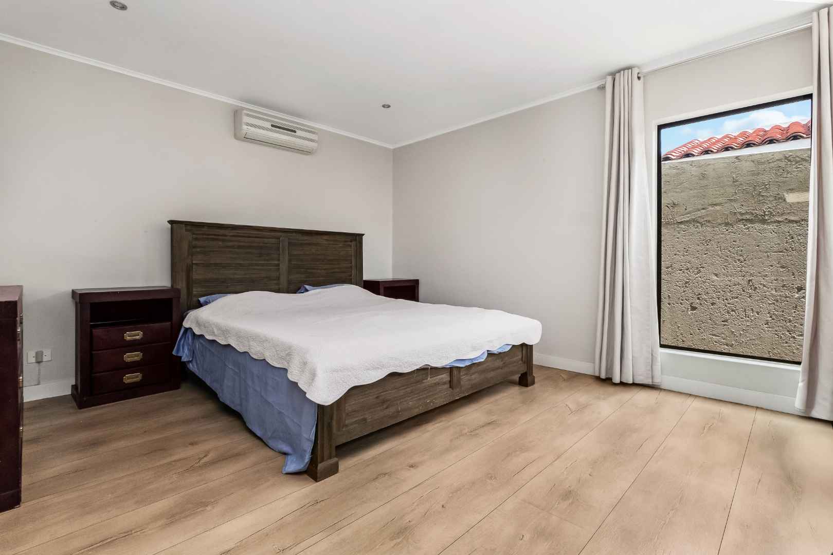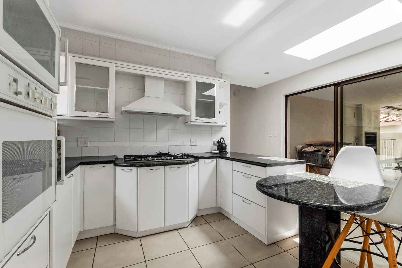 Modern kitchen with granite countertops, white painted cupboards, breakfast bar, gas hob with extractor fan and 2 Defy electric eye-level ovens plus walk-in pantry cupboard and small scullery area. 3 Bedrooms have laminate flooring, 2 full bathrooms, main en-suite. Main bedroom and family room have air-conditioning; the other 2 bedrooms have ceiling-fans. The main bedroom opens out onto small private patio. Double garage has direct access into the house. There is no staff accommodation.