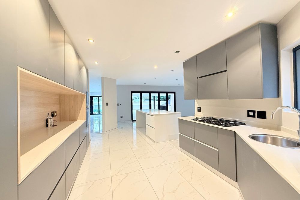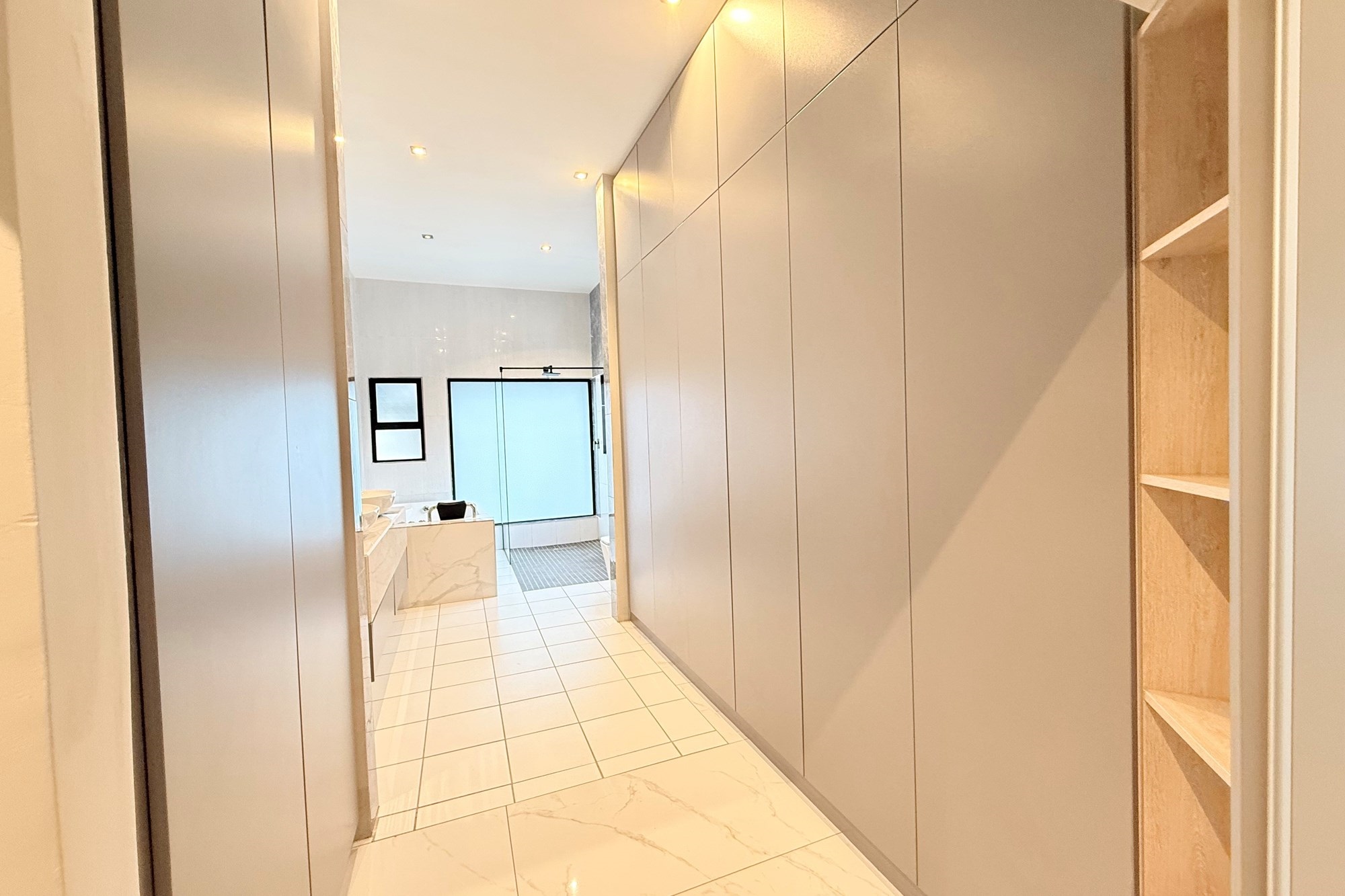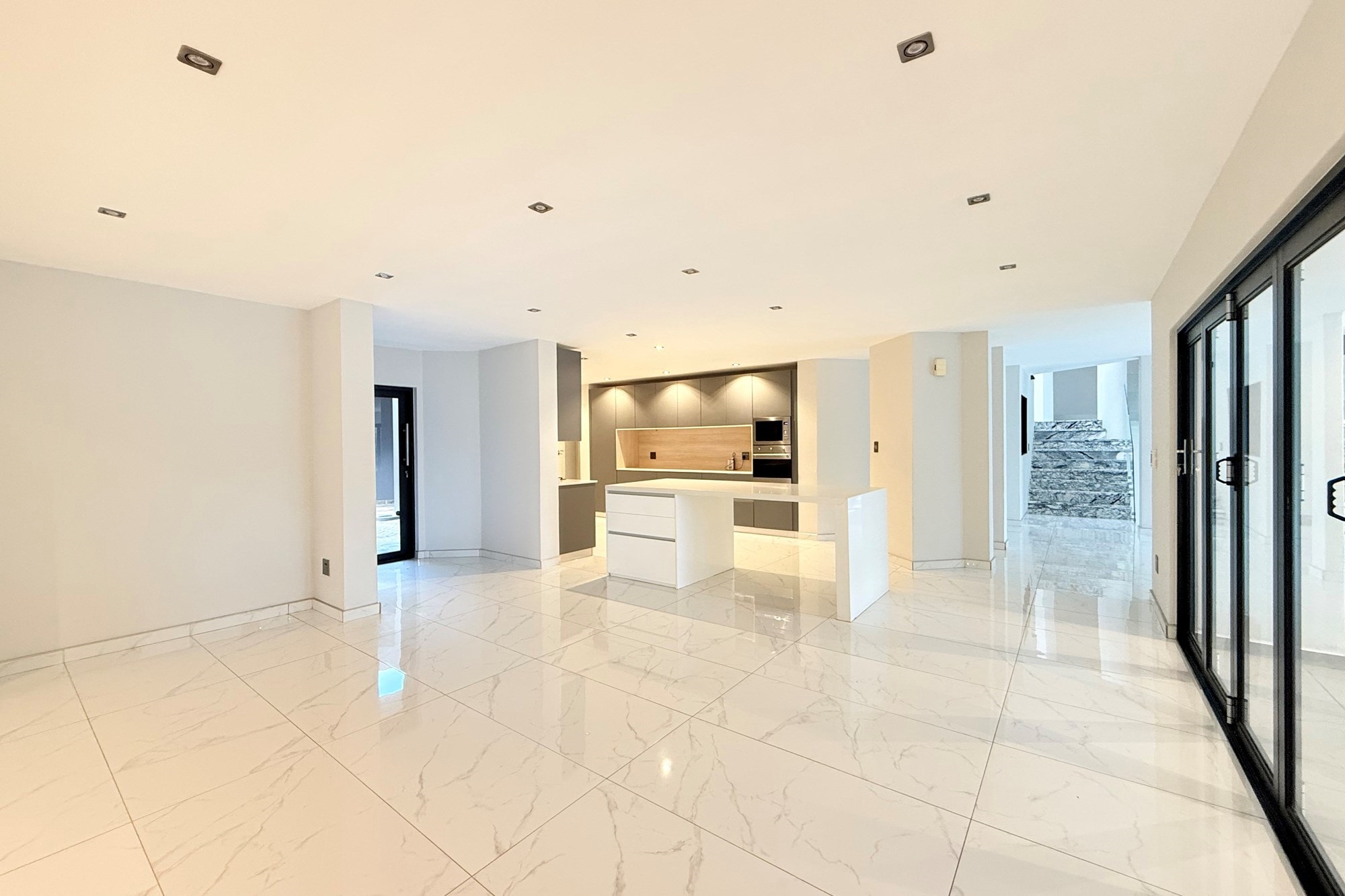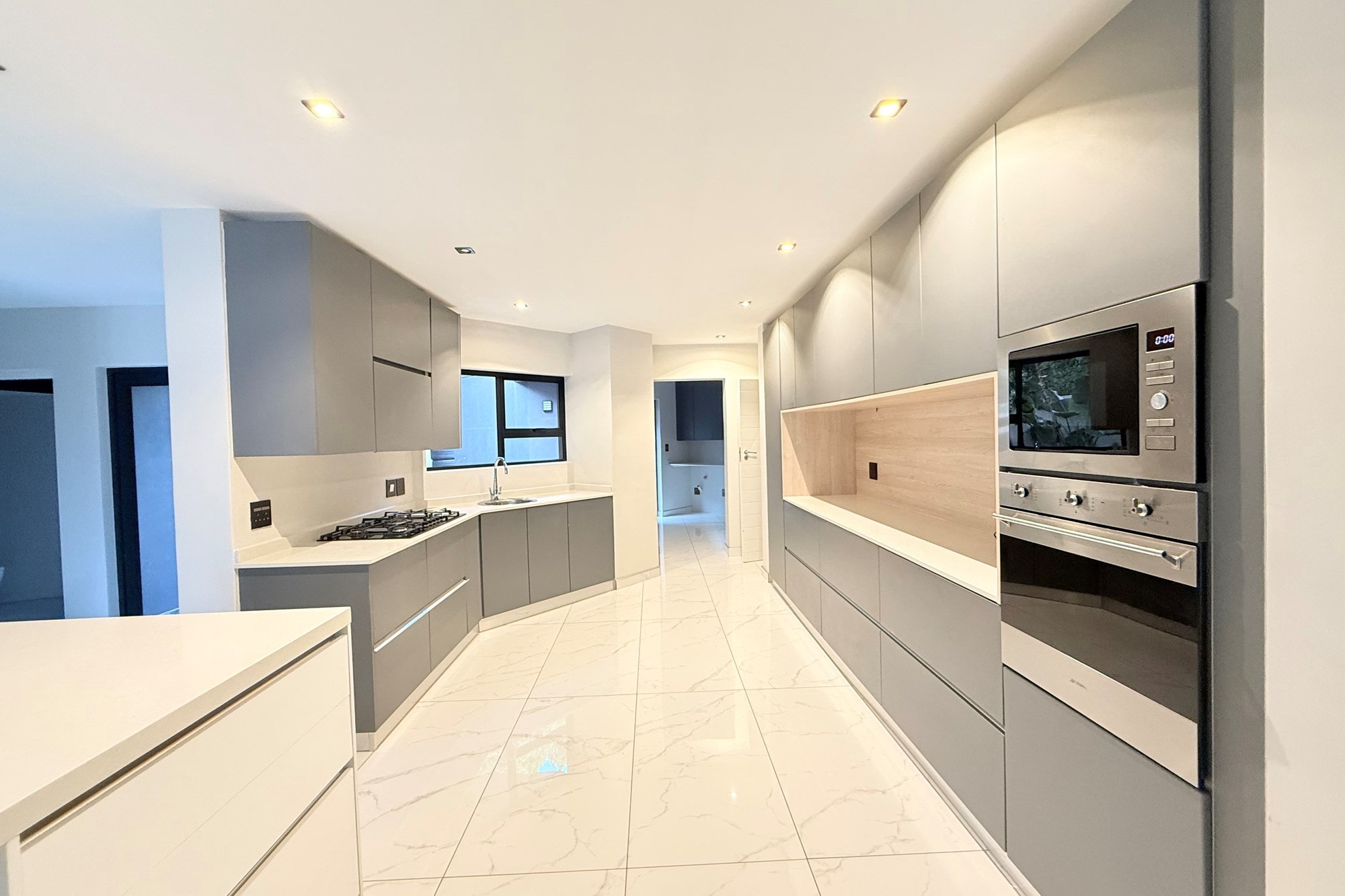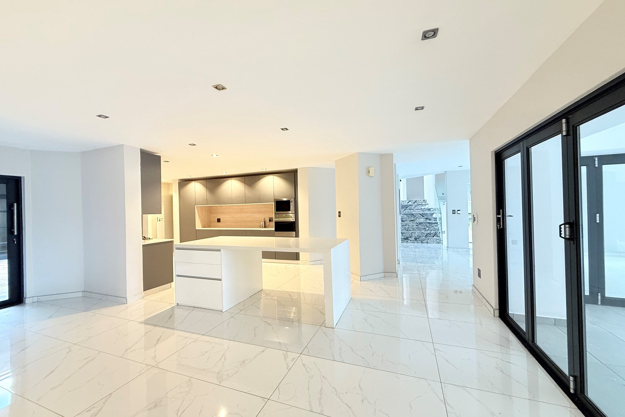 Gourmet Kitchen and Versatile Spaces - The sleek, modern kitchen is a chef`s dream, complete with a large central island, a 5-plate gas hob, and a separate scullery. The kitchen offers ample cupboard space for all your storage needs. Adjacent to the living areas is a flexible room that can be used as a playroom, study, or guest room, with its own separate bathroom for added convenience.