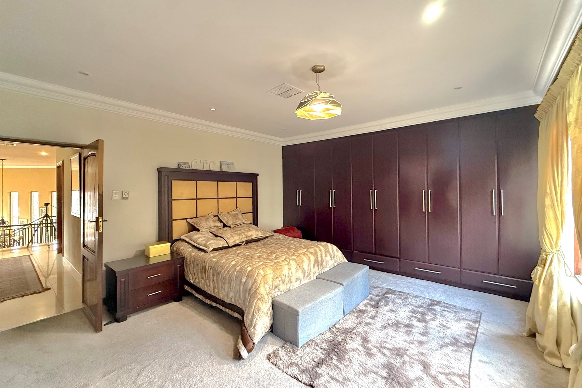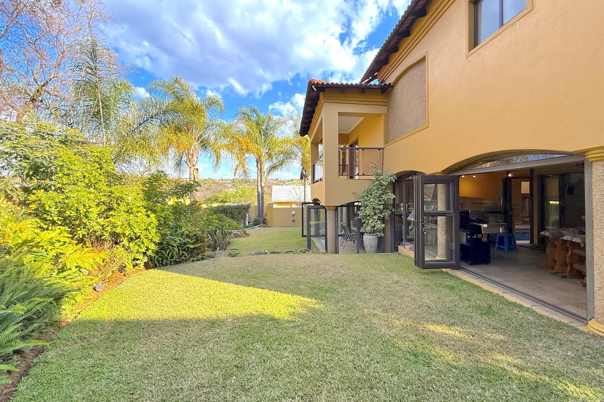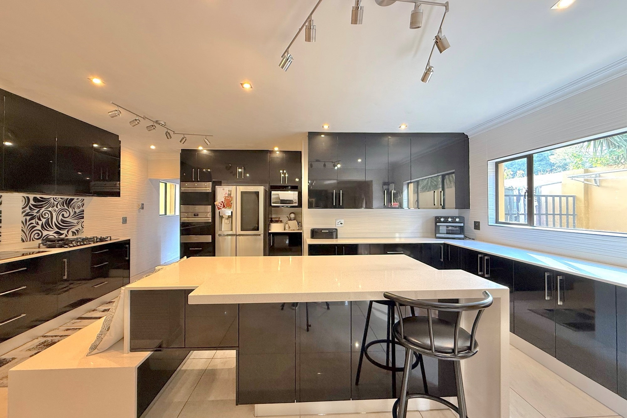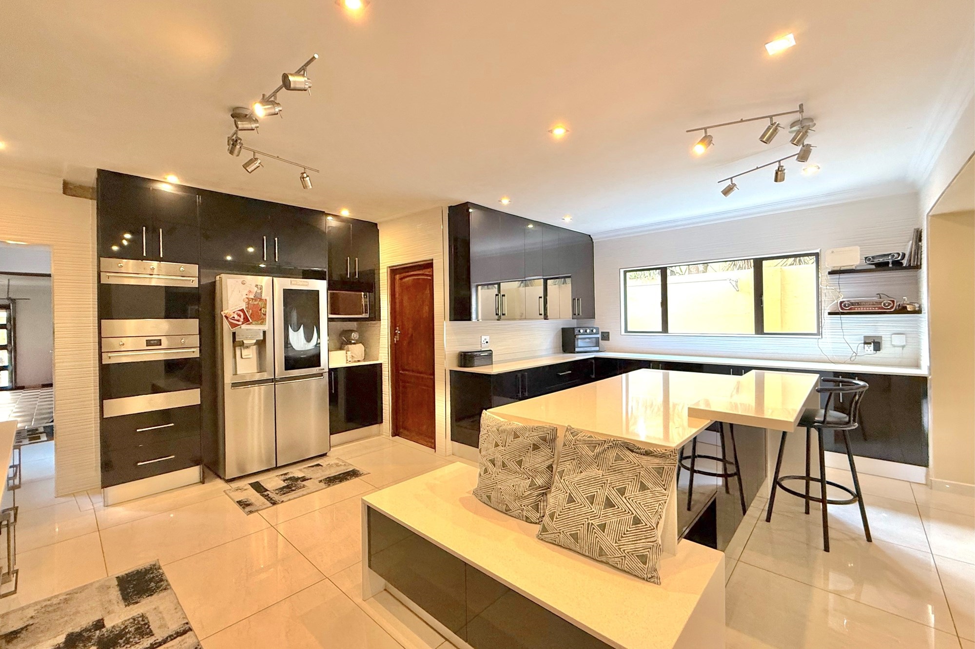 Upstairs, a pyjama lounge and cosy reading nook lead to five generously sized bedrooms and four bathrooms, four of which are en-suite. Two bathrooms have been newly renovated with chic, contemporary finishes. The luxurious main suite is a private retreat, complete with its own lounge, dressing room, opulent en-suite, and two balconies with sweeping views across Dainfern.
