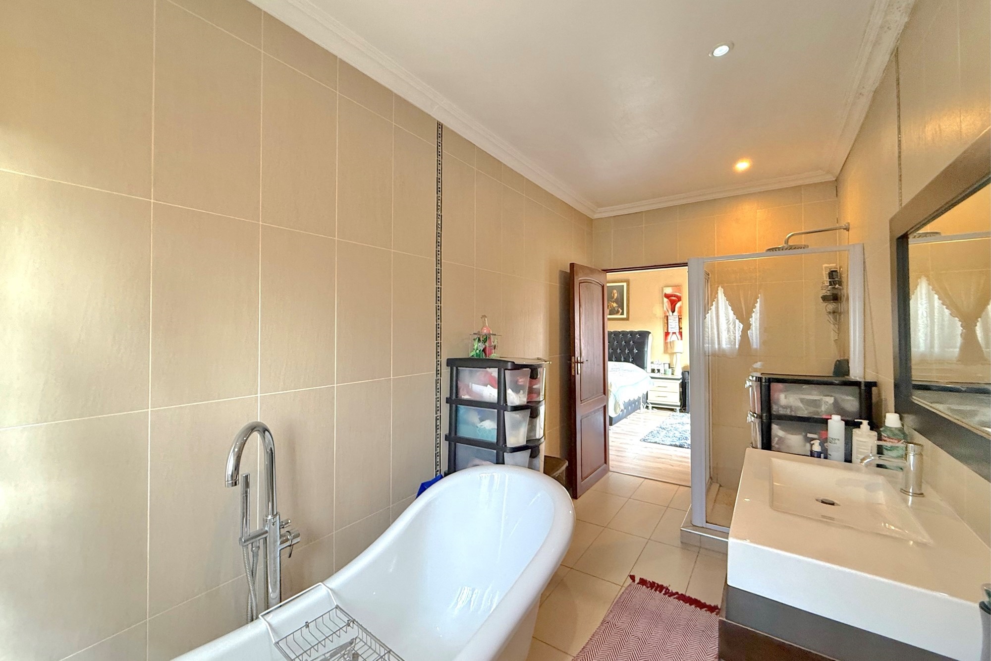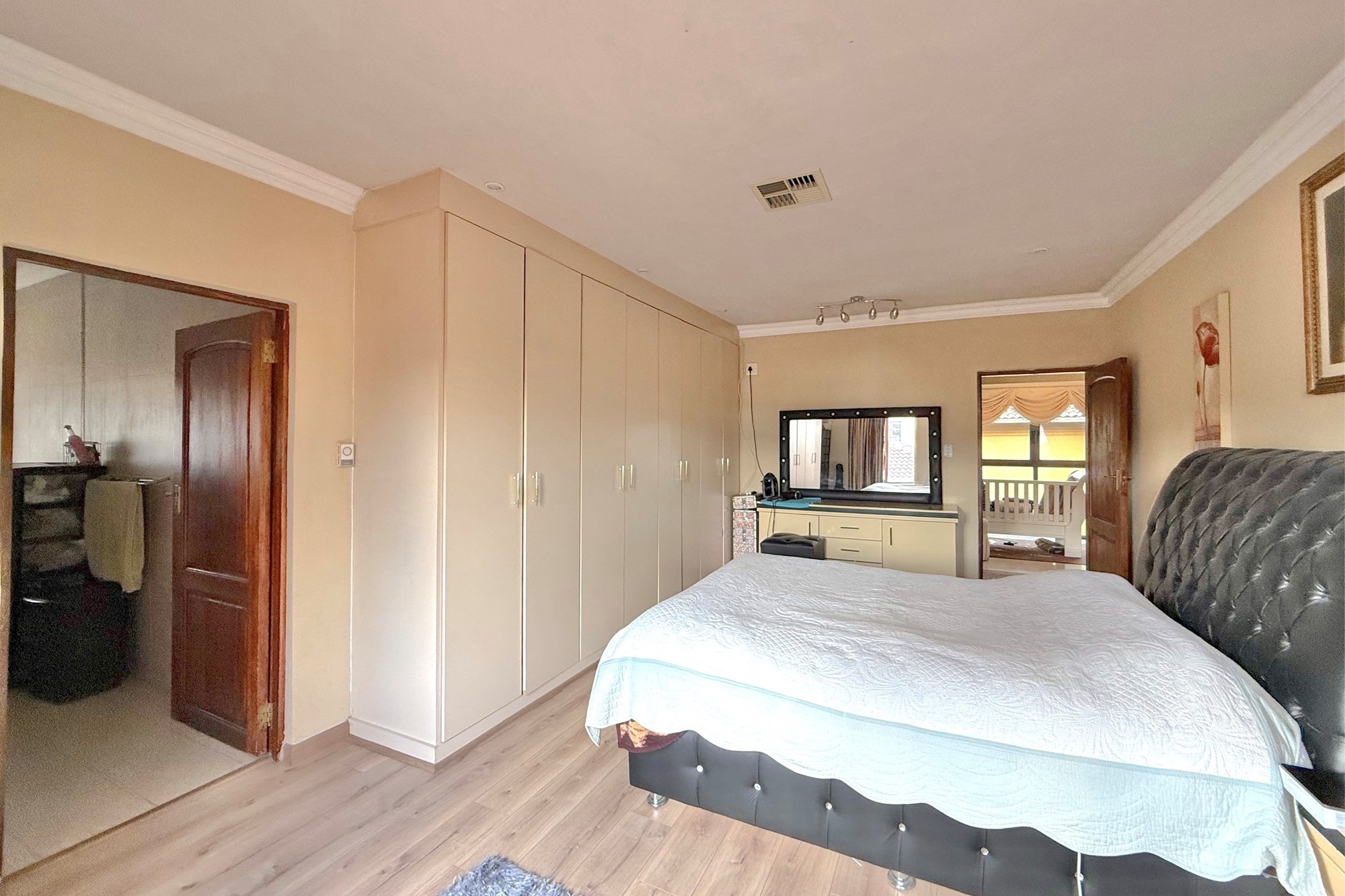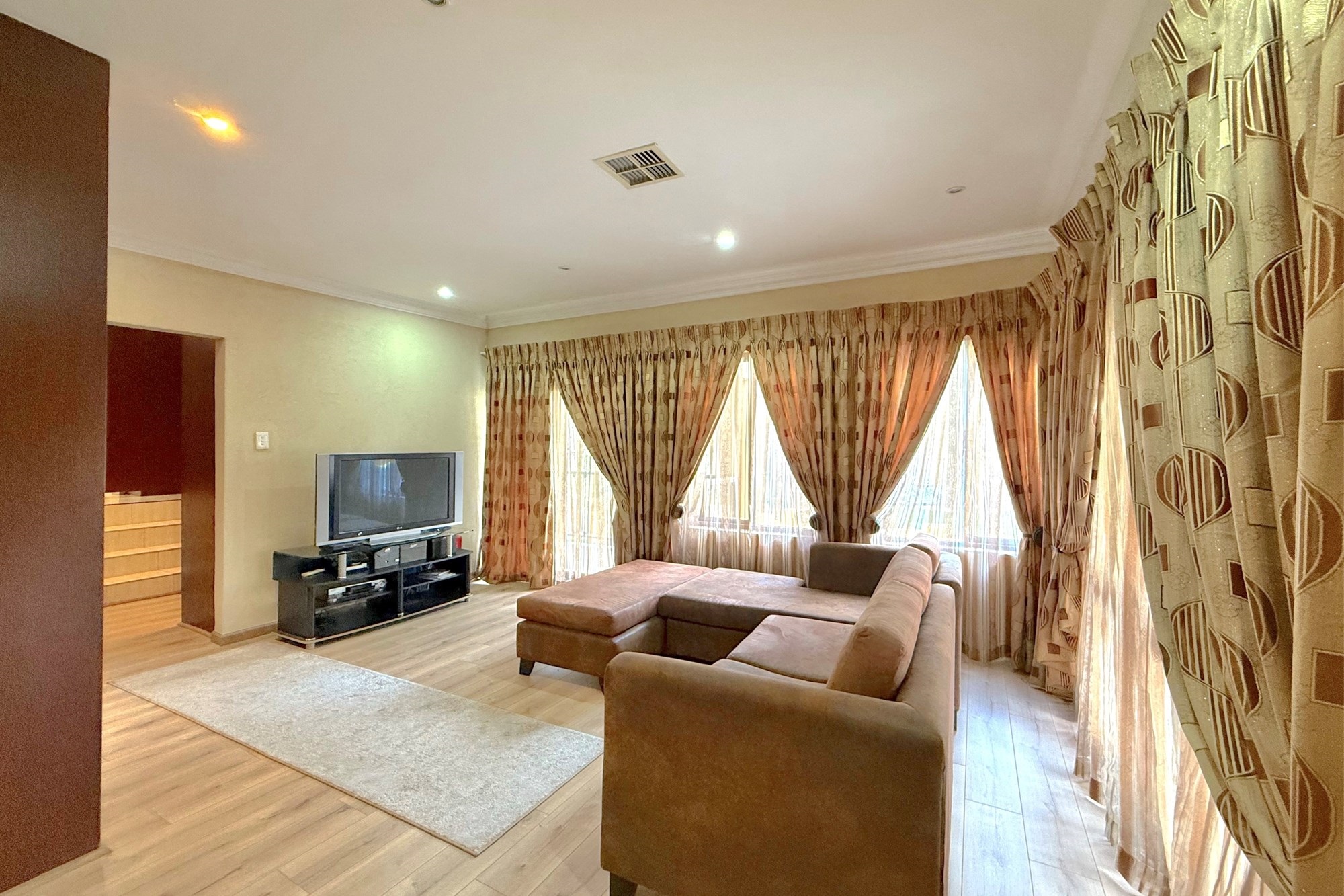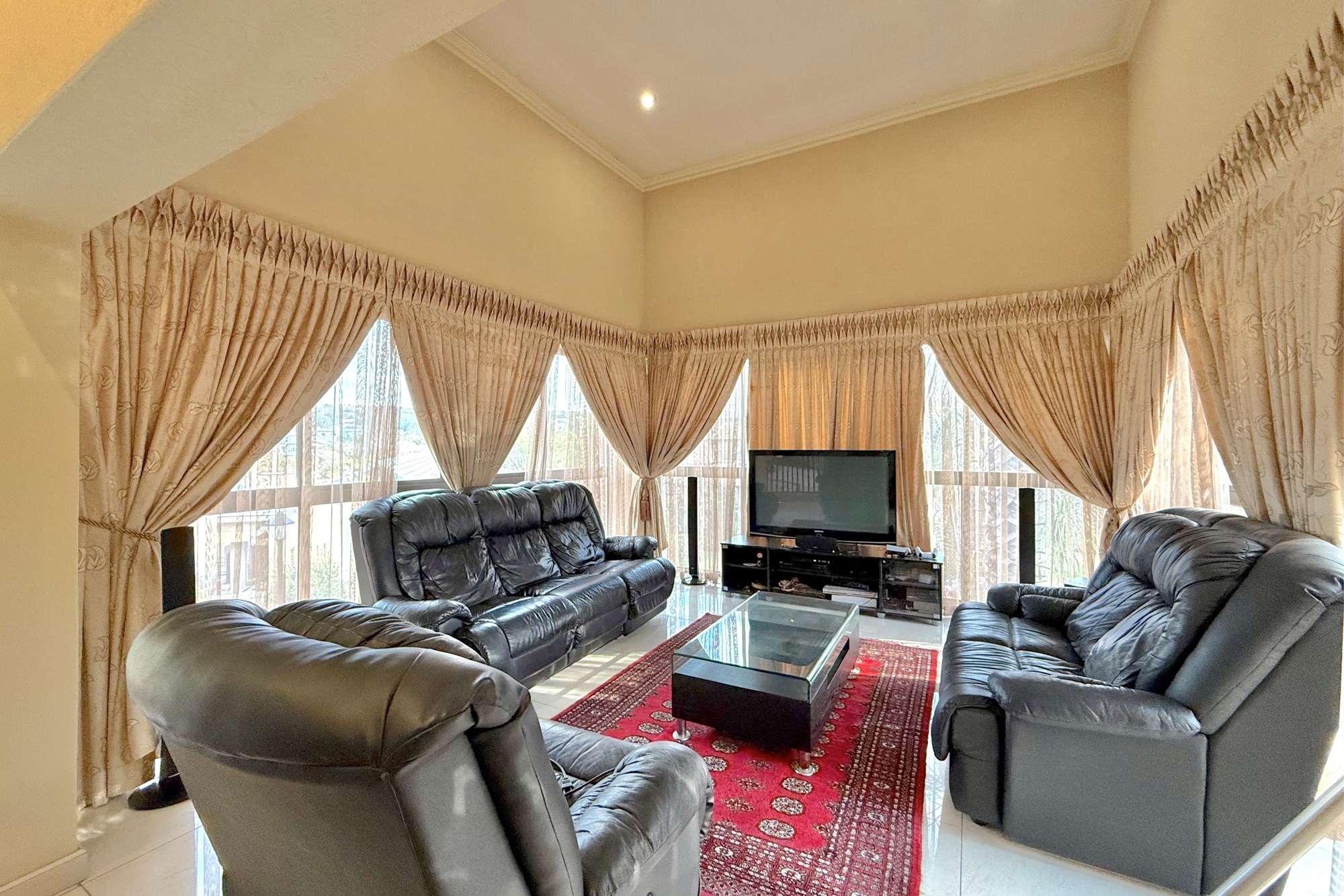 Upstairs, a pyjama lounge and cosy reading nook lead to five generously sized bedrooms and four bathrooms, four of which are en-suite. Two bathrooms have been newly renovated with chic, contemporary finishes. The luxurious main suite is a private retreat, complete with its own lounge, dressing room, opulent en-suite, and two balconies with sweeping views across Dainfern.