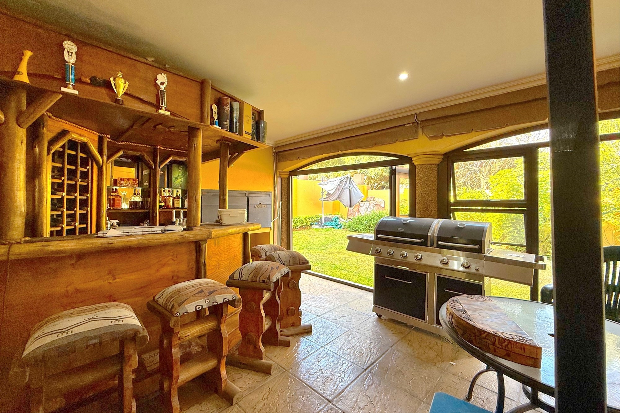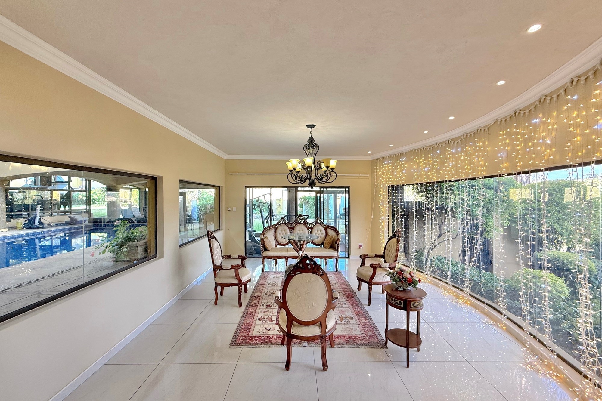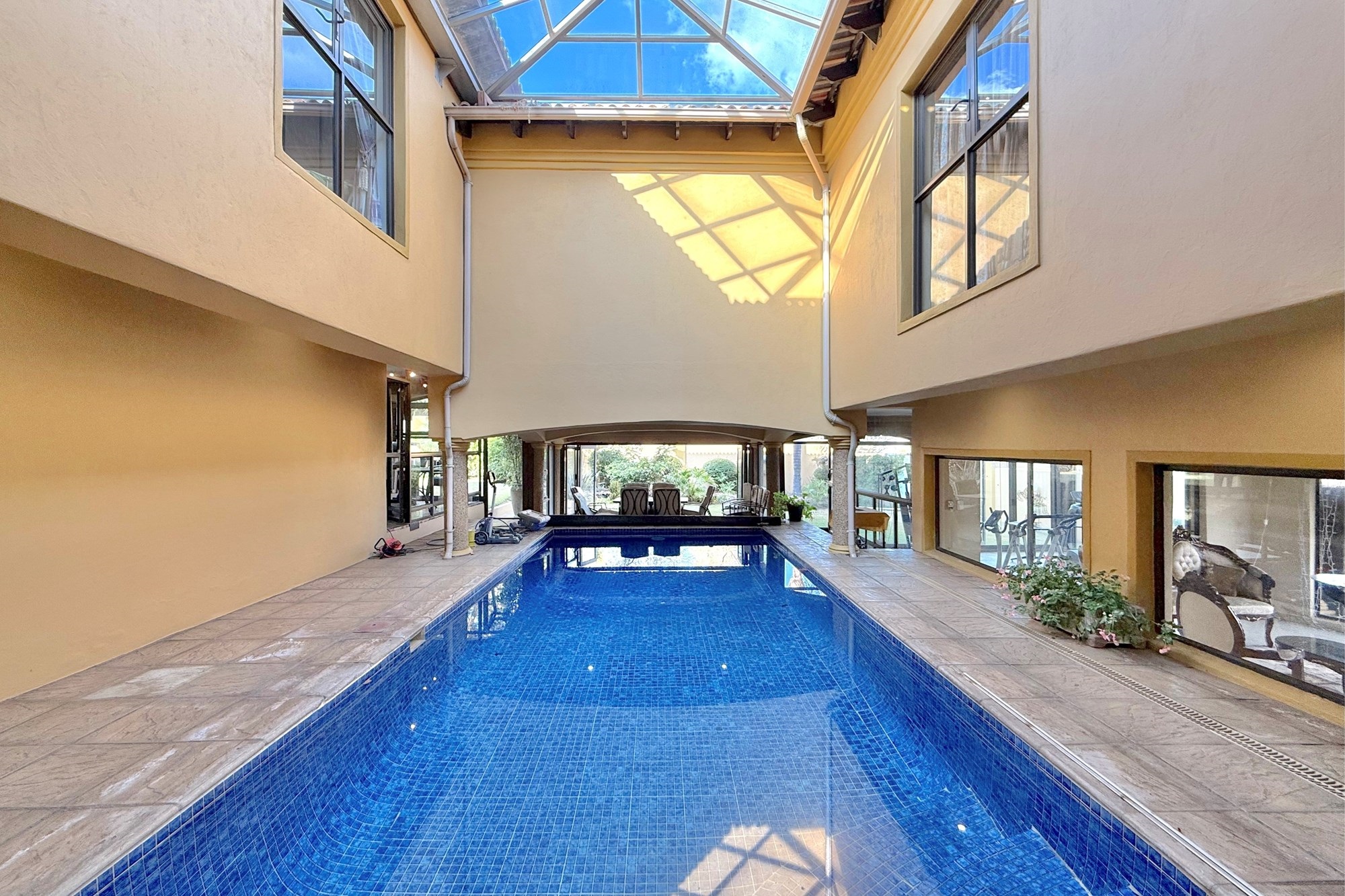 At the heart of the home lies a breath-taking heated indoor pool, seamlessly integrated into the living spaces — the ultimate centrepiece for year-round enjoyment. The open-plan lounge and dining areas flow effortlessly onto the lush garden through sliding doors, while a built-in fireplace adds warmth and ambiance. A sleek bar and versatile indoor/outdoor patio make entertaining both stylish and convenient.