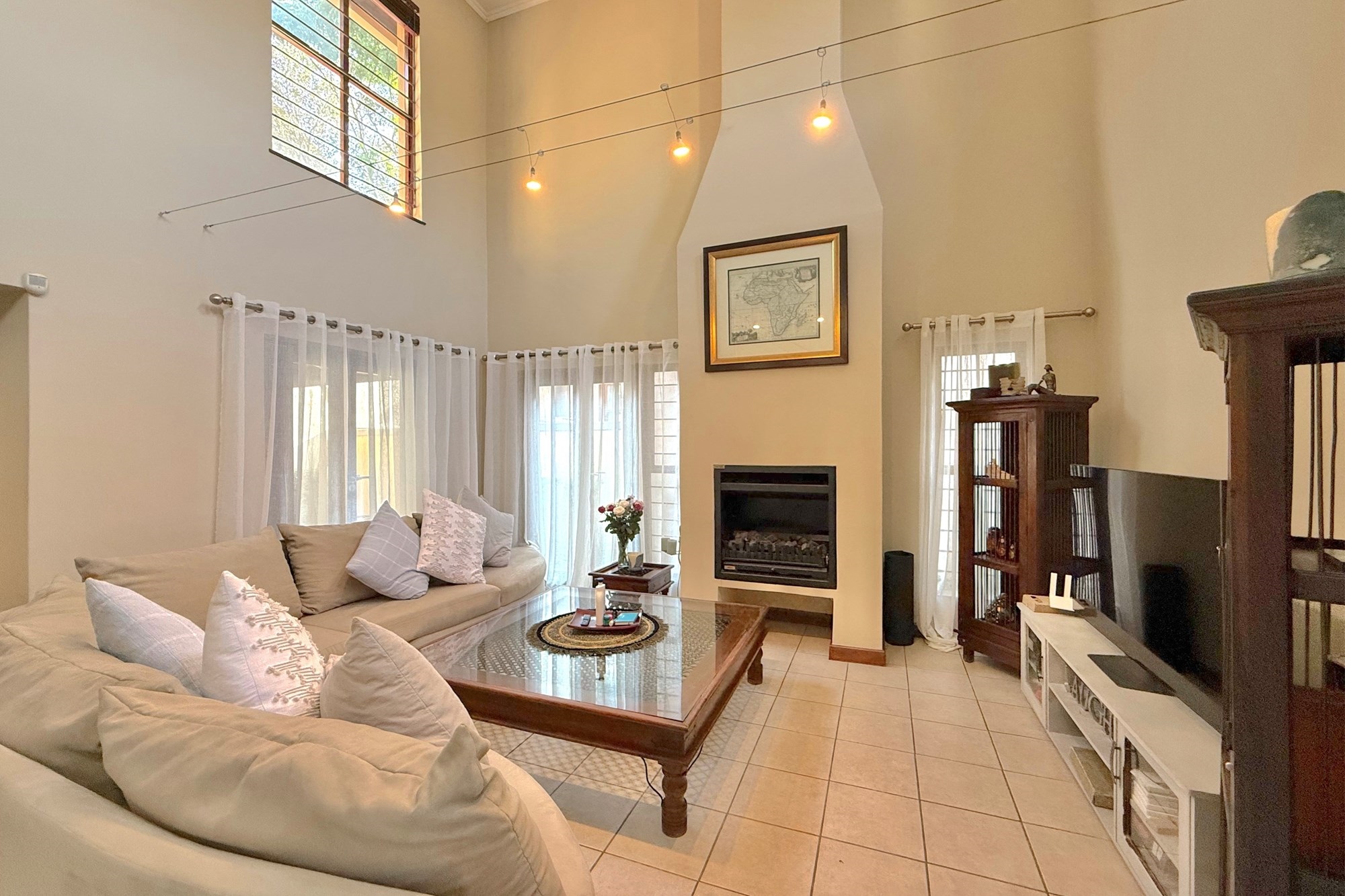 Step inside to a double-volume living space filled with natural light, centred around a contemporary gas fireplace. The flowing layout connects the lounge to a spacious dining area and a modern designer kitchen fitted with stylish cabinetry, space for a single fridge, and one undercounter appliance.