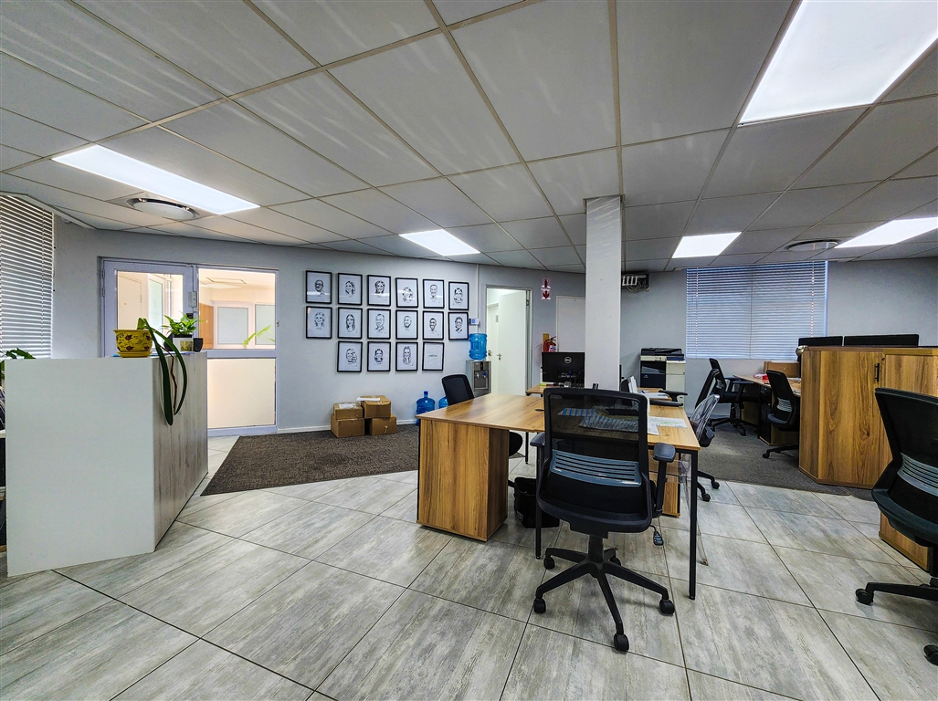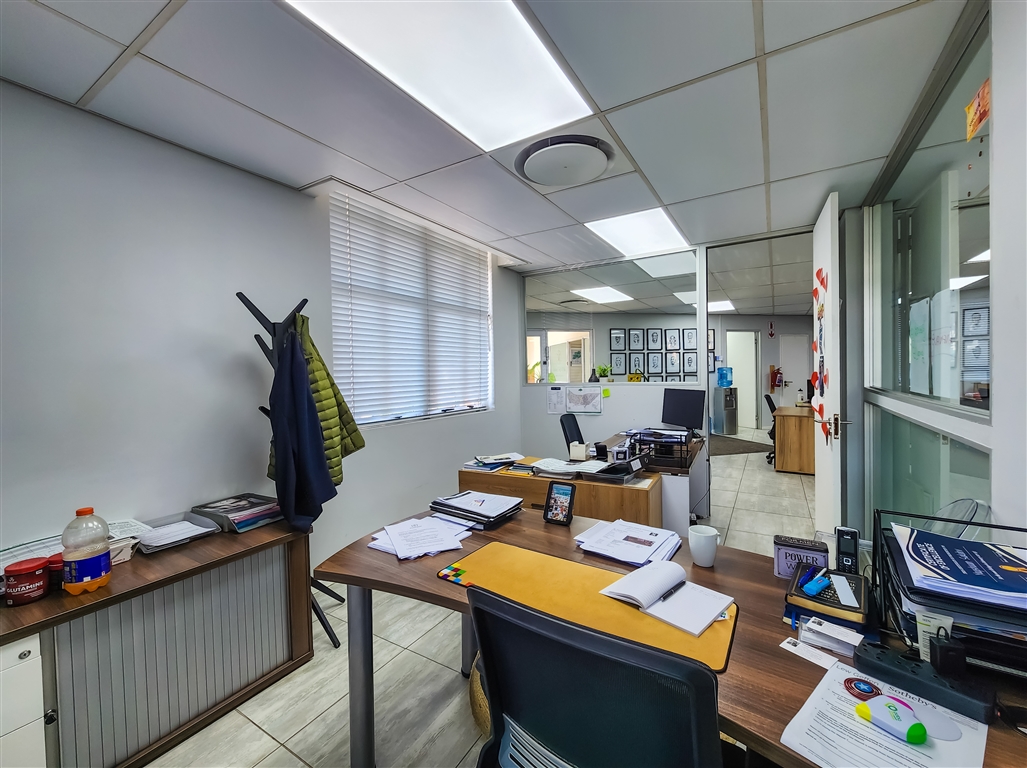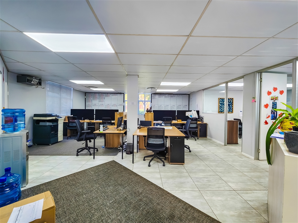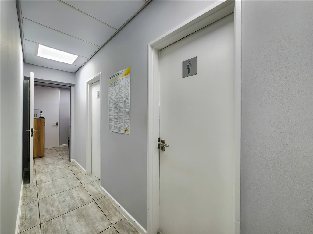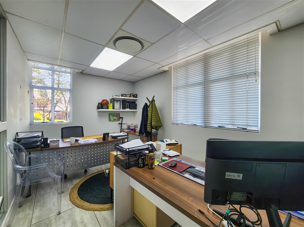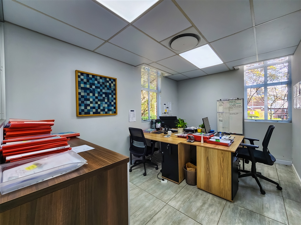 This contemporary ground floor office space to let in Mulberry Hill Office Park in Dainfern offers a bright and inviting working environment, enhanced by an abundance of natural light. The layout features a spacious open-plan area complemented by two private offices, ideal for focused work or executive use. A passage leads to exclusive ladies’ and gents’ restrooms, a fully equipped kitchen and a generously sized boardroom that can comfortably accommodate up to eight people. The boardroom boasts its own private entrance, offering the flexibility to reconfigure the space to include a welcoming reception area flowing into the open-plan office. As the sole unit on the ground floor, this office ensures maximum privacy. The office is tiled throughout, with fitted blinds on all the windows. The building is supported by solar panels, a backup generator and water tanks, ensuring uninterrupted operations and sustainability. 3 shaded and 3 open parknig bays are available at an additional cost. A generator levy of R1 950 is payable monthly.