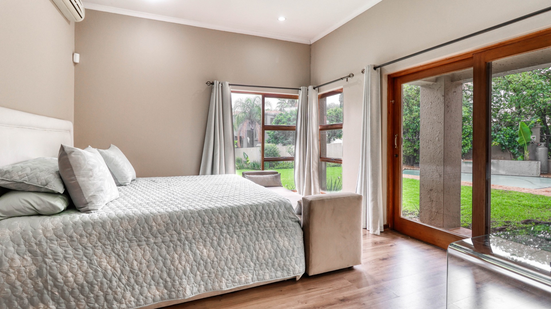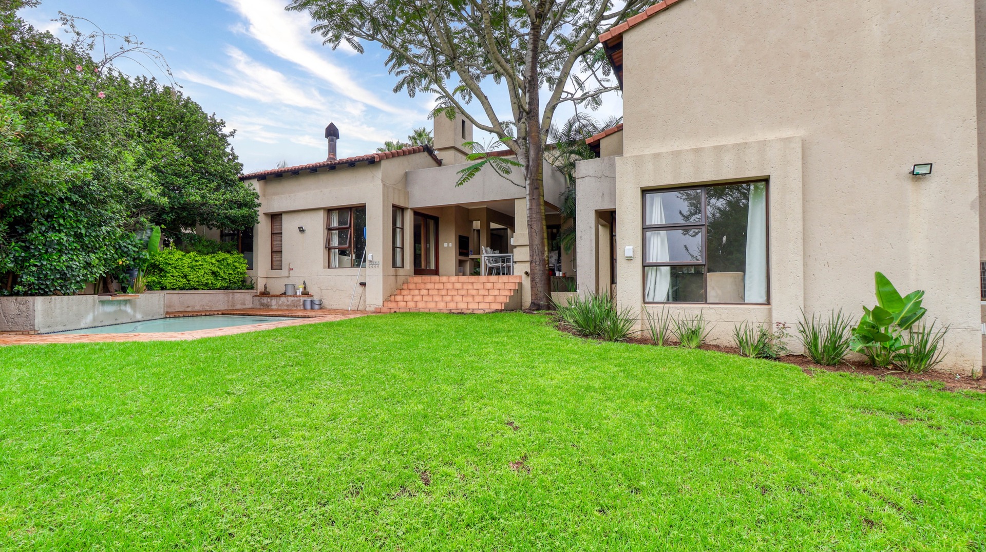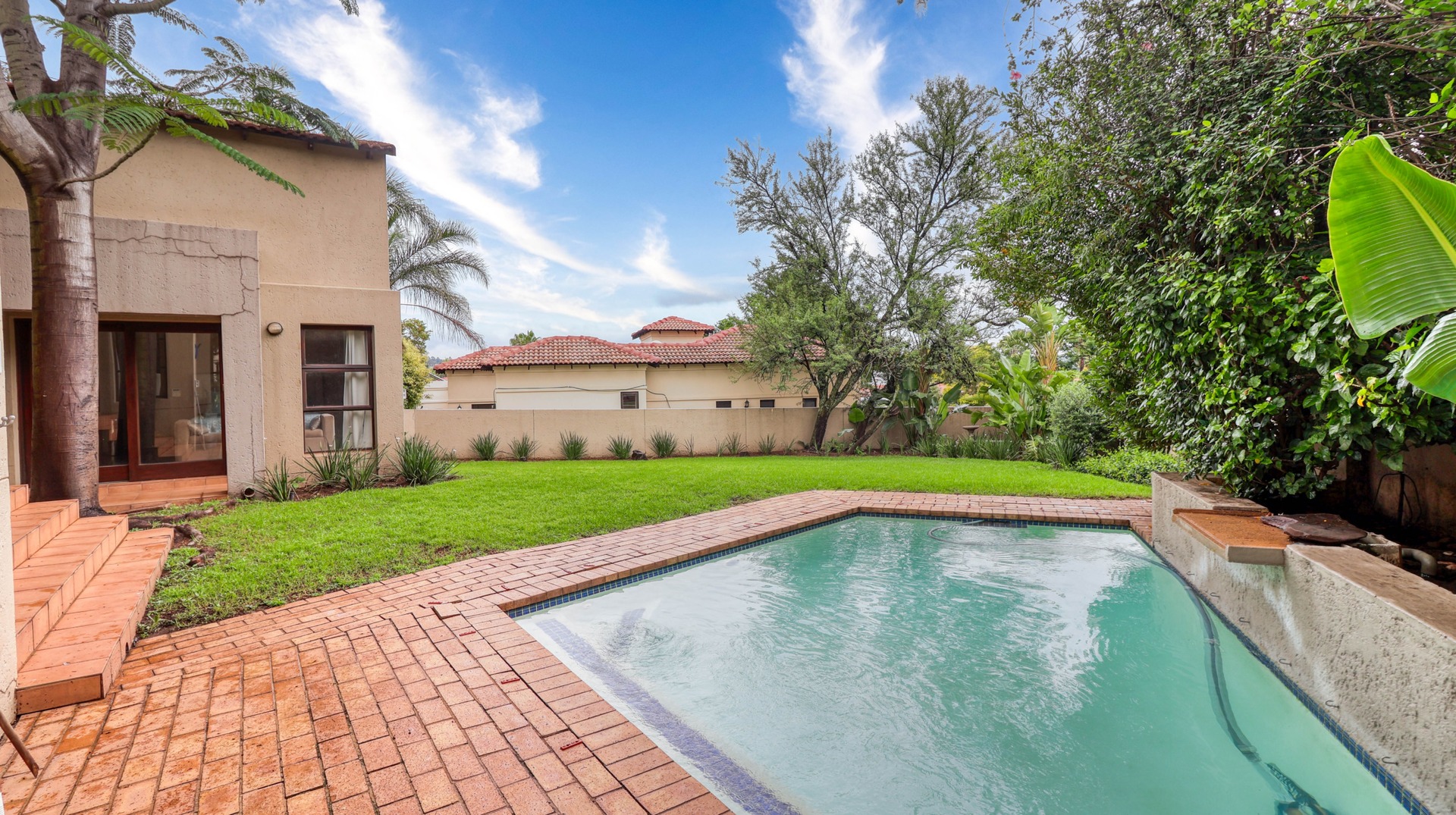 Step out to discover a sunny patio, complete with a built-in barbecue, overlooking an expansive, lush garden and a swimming pool. Double garage, ample parking space, and comfortable staff accommodation.