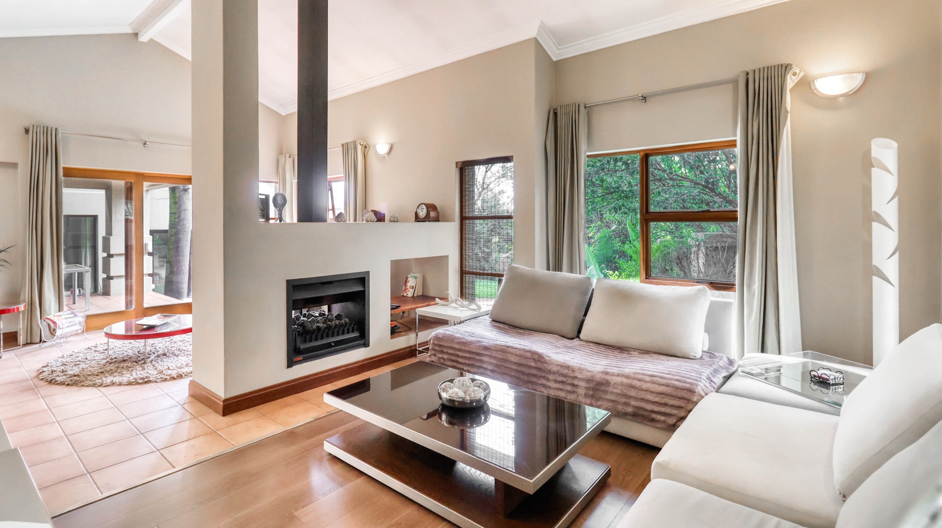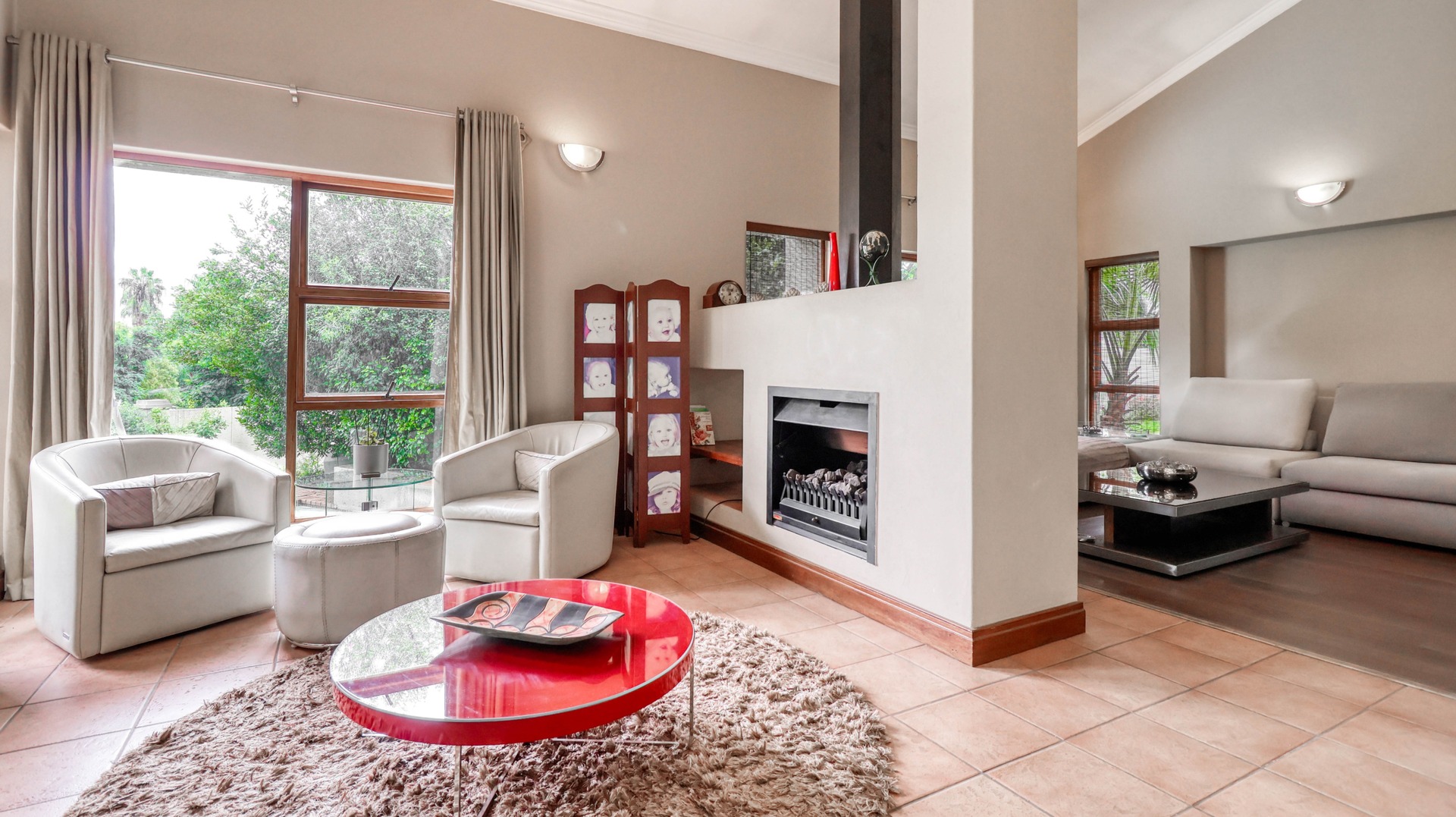 The interior layout is both functional and inviting, with a formal lounge and dining area separated by a dual gas fireplace. A well appointed kitchen with a gas hob and large pantry, and a study nook, perfect for remote work, adds to the home's practicality.