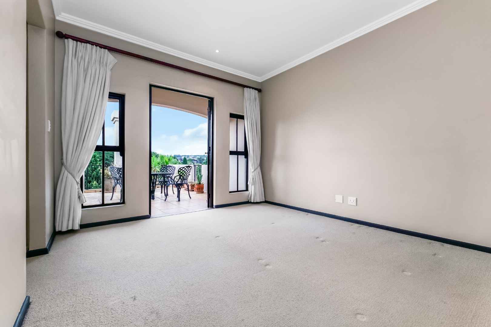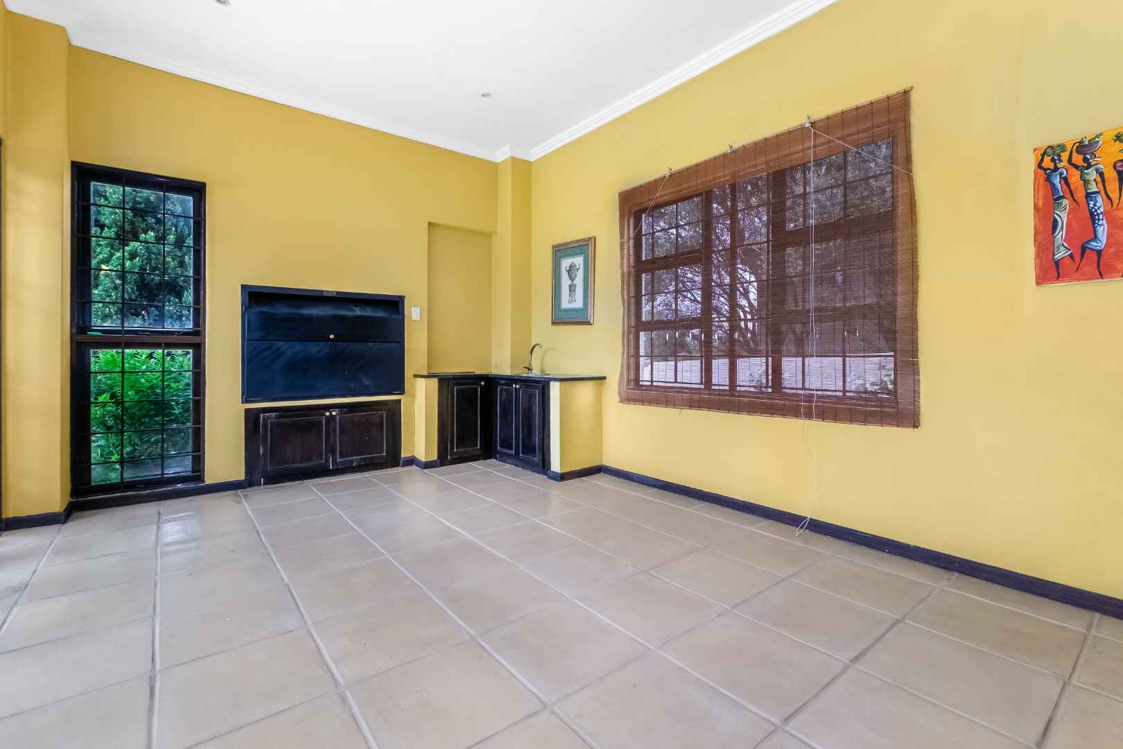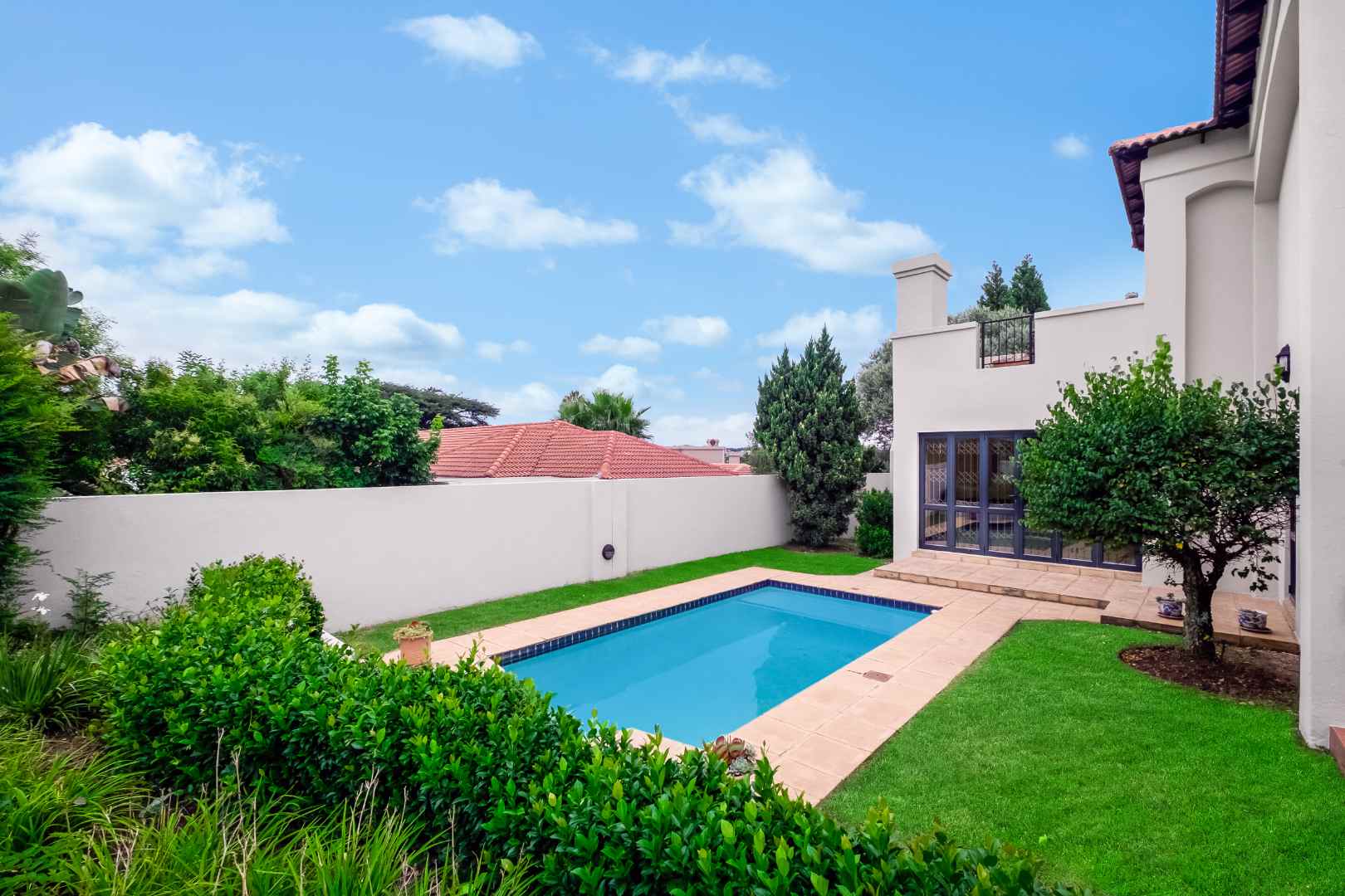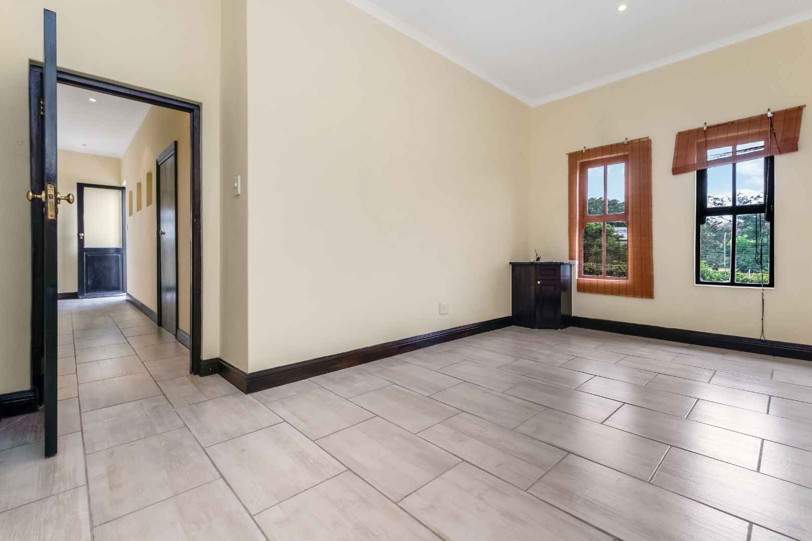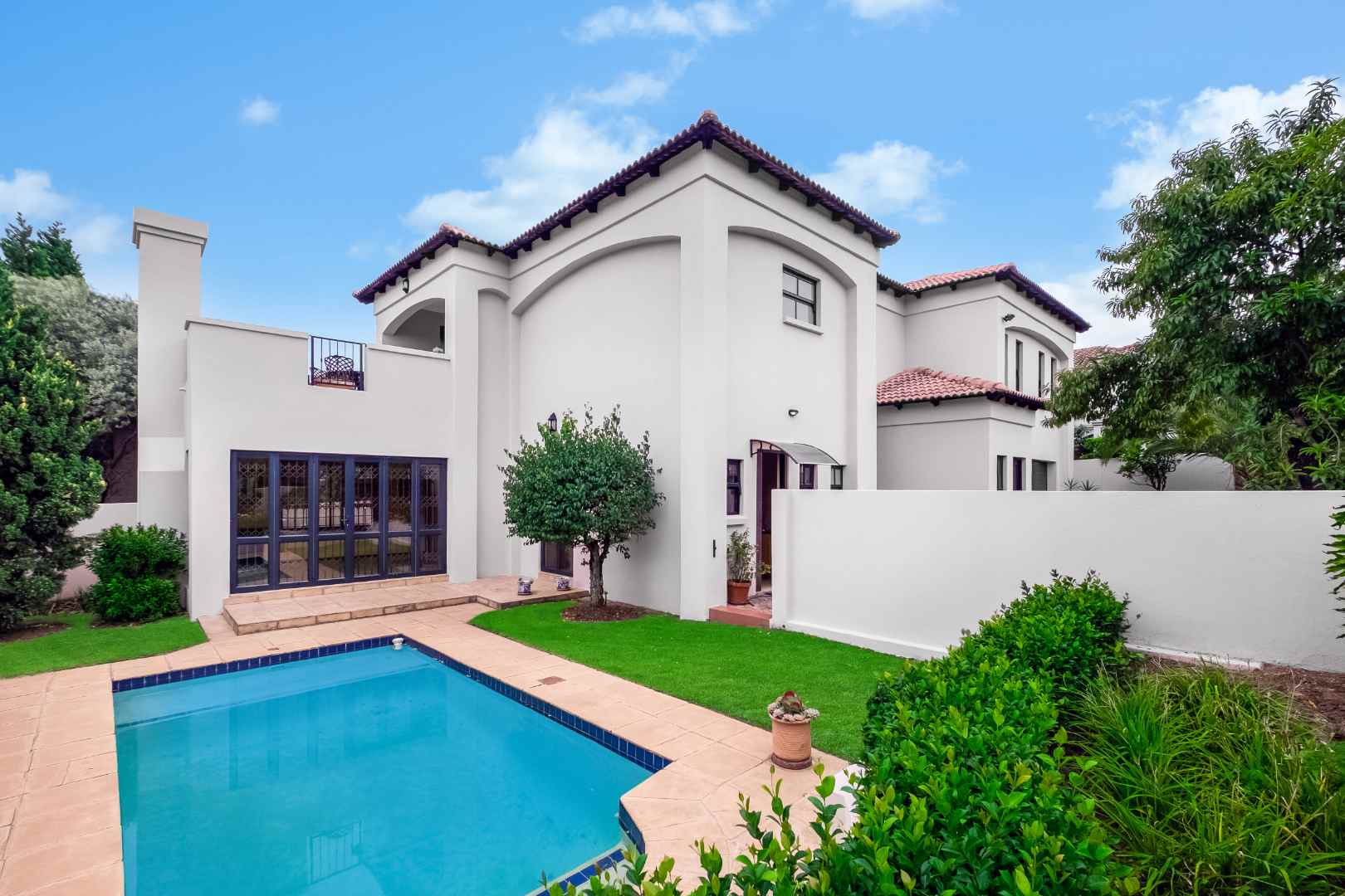 This 3-bedroom home has spacious garden, ample parking and sweeping driveway. The entrance hall welcomes you into this family home; to the left are 2 receptions rooms: dining room and lounge and to the right an additional lounge which opens onto an enclosed patio with views of the swimming pool. The country style kitchen has granite counter tops, maple wood cupboards, electric hob and oven with a separate scullery area. Upstairs are 3 sunny bedrooms, 2 bathrooms, 1 en-suite. The main bedroom opens onto a sunny expansive balcony with lovely views of the estate. In addition, there is a separate wing with its own entrance comprising 2 rooms, with a shared common area and bathroom, an ideal space for an office, flatlet or excellent double staff accommodation. Available Mid-February, rent excludes estate levy, weekly pool & garden service, and all utilities.