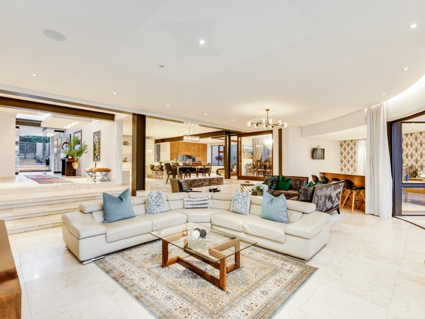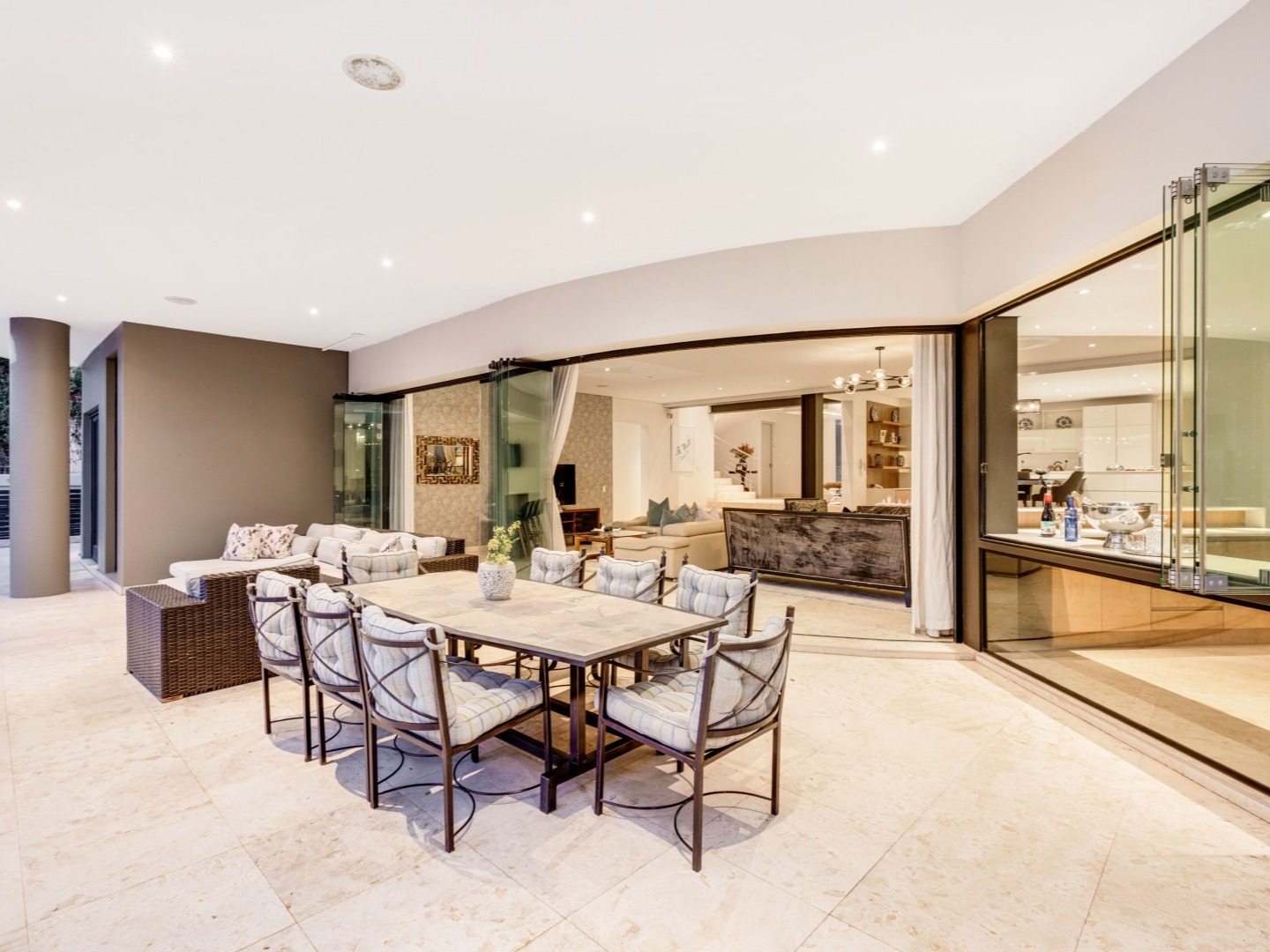 The gated driveway leads to the pivoted glass front door with a fountain feature opening into the double-volume foyer. Generous living areas enjoy great views and flow to an expansive outdoor terrace. Designed over three levels, the ground floor consists of a beautiful open plan living space with a private dining room set behind glass walls, a comfortable lounge featuring a gas fireplace, and a state-of-the-art upgraded kitchen that has integrated appliances and two Smeg ovens. The lovely patio presides over the rim flow pool and garden, adding to the charm and luxurious living spaces whilst offering a relaxed ambiance with views across the infinity pool and river valley. A cocktail bar services the patio through a serving hatch with stack-back glass doors, and there is a gas braai.