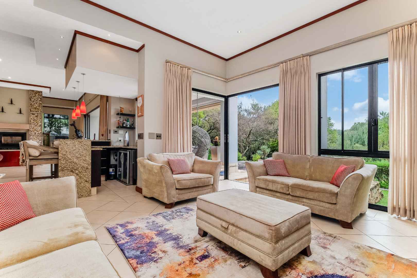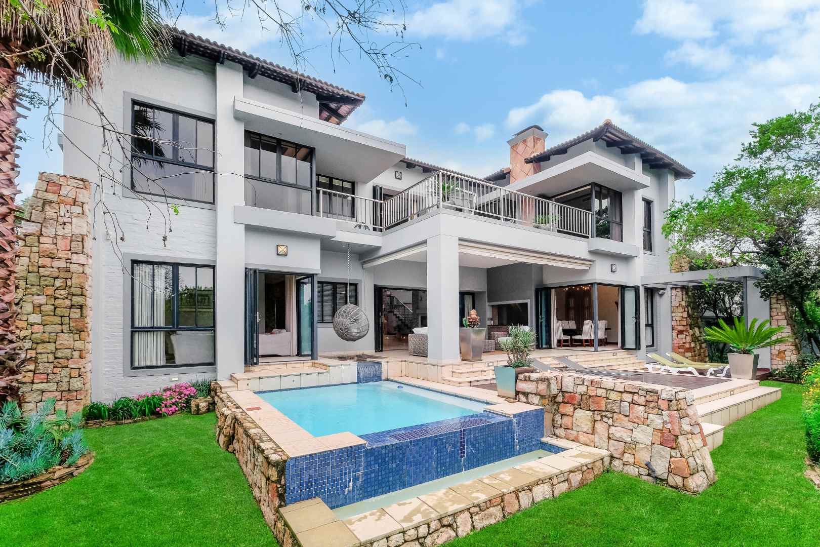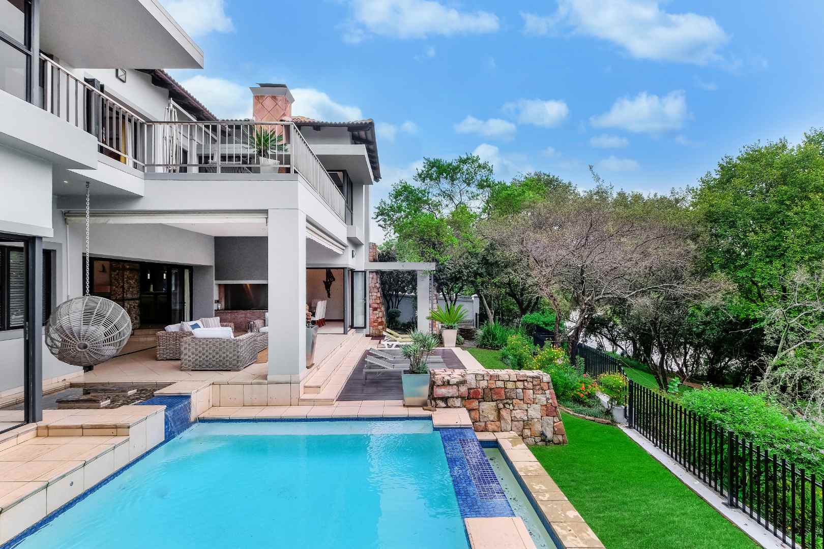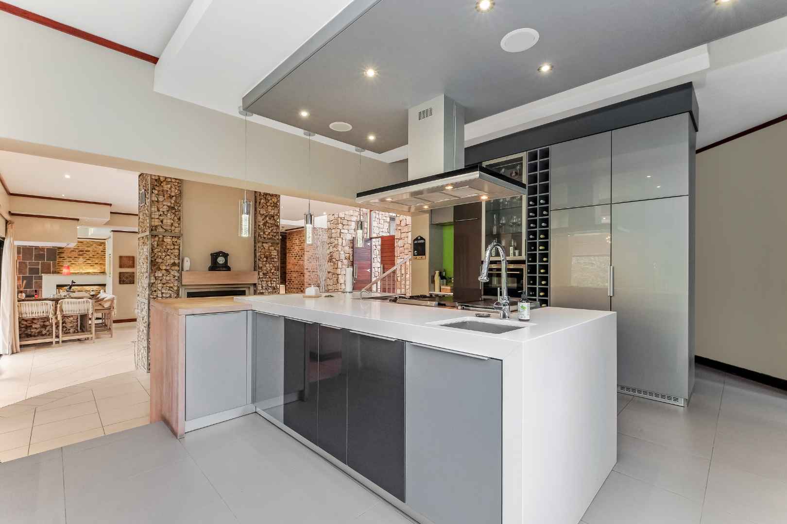 This home was built for entertainment: the double volume entrance hall with spectacular water feature welcomes you. Walk down a few steps into the open plan reception areas with double-sided Morso fireplace, family room, lounge, cocktail bar. This living area is designed for comfort, with stack-back doors opening onto large, covered patio, sparkling rim-flow pool, which is heated and wooden deck area. There is a separate boma area to sit around at night to enjoy the Africa sunsets and sundowners.