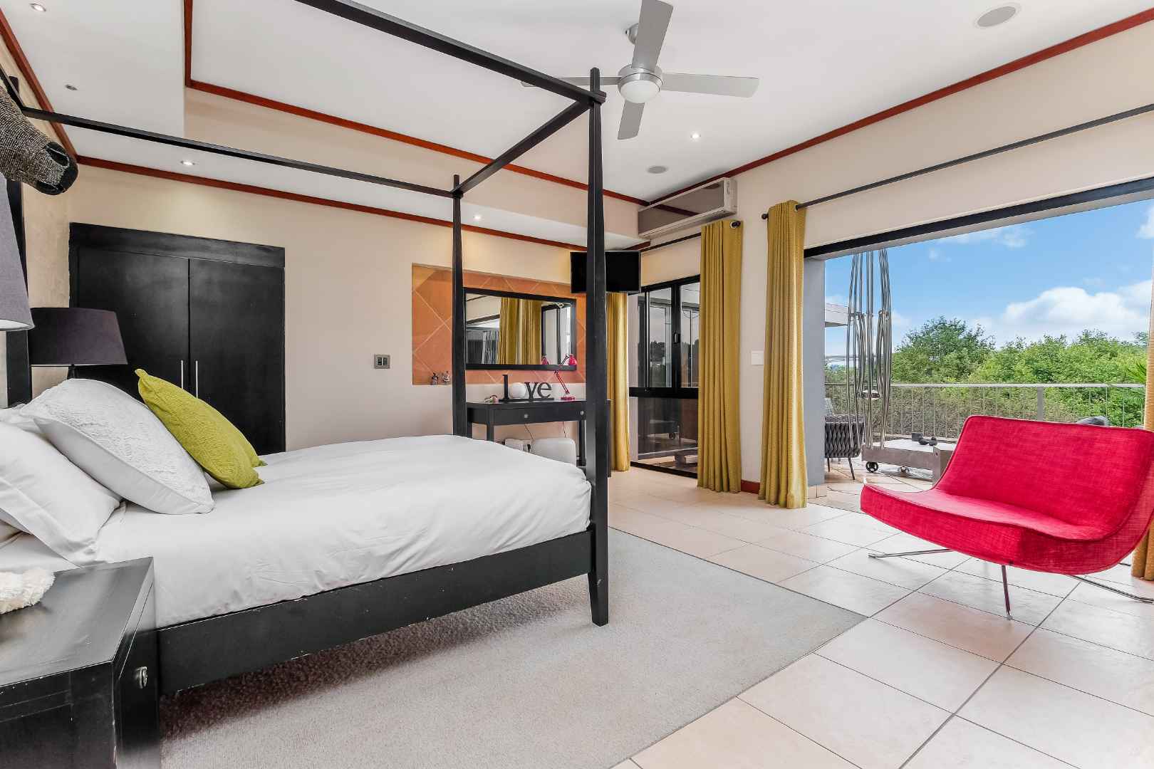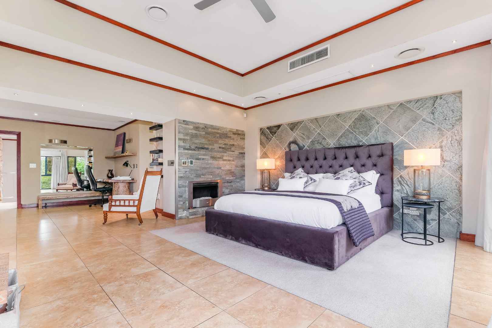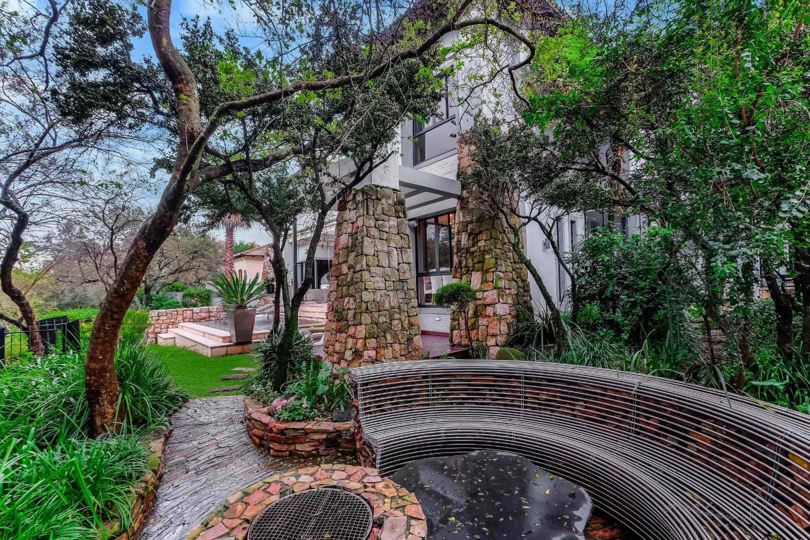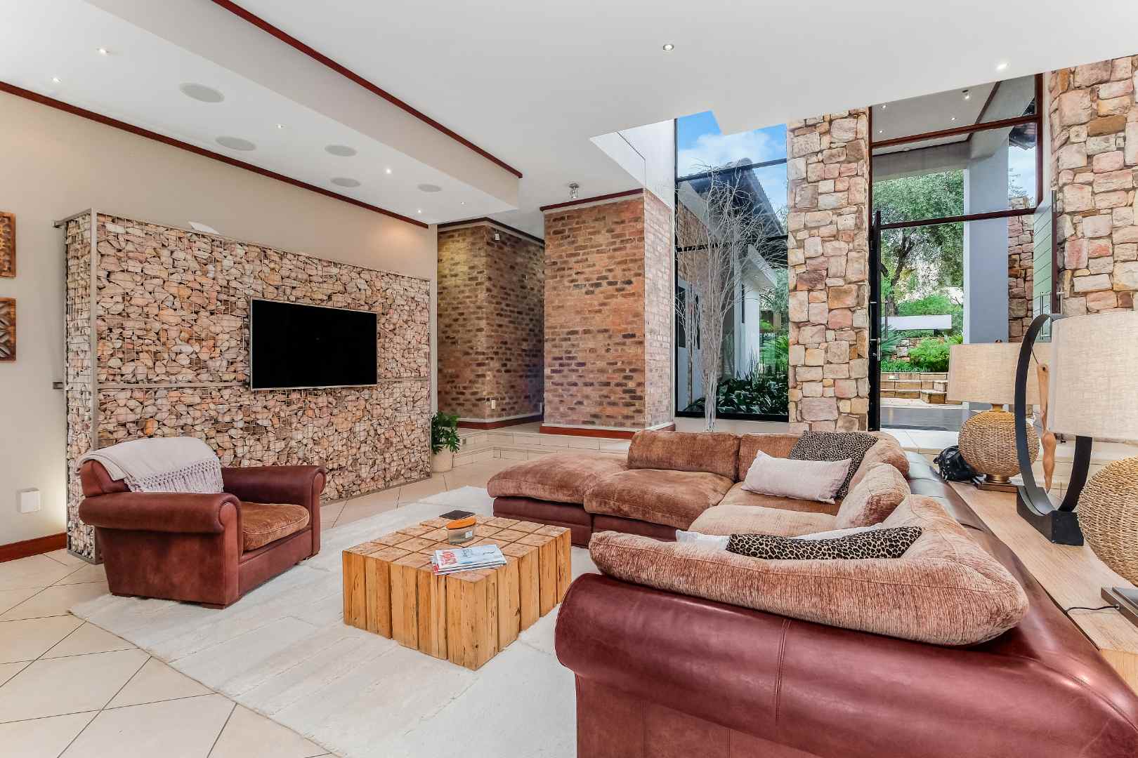 This home was built for entertainment: the double volume entrance hall with spectacular water feature welcomes you. Walk down a few steps into the open plan reception areas with double-sided Morso fireplace, family room, lounge, cocktail bar. This living area is designed for comfort, with stack-back doors opening onto large, covered patio, sparkling rim-flow pool, which is heated and wooden deck area. There is a separate boma area to sit around at night to enjoy the Africa sunsets and sundowners.