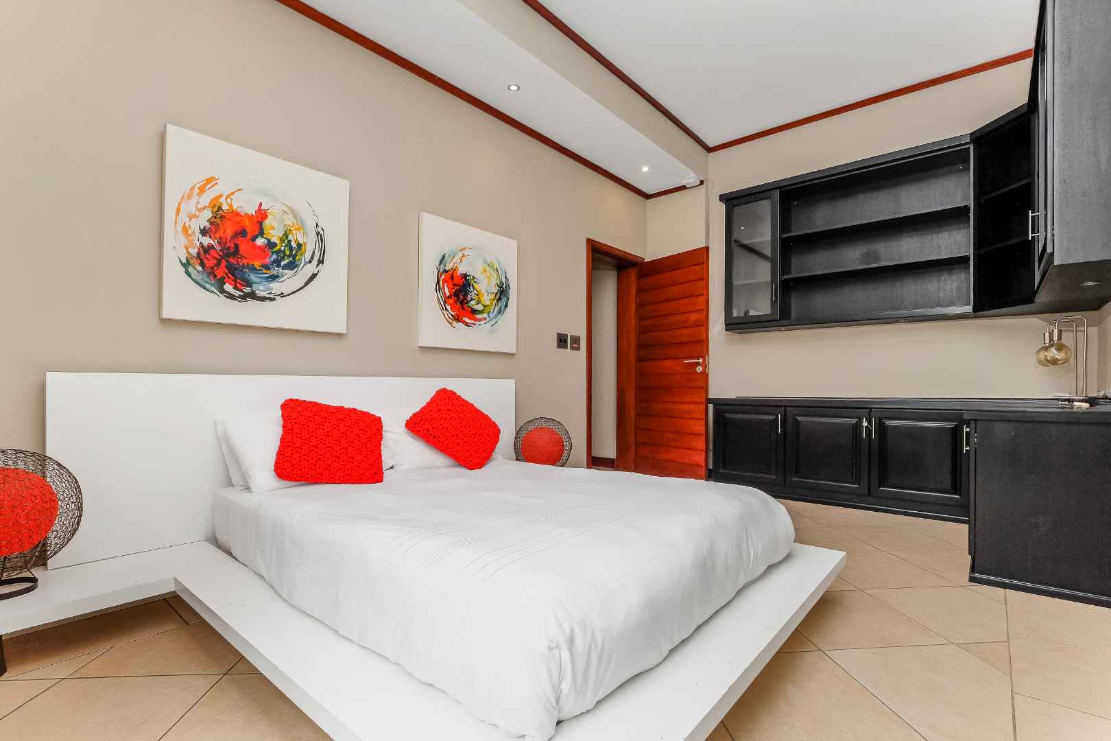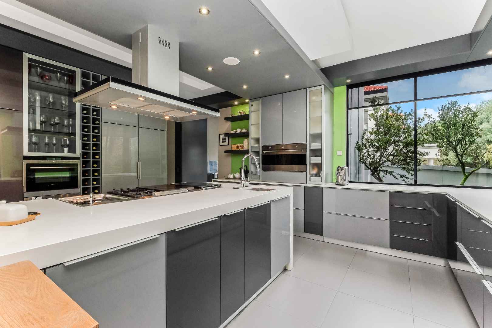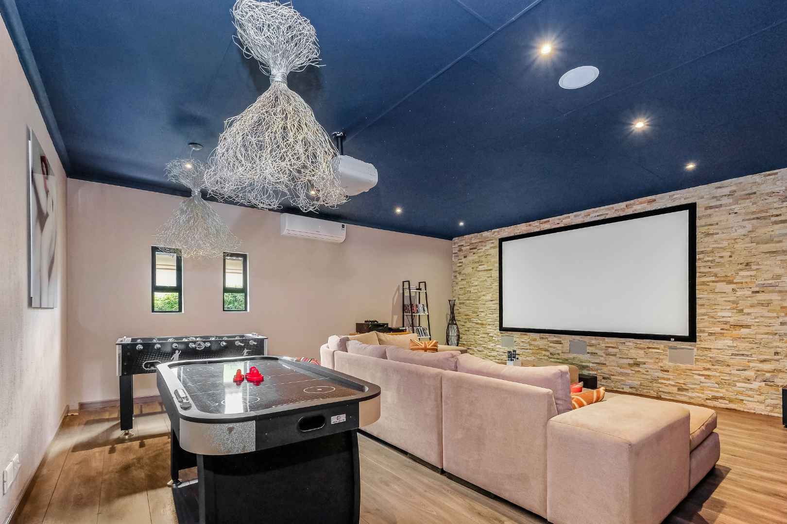 The ultra-modern kitchen is a Chef’s delight, having integrated appliances, Caesar stone tops, high gloss cupboards, wine fridge, centre island with combination of gas hob and grill. Smeg oven, breakfast bar, walk-in pantry cupboard, and a separate scullery / laundry area. Adjacent to the kitchen is the dining room which also opens onto the patio. The downstairs floor plan also includes a fitted study or 5th bedroom, guest bedroom en-suite plus a private cinema & games room the perfect spot for the family to spend time together.