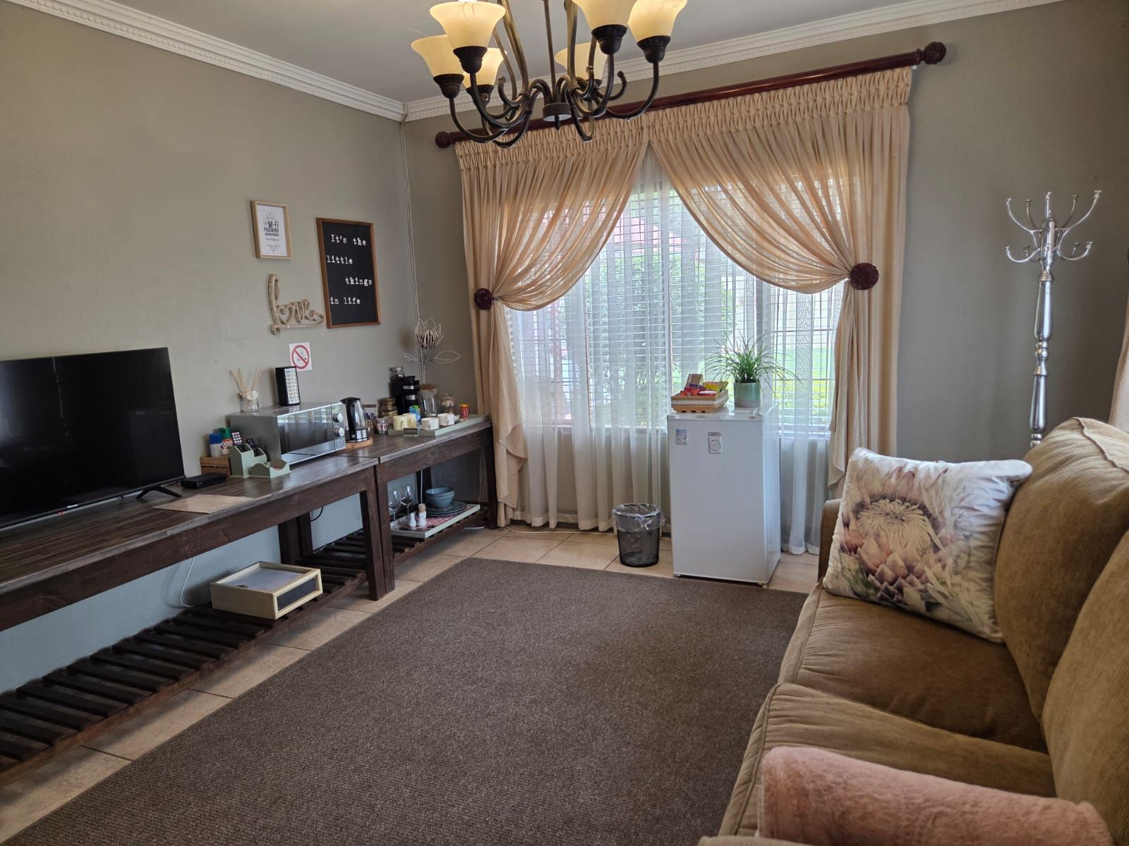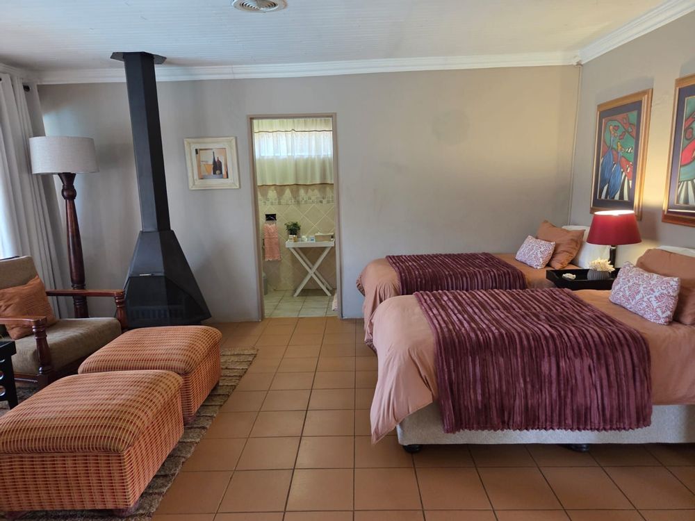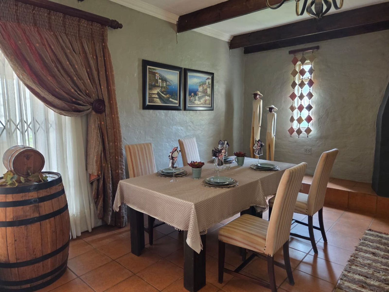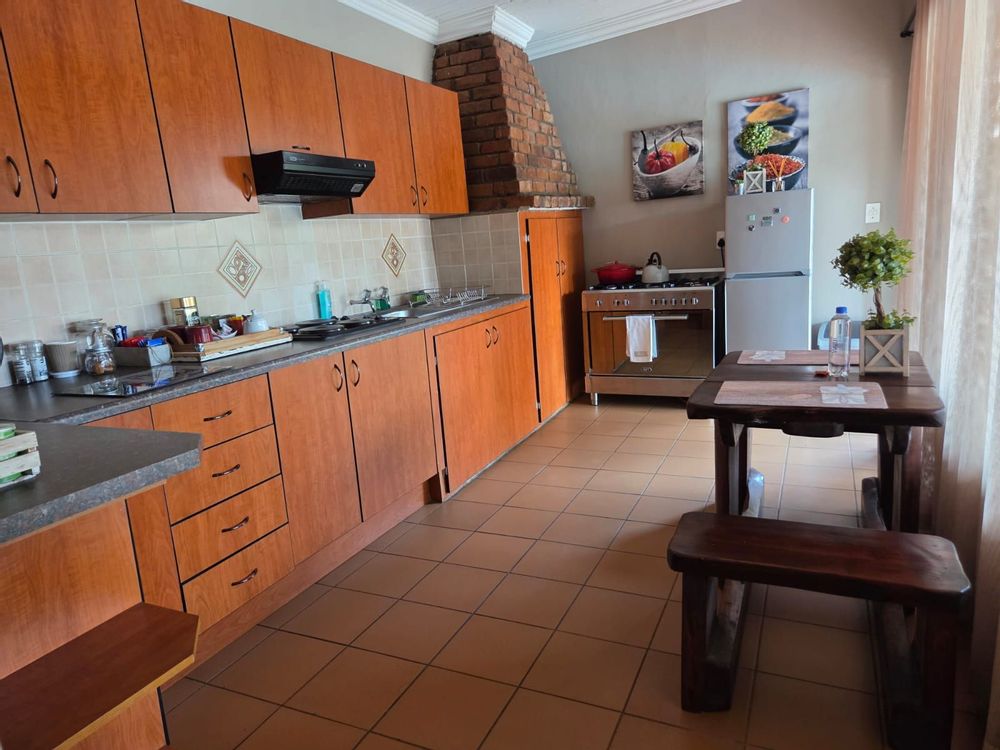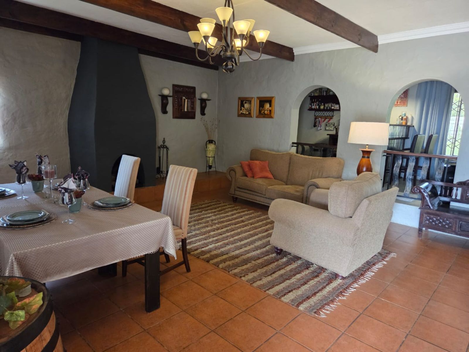 The spacious main residence features four carpeted bedrooms with sliding doors fitted with Trellidor burglar bars, two air-conditioning units, and four ceiling fans. The home includes two full bathrooms, a guest toilet, and multiple living areas. A welcoming lounge with a gas fireplace, a study room, a ladies bar with built-in braai and gas, and a TV room with underfloor heating offer ample relaxation space. The dining room flows into a large country-style kitchen, complete with granite countertops, a full gas stove and oven, and a pantry. Additional conveniences include a laundry room and staff quarters.