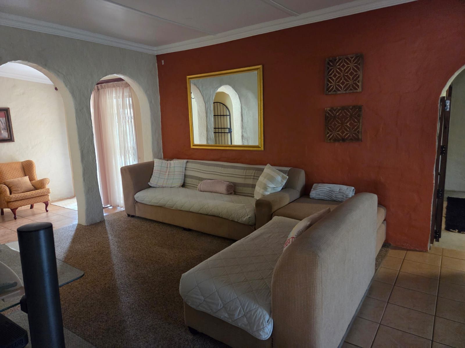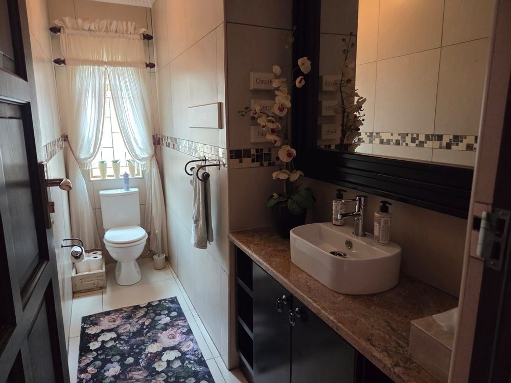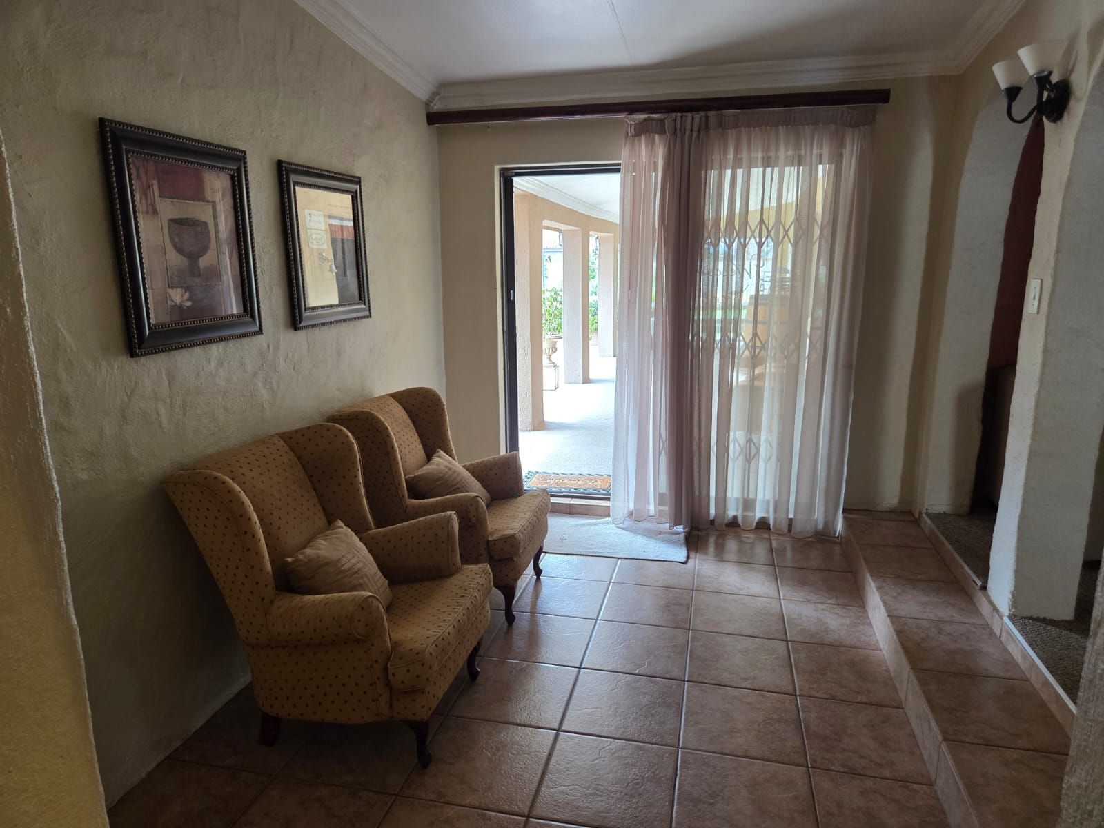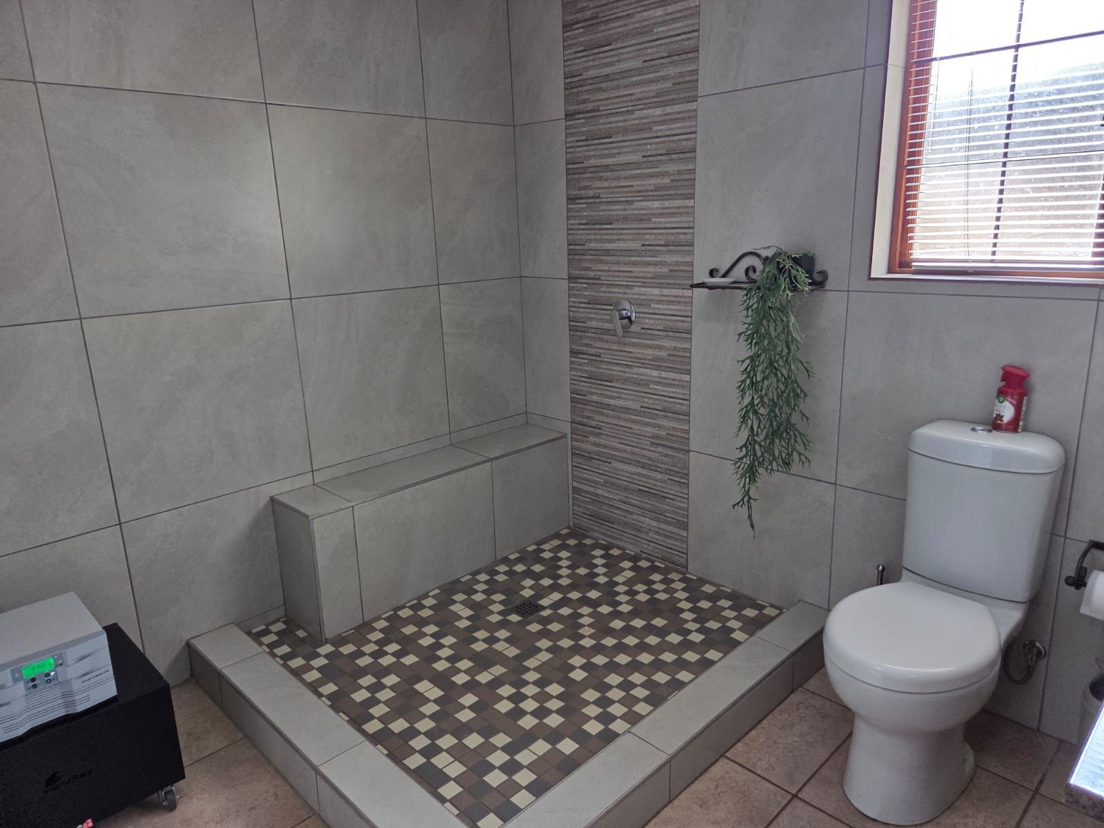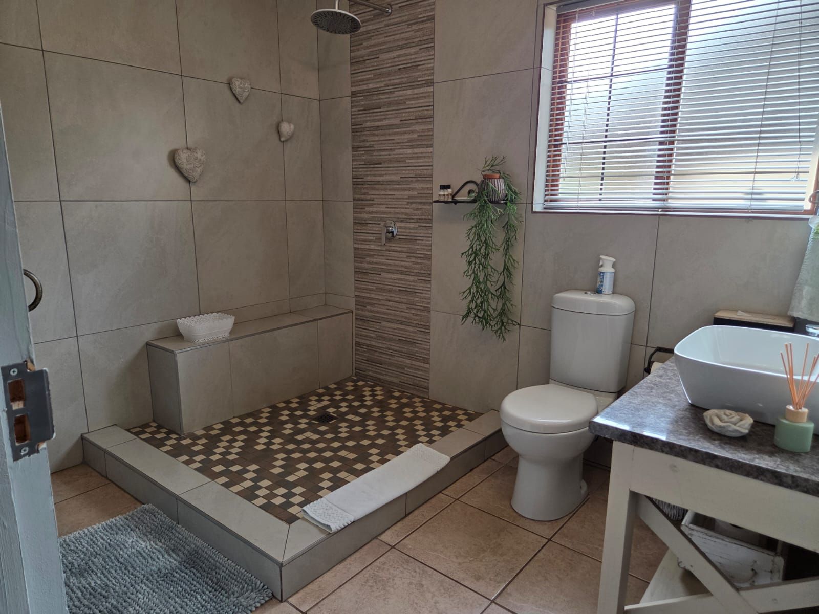 The spacious main residence features four carpeted bedrooms with sliding doors fitted with Trellidor burglar bars, two air-conditioning units, and four ceiling fans. The home includes two full bathrooms, a guest toilet, and multiple living areas. A welcoming lounge with a gas fireplace, a study room, a ladies bar with built-in braai and gas, and a TV room with underfloor heating offer ample relaxation space. The dining room flows into a large country-style kitchen, complete with granite countertops, a full gas stove and oven, and a pantry. Additional conveniences include a laundry room and staff quarters.