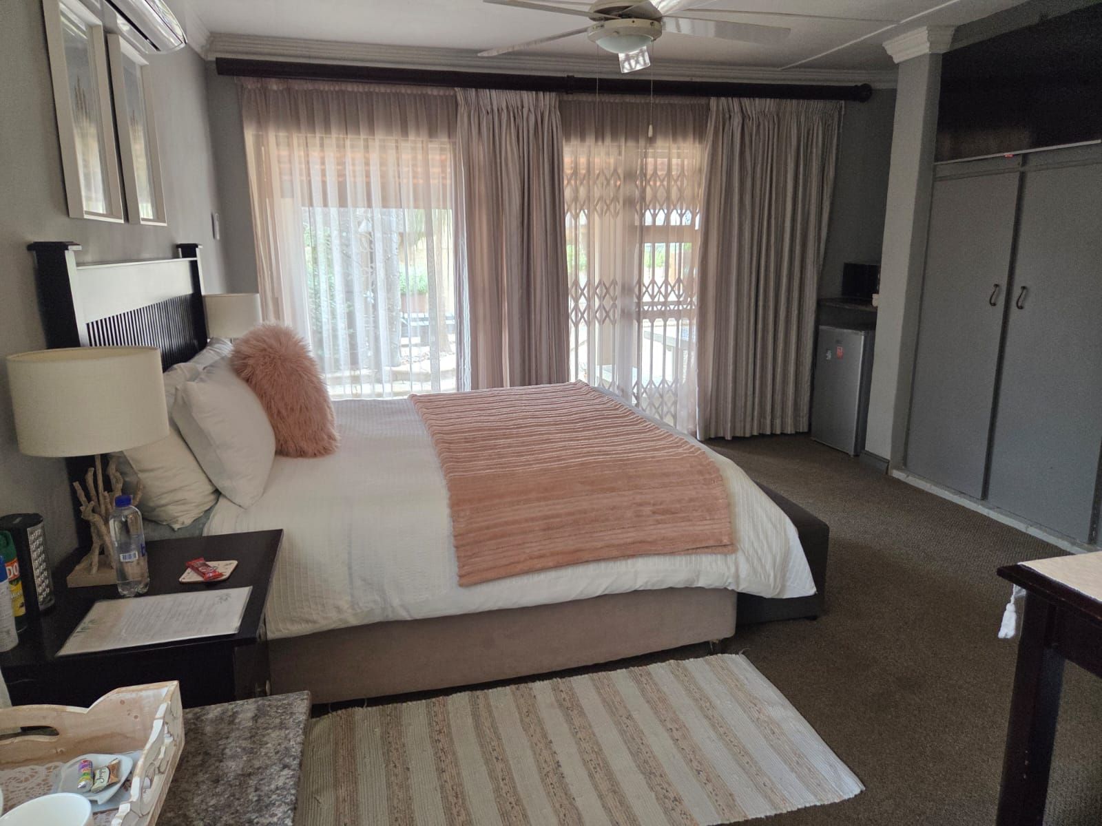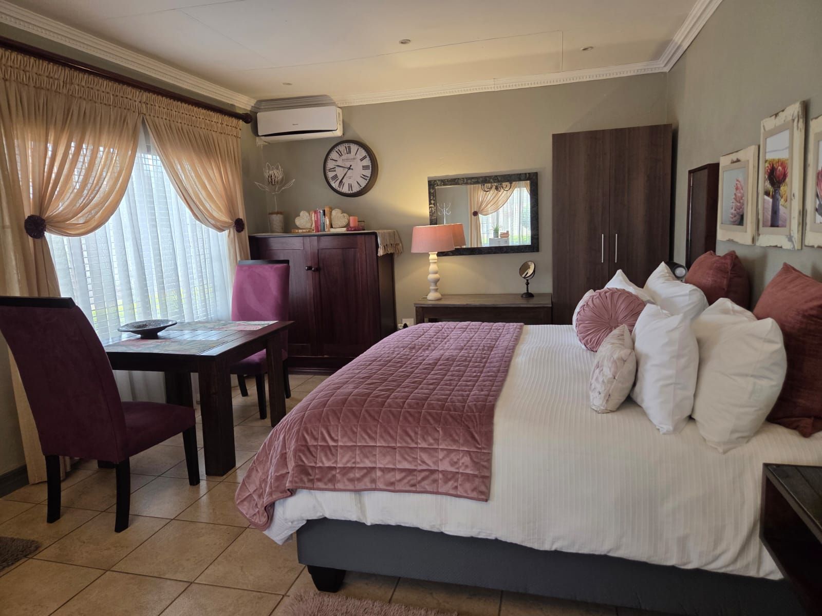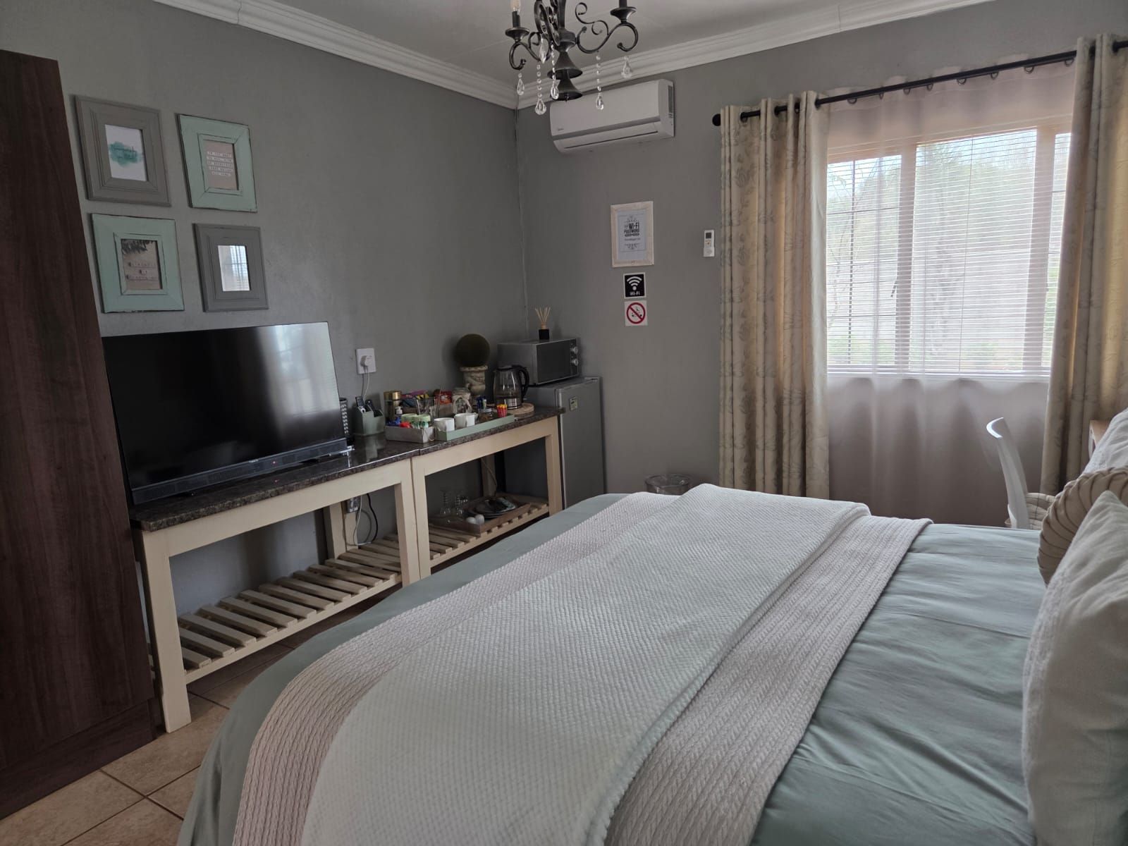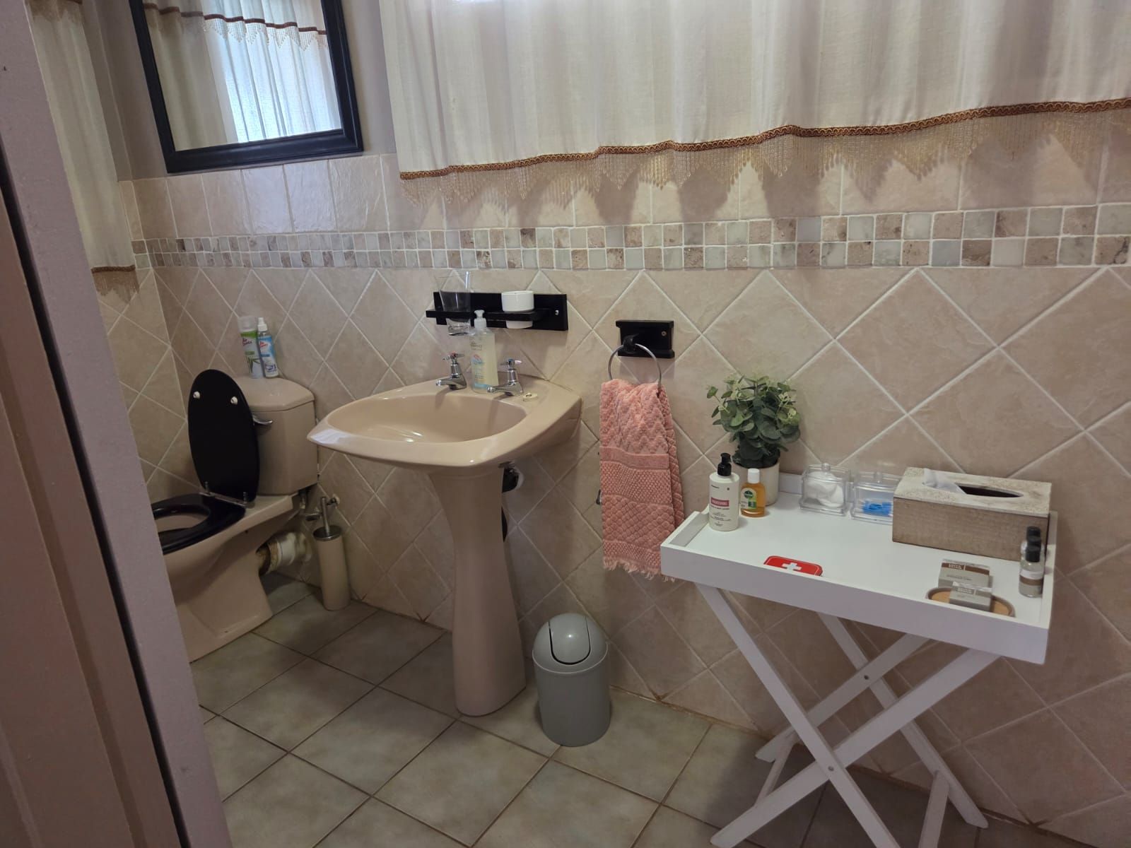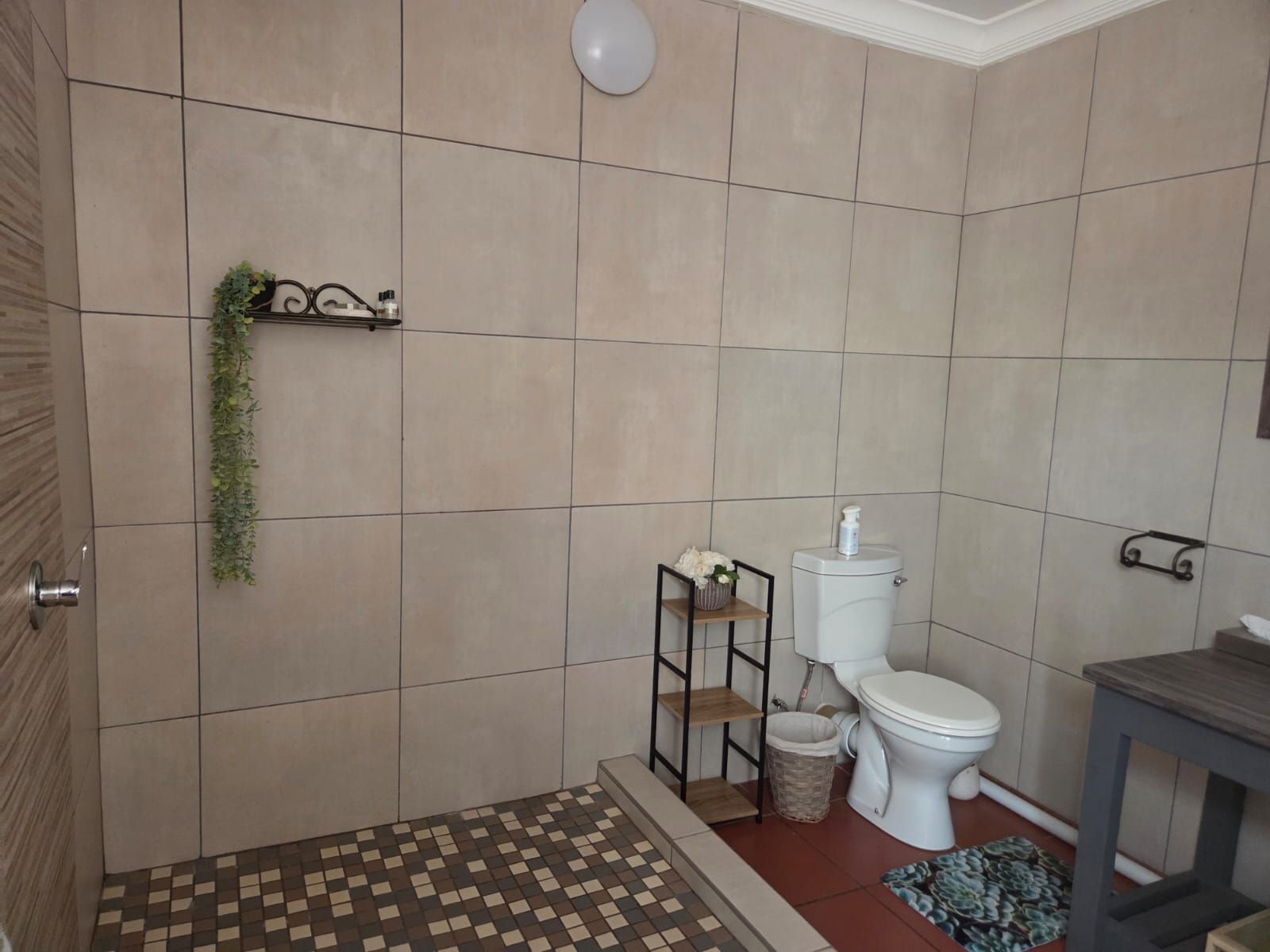 The spacious main residence features four carpeted bedrooms with sliding doors fitted with Trellidor burglar bars, two air-conditioning units, and four ceiling fans. The home includes two full bathrooms, a guest toilet, and multiple living areas. A welcoming lounge with a gas fireplace, a study room, a ladies bar with built-in braai and gas, and a TV room with underfloor heating offer ample relaxation space. The dining room flows into a large country-style kitchen, complete with granite countertops, a full gas stove and oven, and a pantry. Additional conveniences include a laundry room and staff quarters.