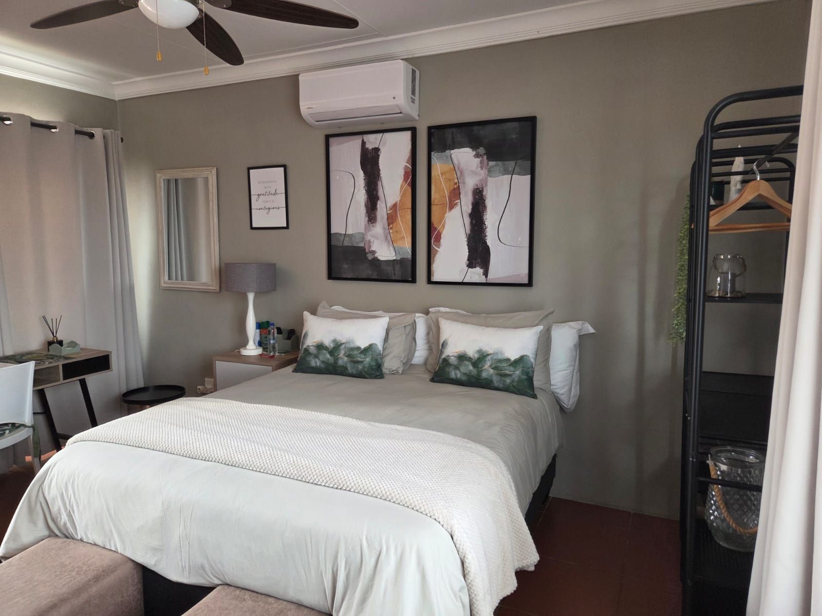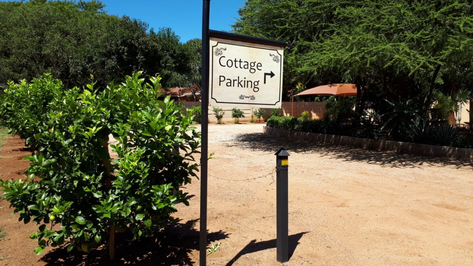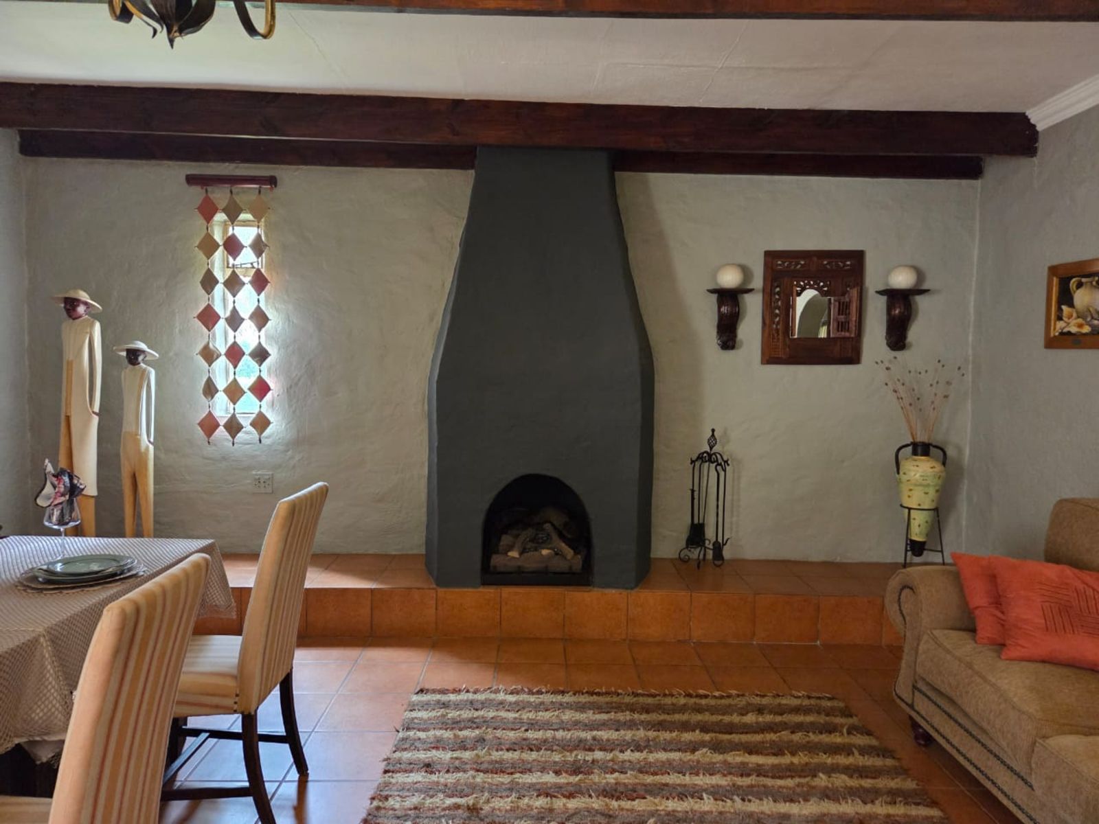 The charming cottage includes a fully equipped kitchen, a cozy living area with a fireplace, a bedroom with air conditioning, and a bathroom (shower). A covered patio leads to a private garden and braai area, with private covered parking for two vehicles.