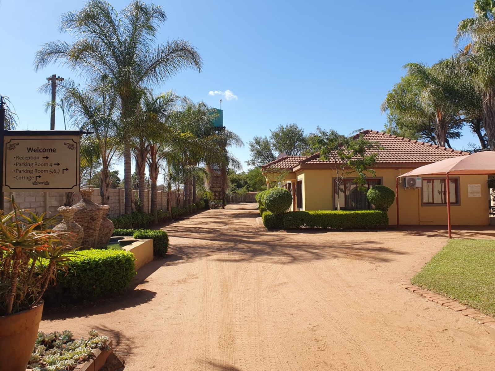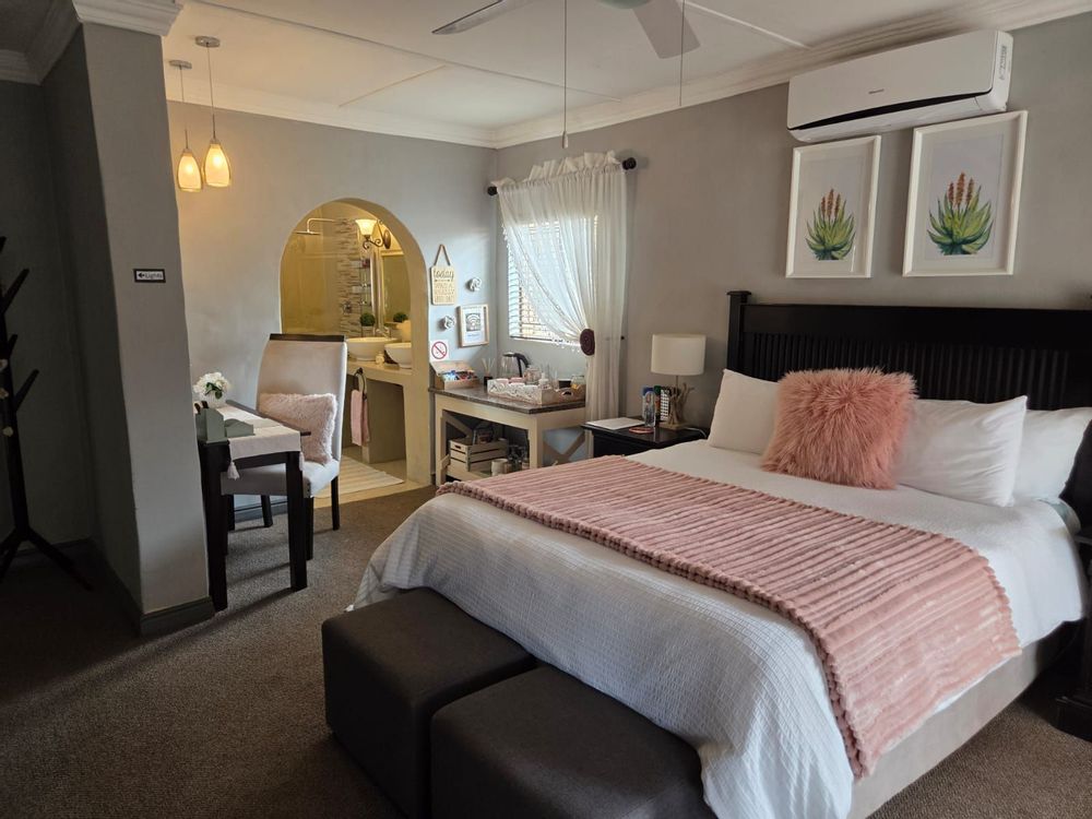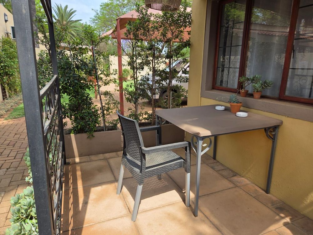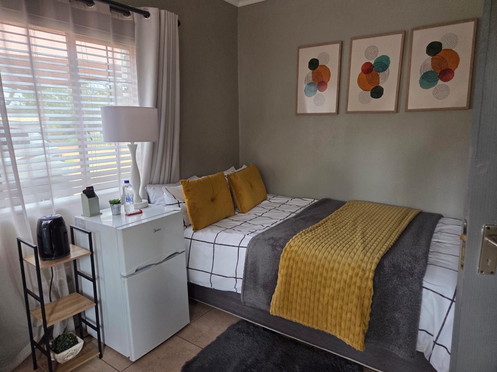The charming cottage includes a fully equipped kitchen, a cozy living area with a fireplace, a bedroom with air conditioning, and a bathroom (shower). A covered patio leads to a private garden and braai area, with private covered parking for two vehicles.