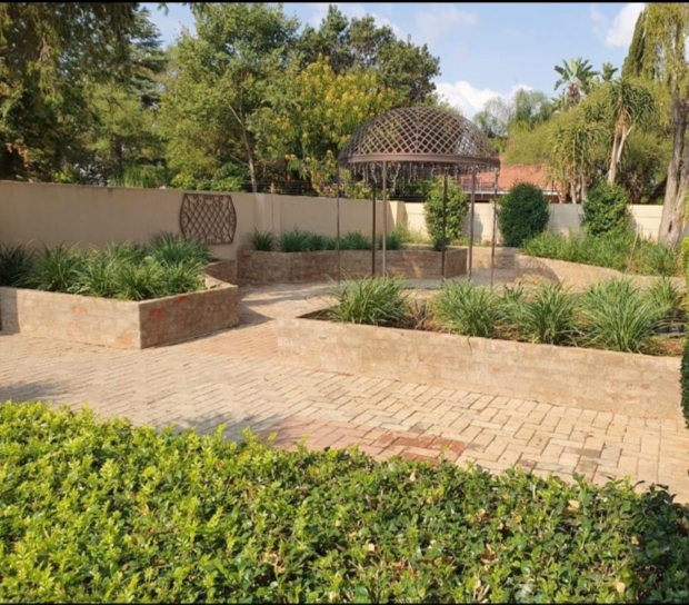The spacious main residence offers four carpeted bedrooms, each with sliding doors fitted with Trellidor burglar bars. Comfort is ensured with two air-conditioning units and four ceiling fans. The home includes two full bathrooms, a guest toilet, and multiple inviting living areas, welcoming lounge with a gas fireplace, study room, ladies’ bar with built-in braai and gas facilities, TV room with underfloor heating.