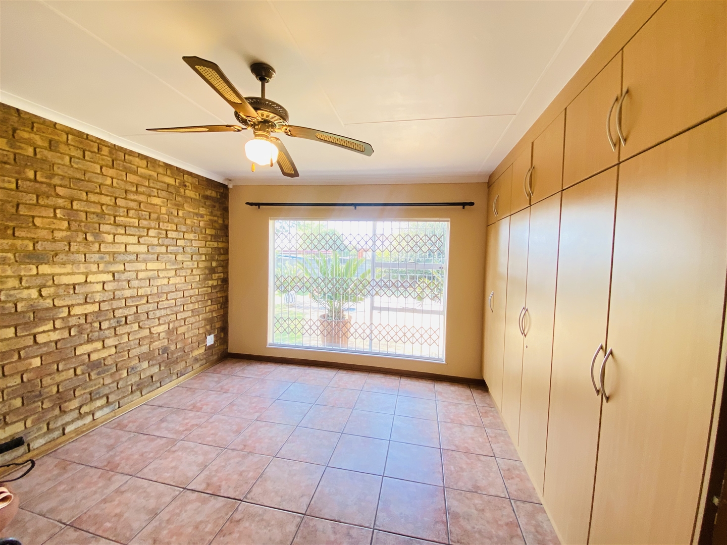 The entrance hall welcomes you into the home, leading you to a guest lounge with laminated flooring and a separate dining area. The kitchen is equipped with a granite top, double oven, stove, and extractor fan, and the scullery offers ample space for your appliances. The breakfast nook features a sliding door that leads to a patio, creating a perfect spot for outdoor dining. The TV room and passage lead to the main bathroom, which includes a shower and bathtub. There are two bedrooms with built-in cupboards and laminated flooring, while the main bedroom boasts his and her built-in cupboards and a full en-suite bathroom. The entertainment area is a highlight of this home, featuring a braai area with a kitchenette and a lounge for watching sports or entertaining guests.