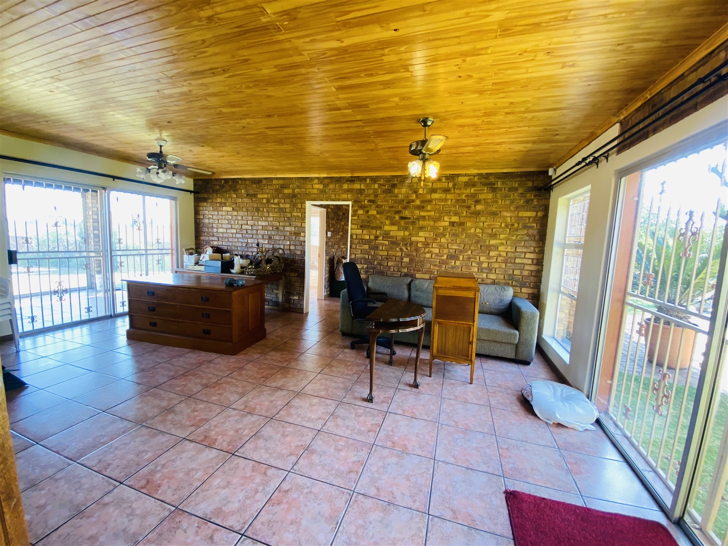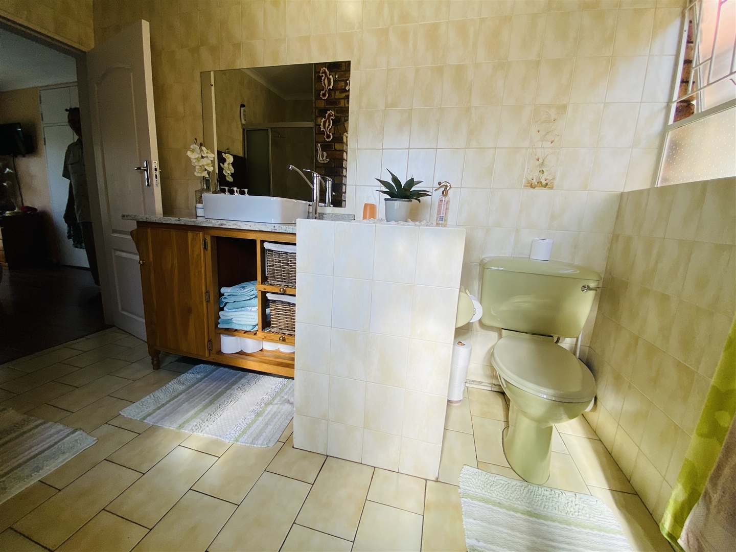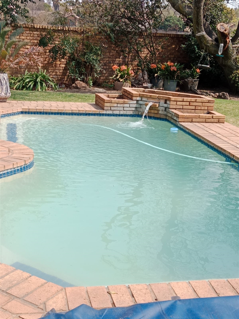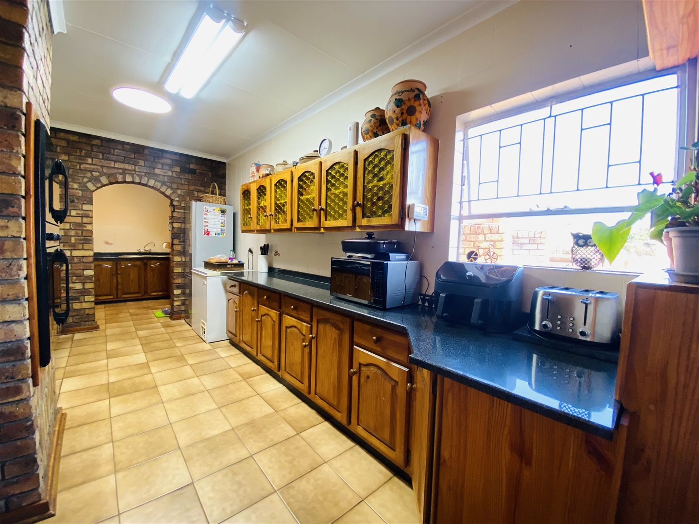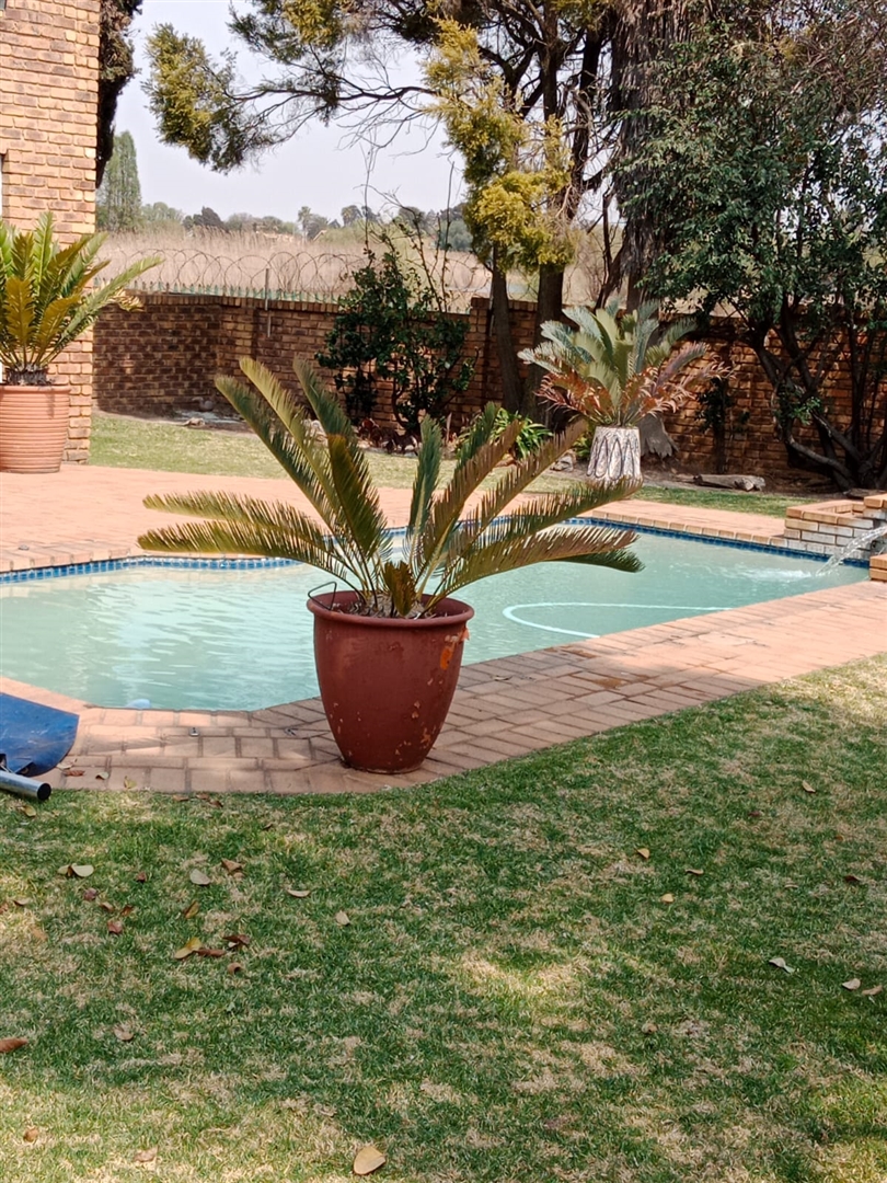The outbuilding contains a flatlet with a full kitchen, open plan lounge and dining area that opens up to a pool. There is also a full bathroom and a bedroom with built-in cupboards. The property also includes a servants quarters with toilets. Outside, you'll find a sparkling pool, double garage, and a double carport for additional parking.