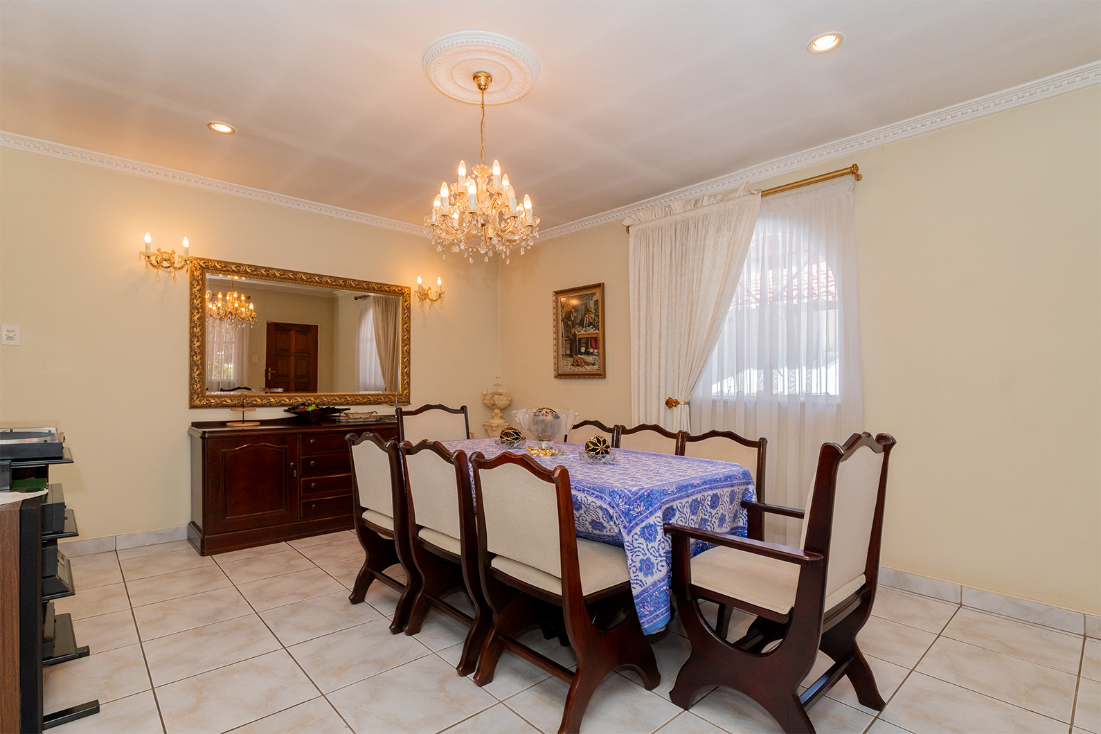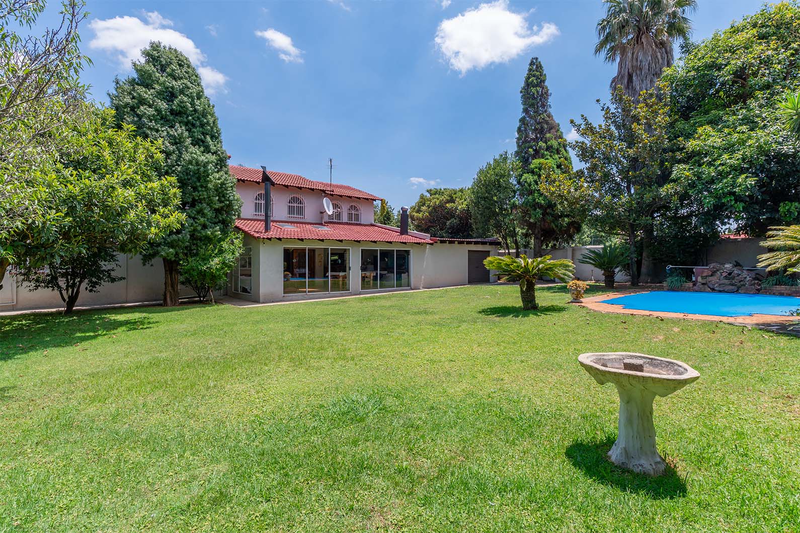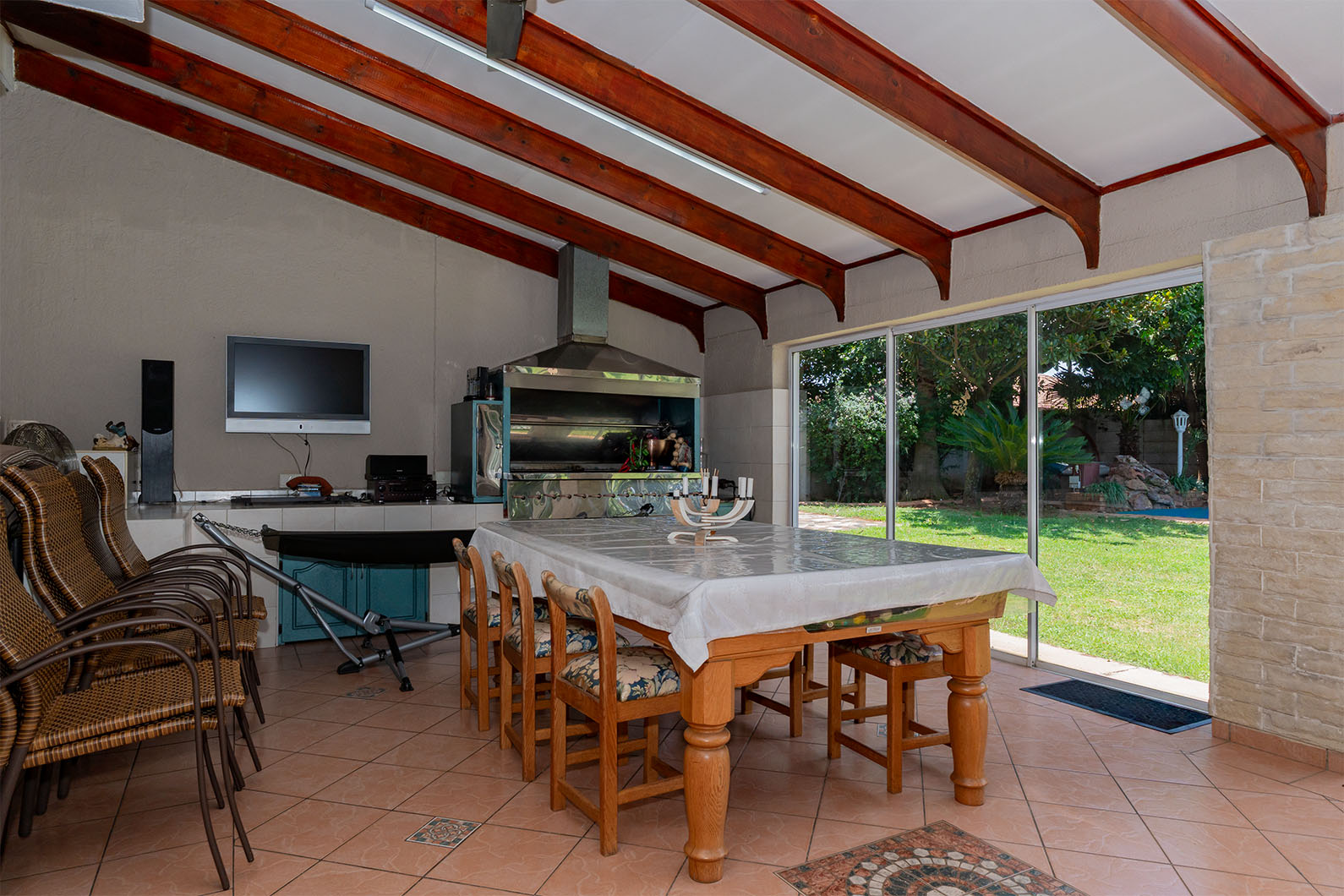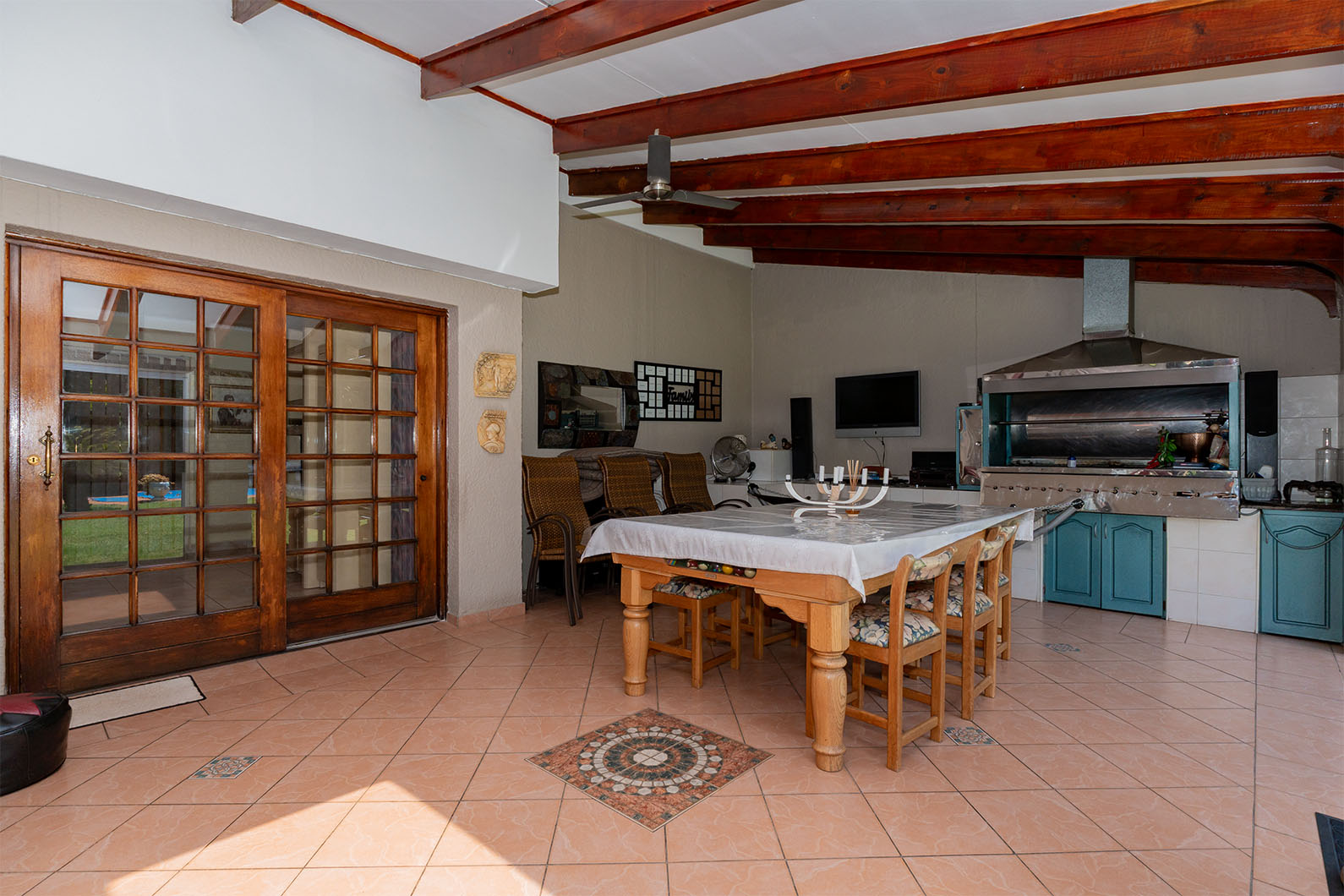 Most of the reception rooms enjoy access through double-opening doors to a large covered patio with gas built-in braai, and a view of the landscaped garden and pool area.