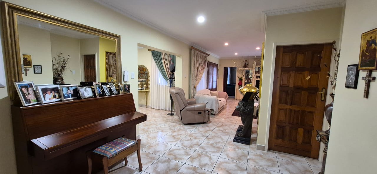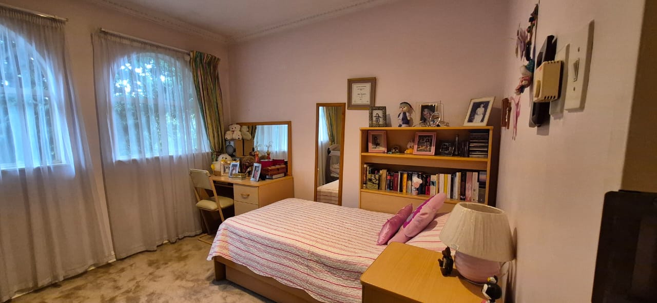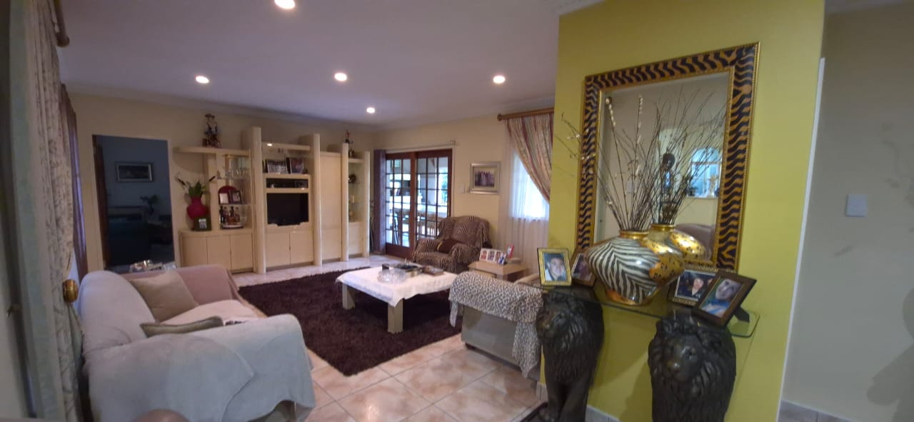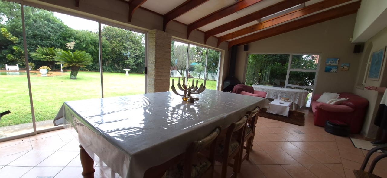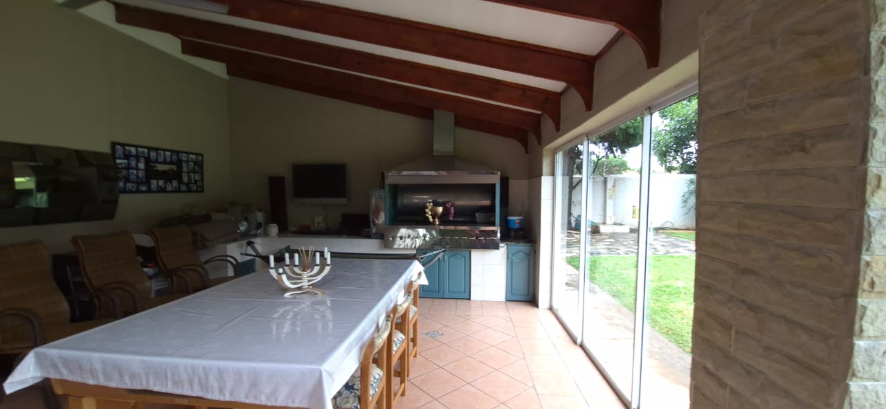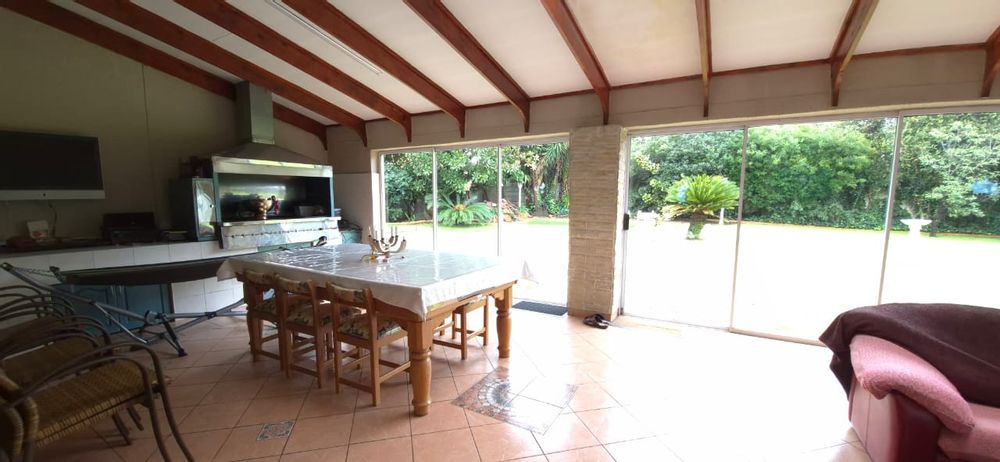 Most of the living areas open via double sliding doors to a generous covered patio equipped with a built-in gas braai, offering a picturesque view of the stunning garden and pool.