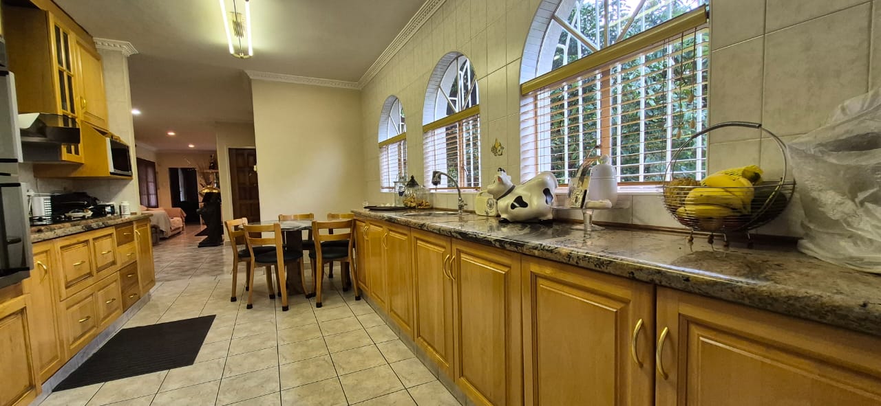 The modern kitchen boasts luxurious granite countertops, stylish built-in cabinetry, a cozy breakfast nook with a circular table, a spacious scullery for all essential appliances, and ample room for a double-door refrigerator, complete with an eye-level oven and hob.