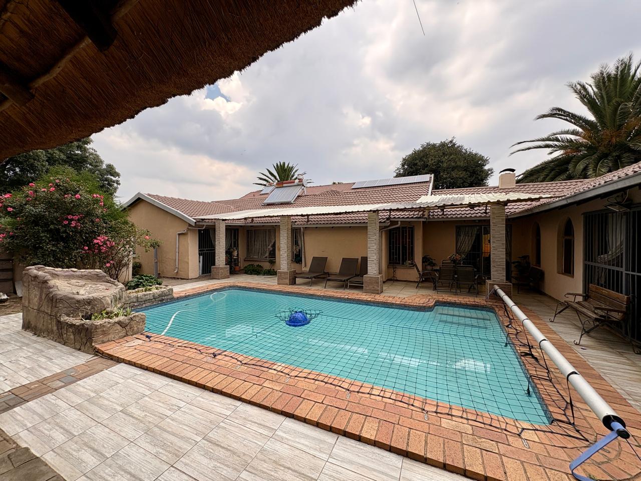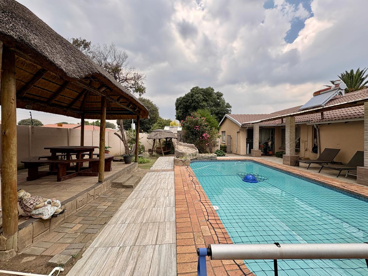 The outdoor space is an entertainer’s dream, featuring a covered front patio and a large swimming pool area at the back, complete with a raised lapa and an outdoor braai, perfect for gatherings and enjoying the outdoors.