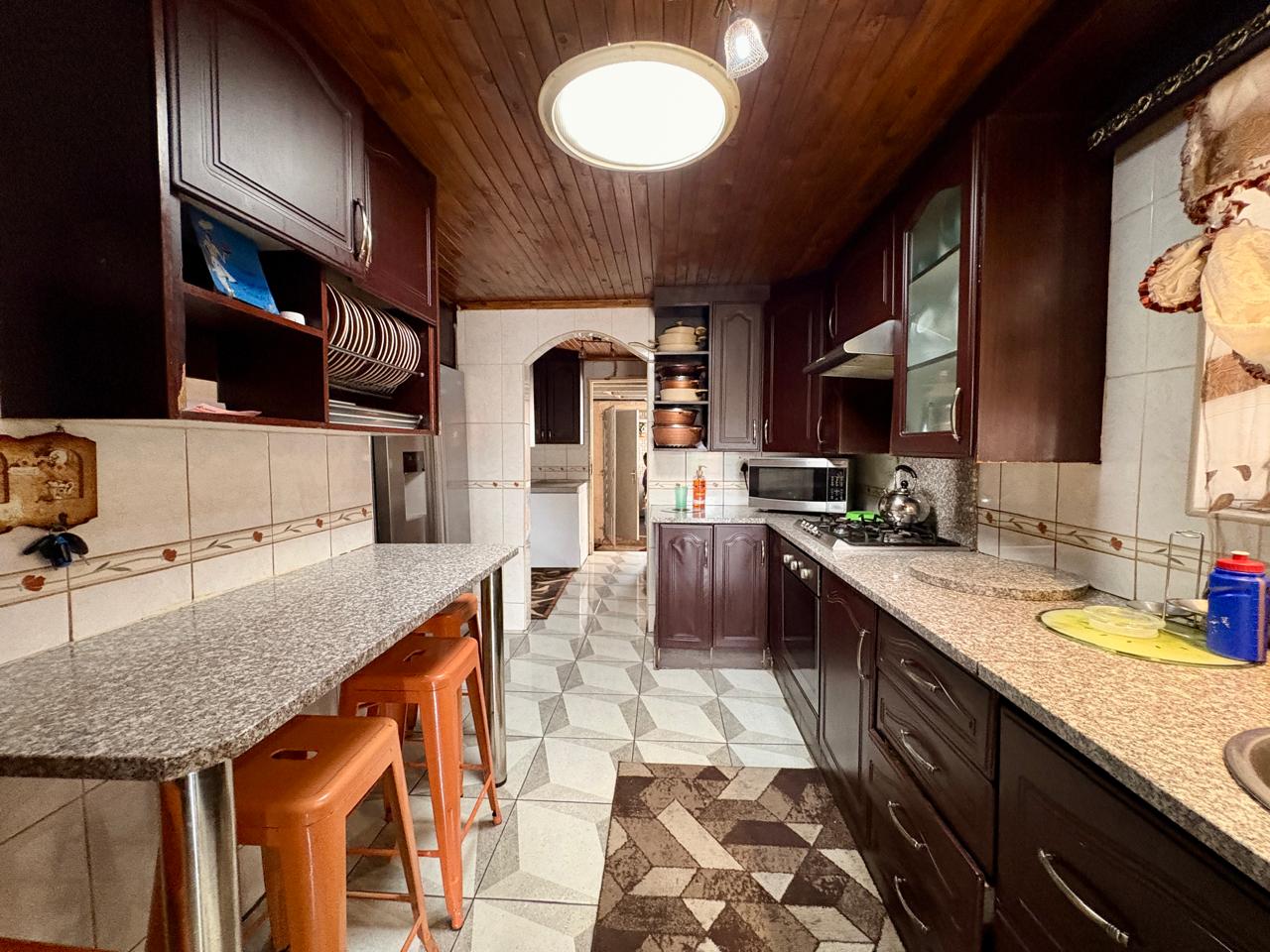 The adjoining dining room is ideal for family dinners or hosting guests. The dining room comes complete with a beautifully built-in buffet. A beautifully designed mahogany kitchen equipped with modern finishes, a gas stove, and a separate scullery ensures effortless meal preparation. A separate laundry adds just more convenience.