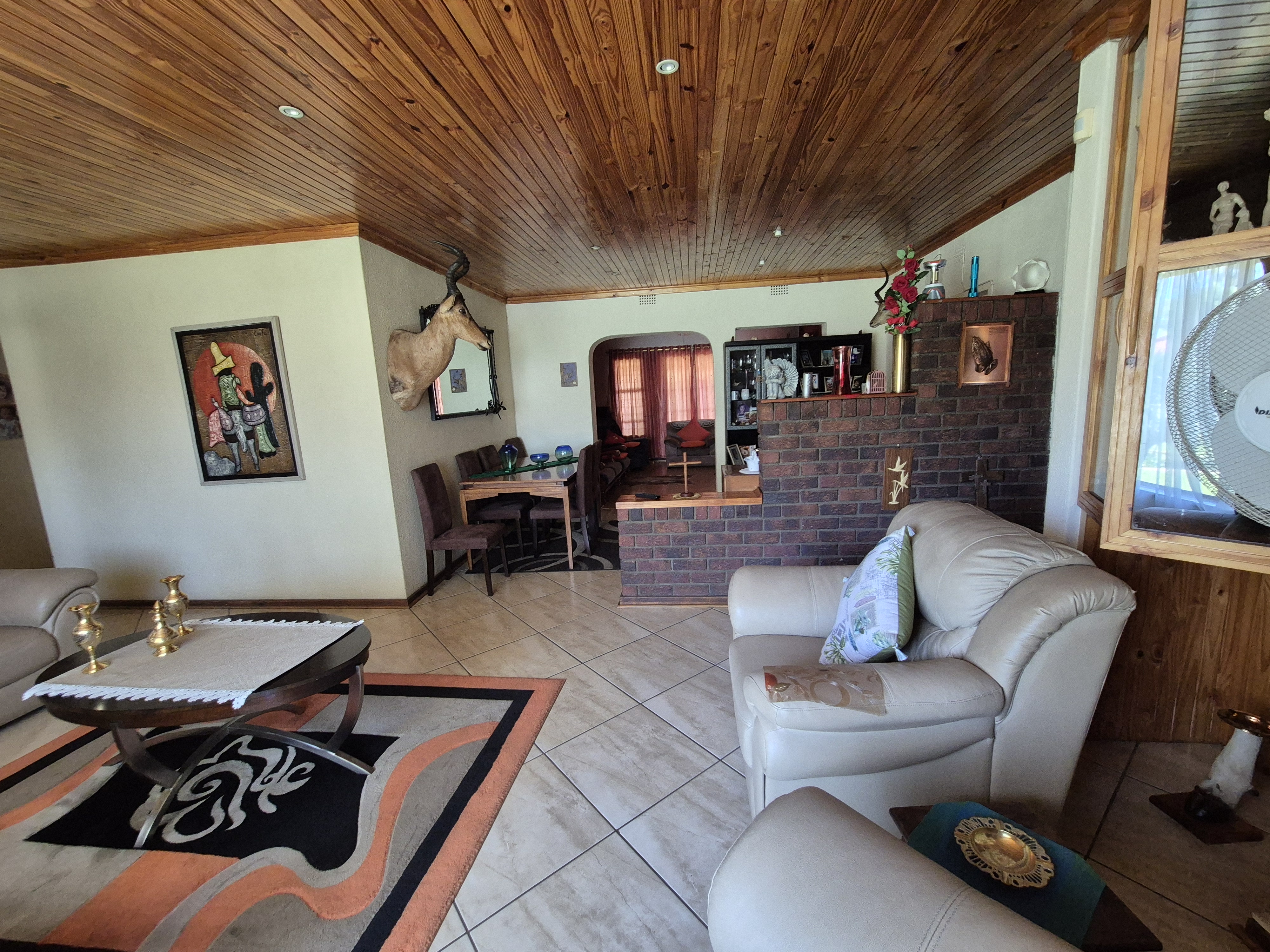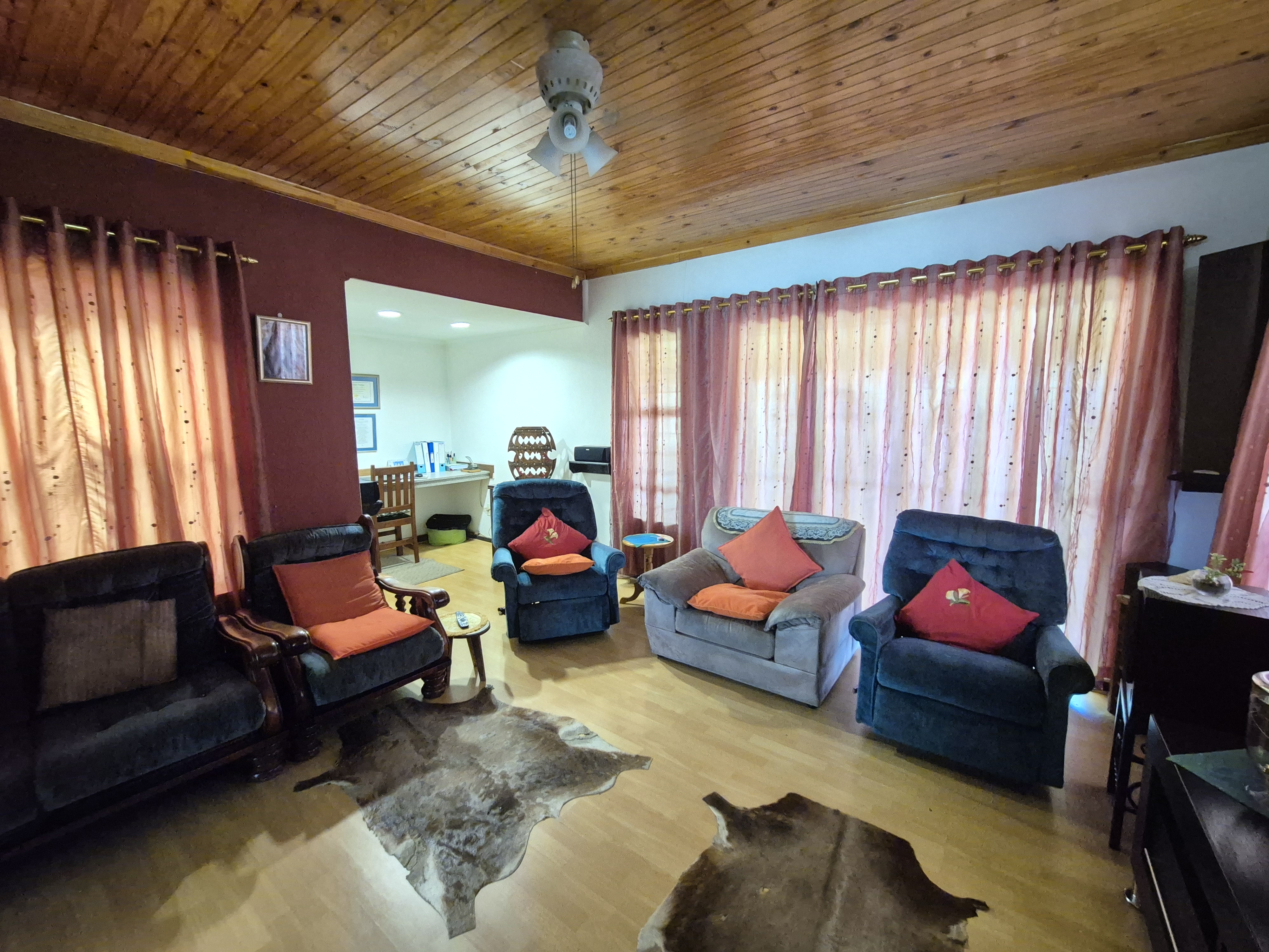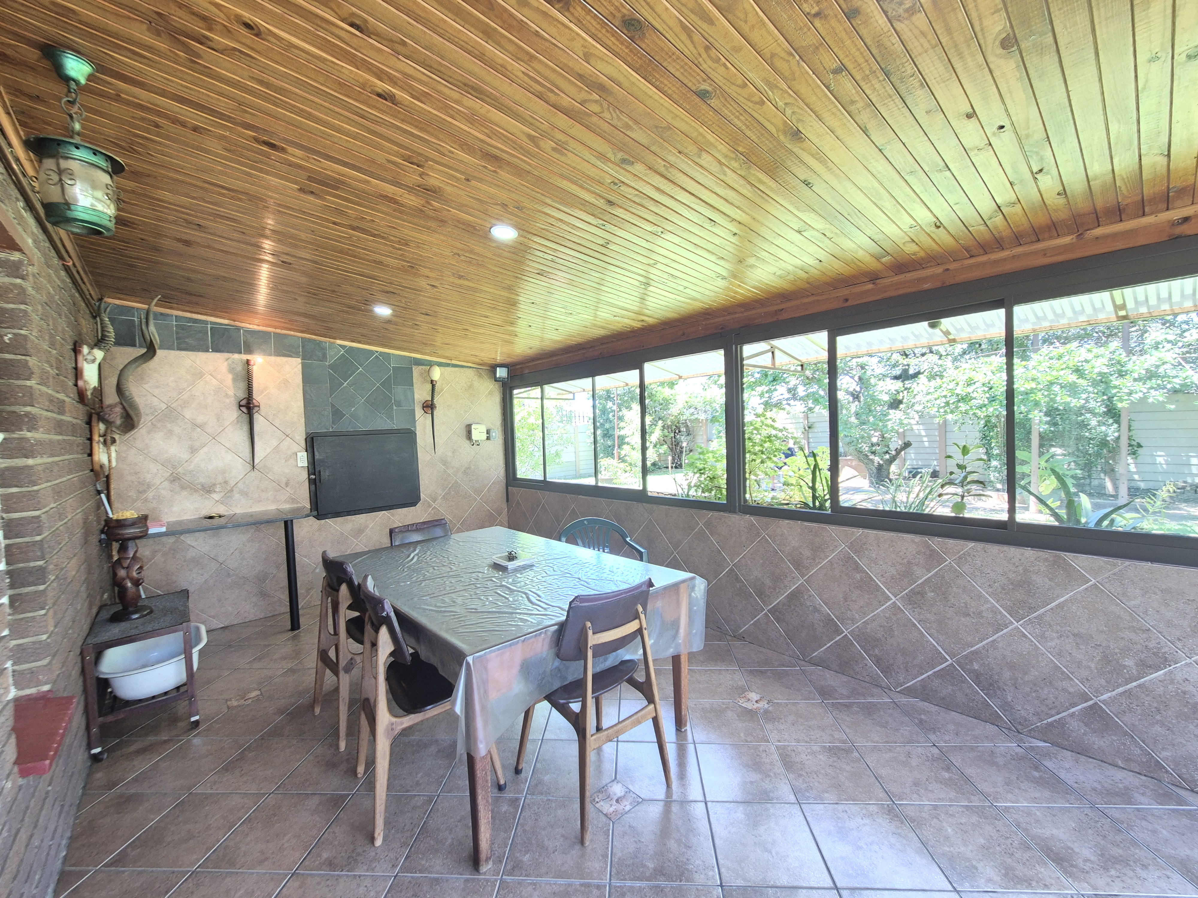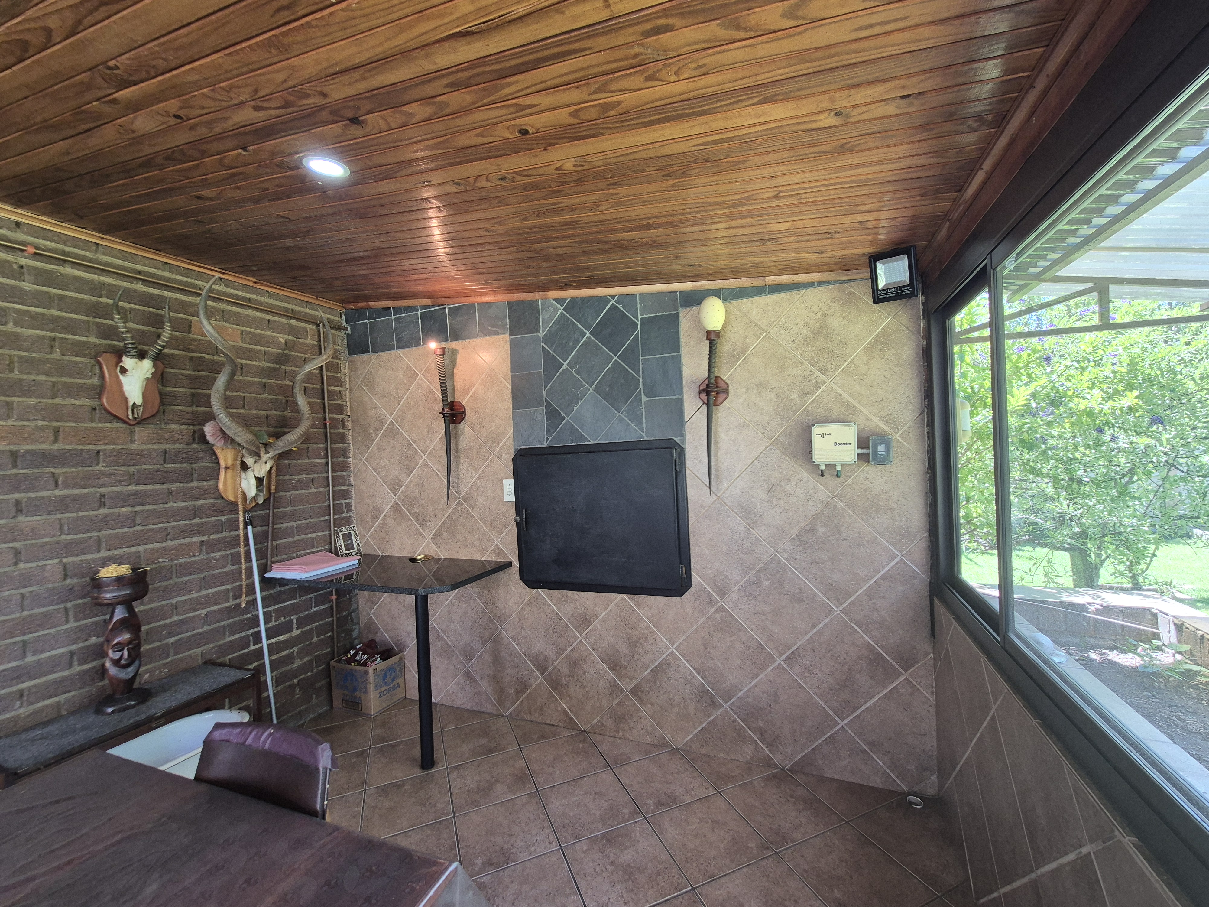 Inside, you’ll find a warm country-style kitchen with a center island and gas stove—perfect for home chefs—along with a separate laundry room and built-in hallway cupboards for extra storage. Multiple living areas, including a large lounge, cozy TV room, and elegant dining area, create inviting spaces for both relaxation and entertainment. A dedicated entertainment area with a built-in braai makes hosting friends and family a delight.
