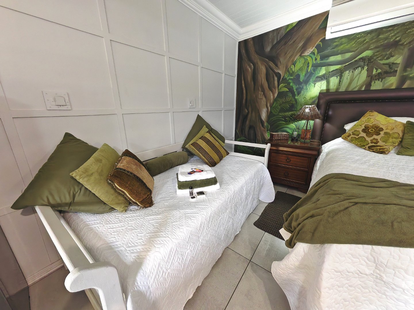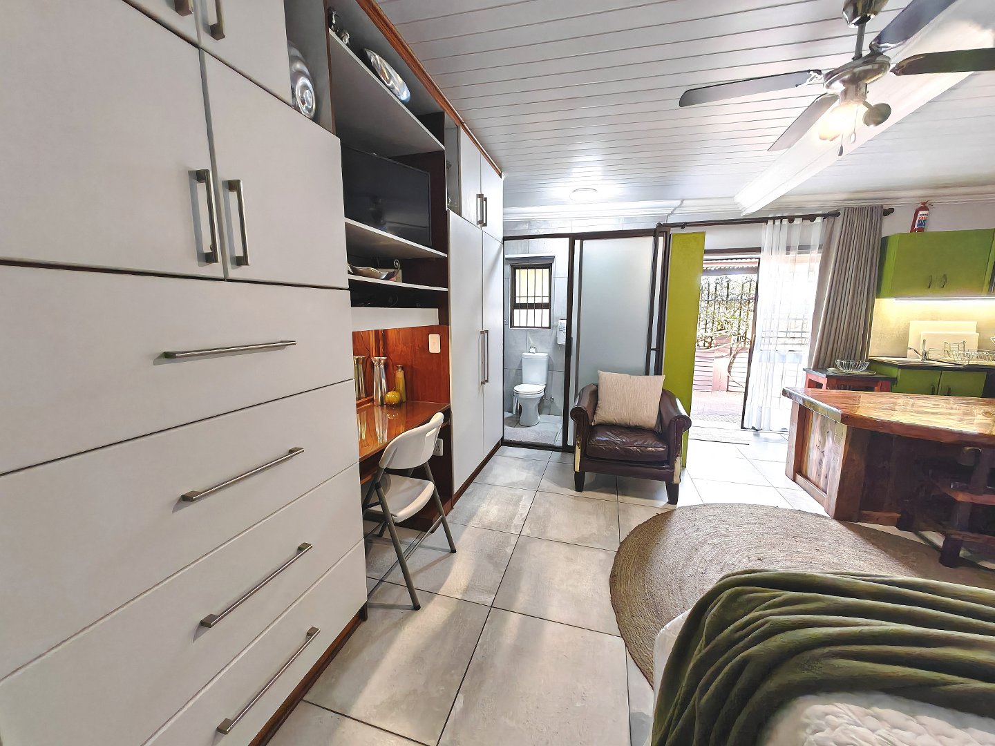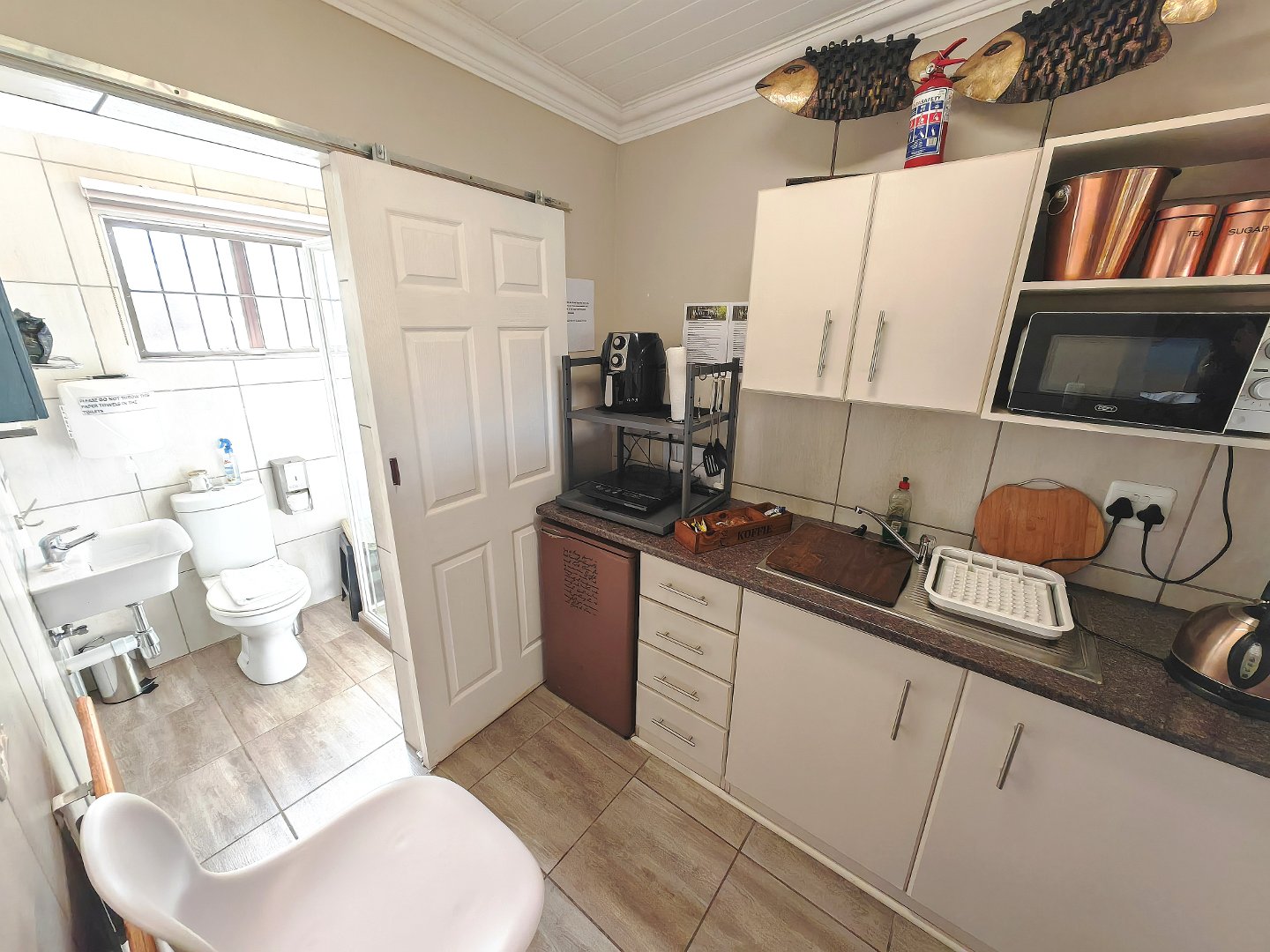 Two stylish, self-contained suites — each with a very spacious bedroom, bathroom, and kitchen. King sized bed in the one room and a queen, extra length bed in the other bedroom. Absolutely beautiful bathrooms. Exquisite and stylish!