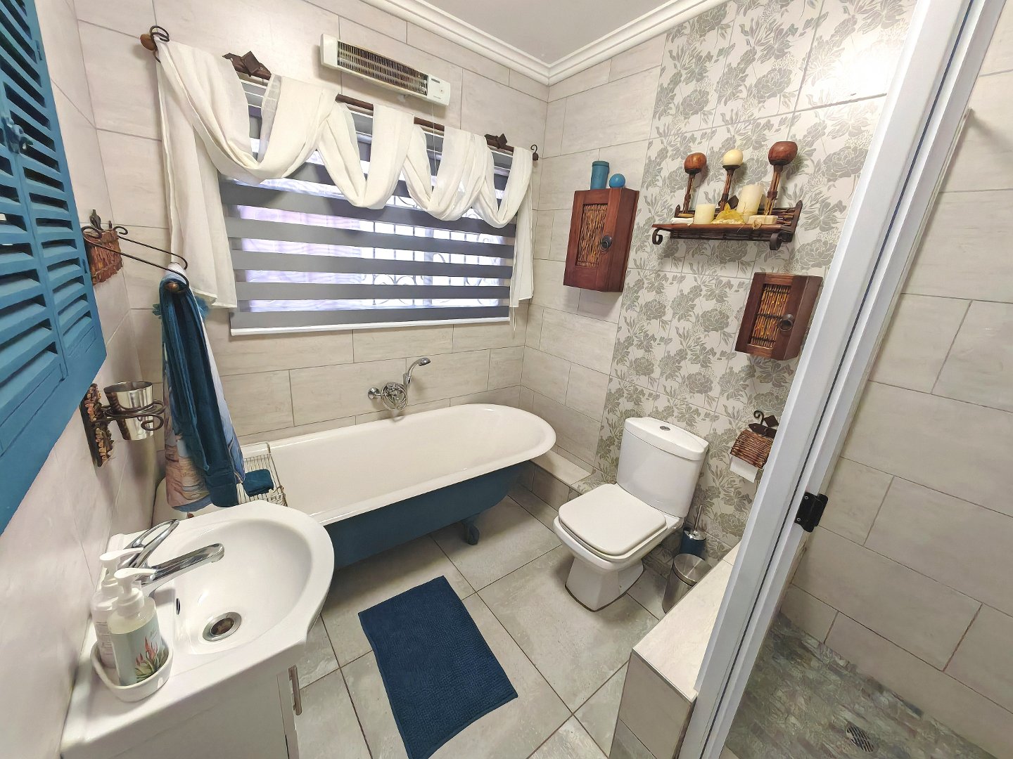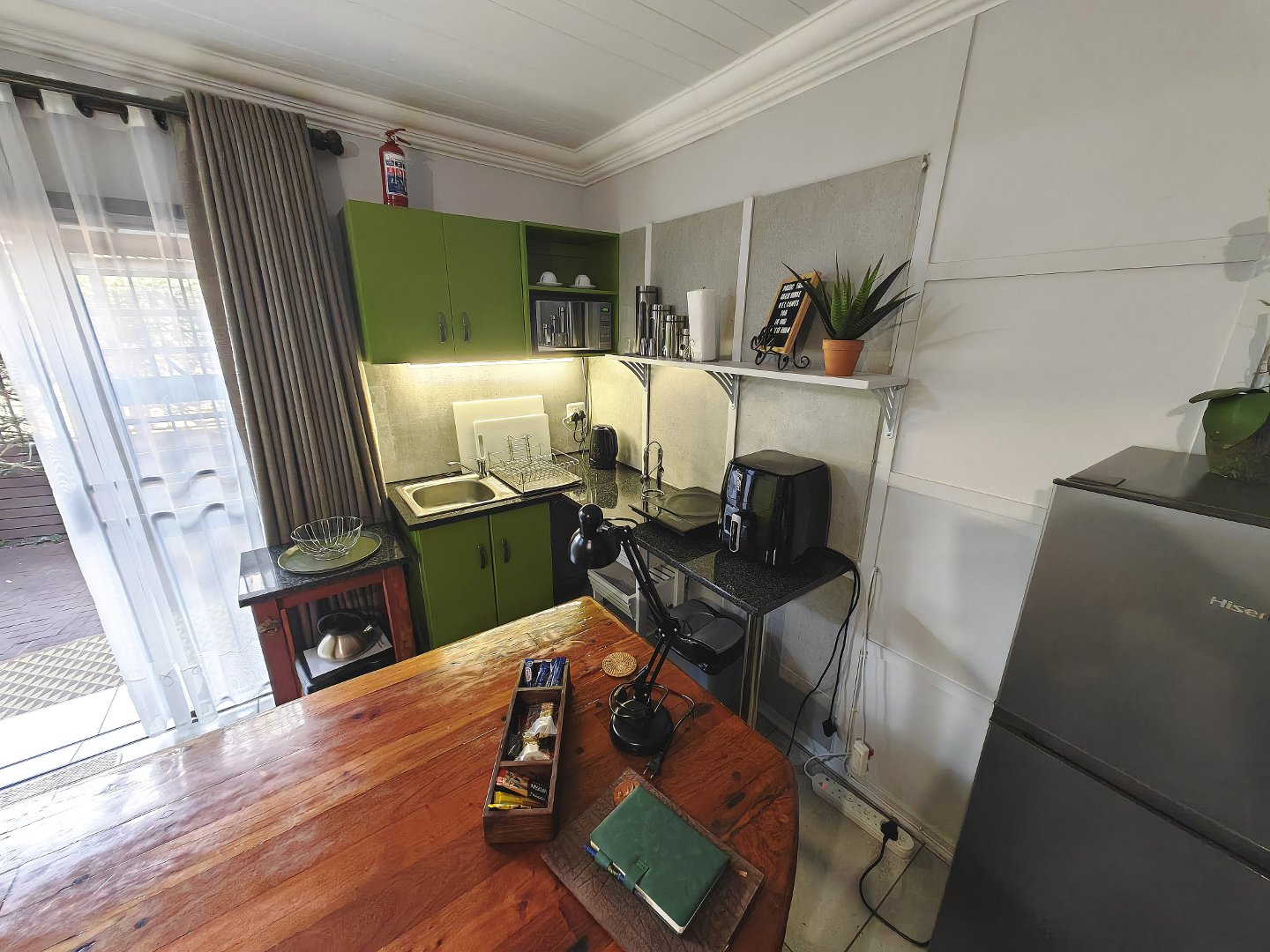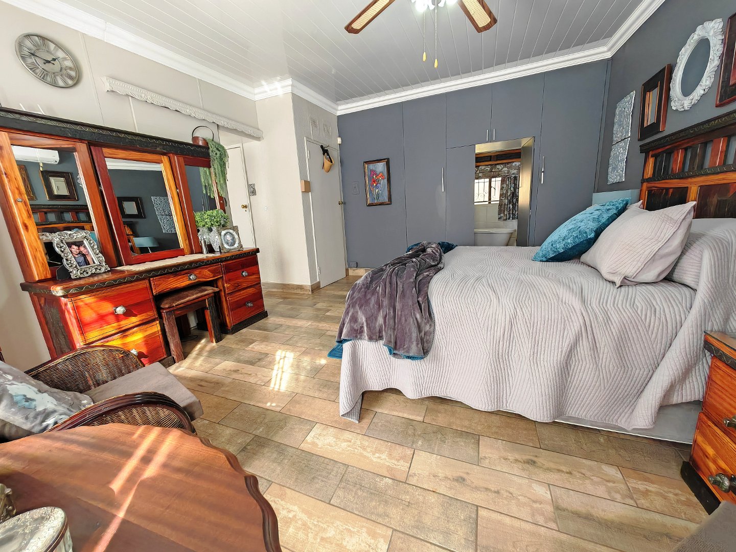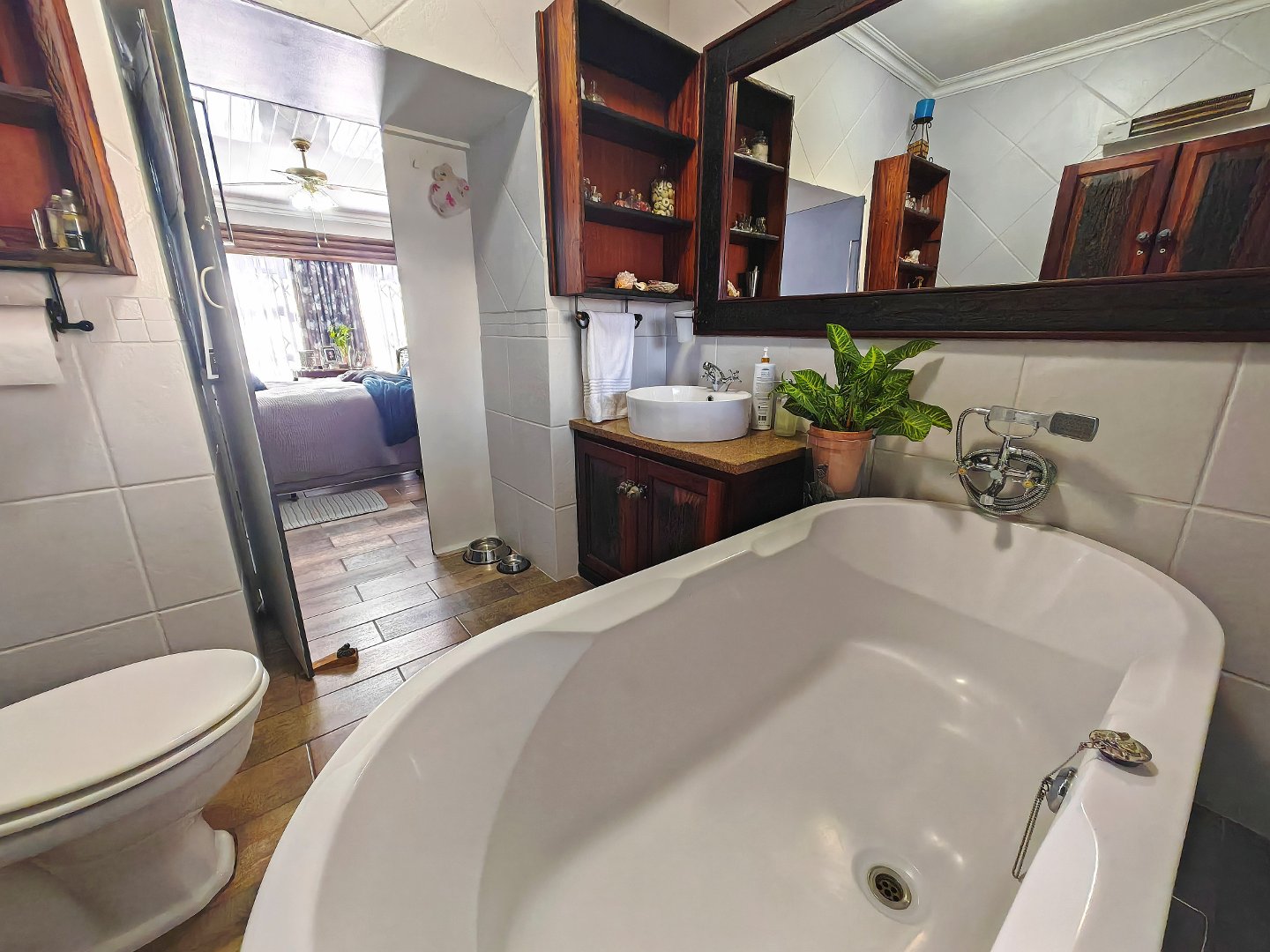 Two stylish, self-contained suites — each with a very spacious bedroom, bathroom, and kitchen. King sized bed in the one room and a queen, extra length bed in the other bedroom. Absolutely beautiful bathrooms. Exquisite and stylish!
