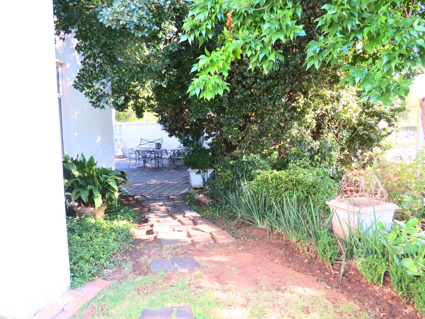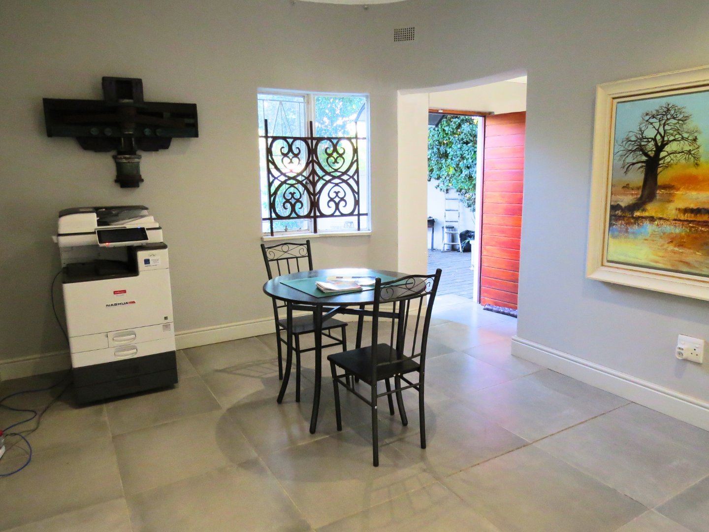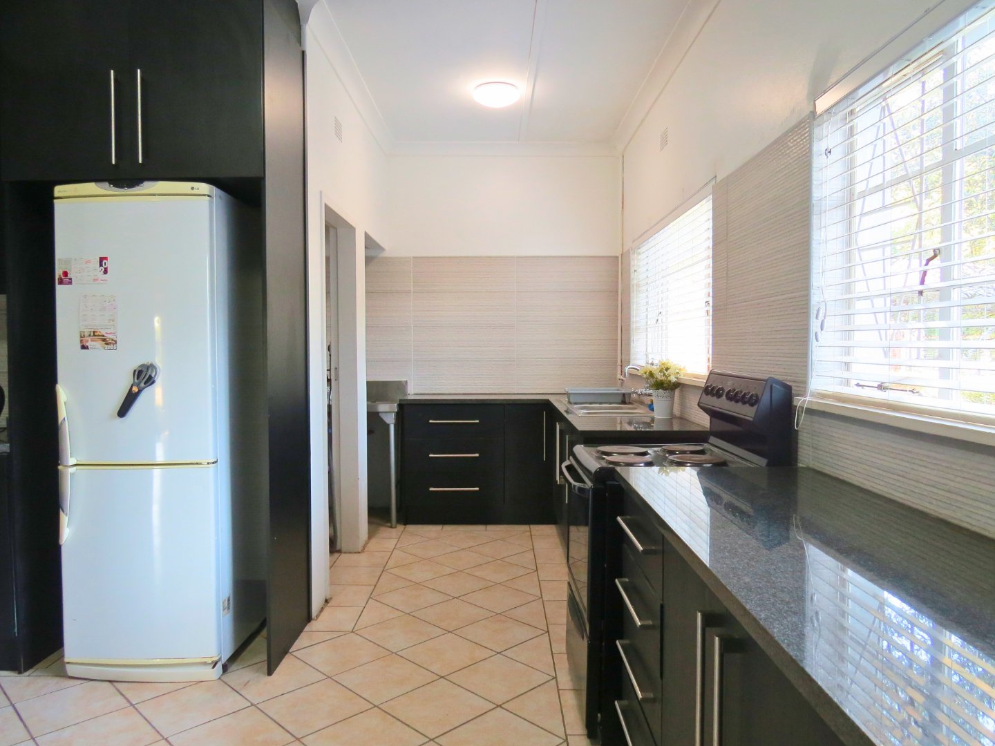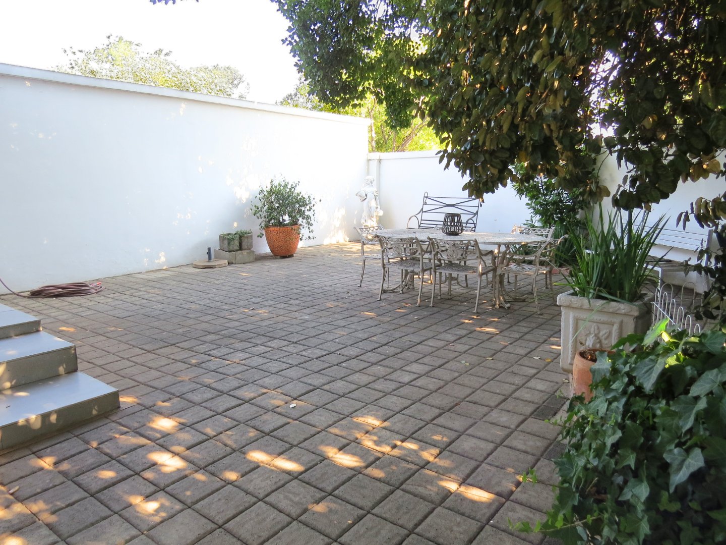 The impressive main entrance opens into large, open-plan living areas that immediately create a sense of space and versatility. These areas are ideal for entertaining, office use, consulting rooms, or even a small coffee shop. Large windows let in abundant natural light, while tiled and wood flooring add warmth and character. The space flows effortlessly into a tranquil courtyard, creating a calm and inviting atmosphere. The main building includes two separate guest toilets, as well as a toilet with a shower and direct access to the second apartment. The modern kitchen features granite countertops and neat, spacious cabinets, leading to a scullery and a bedroom with access to both the main passage and the garden.