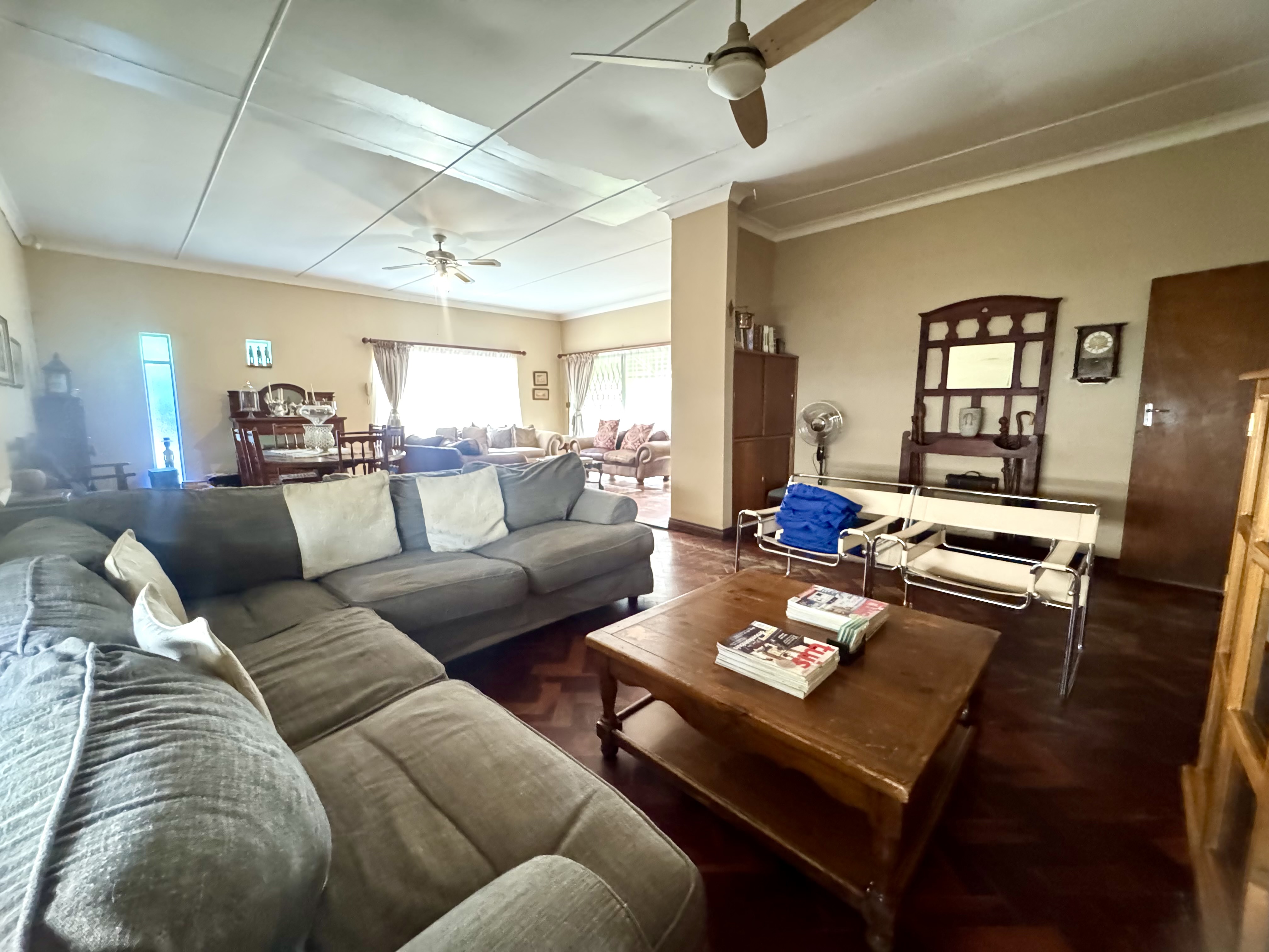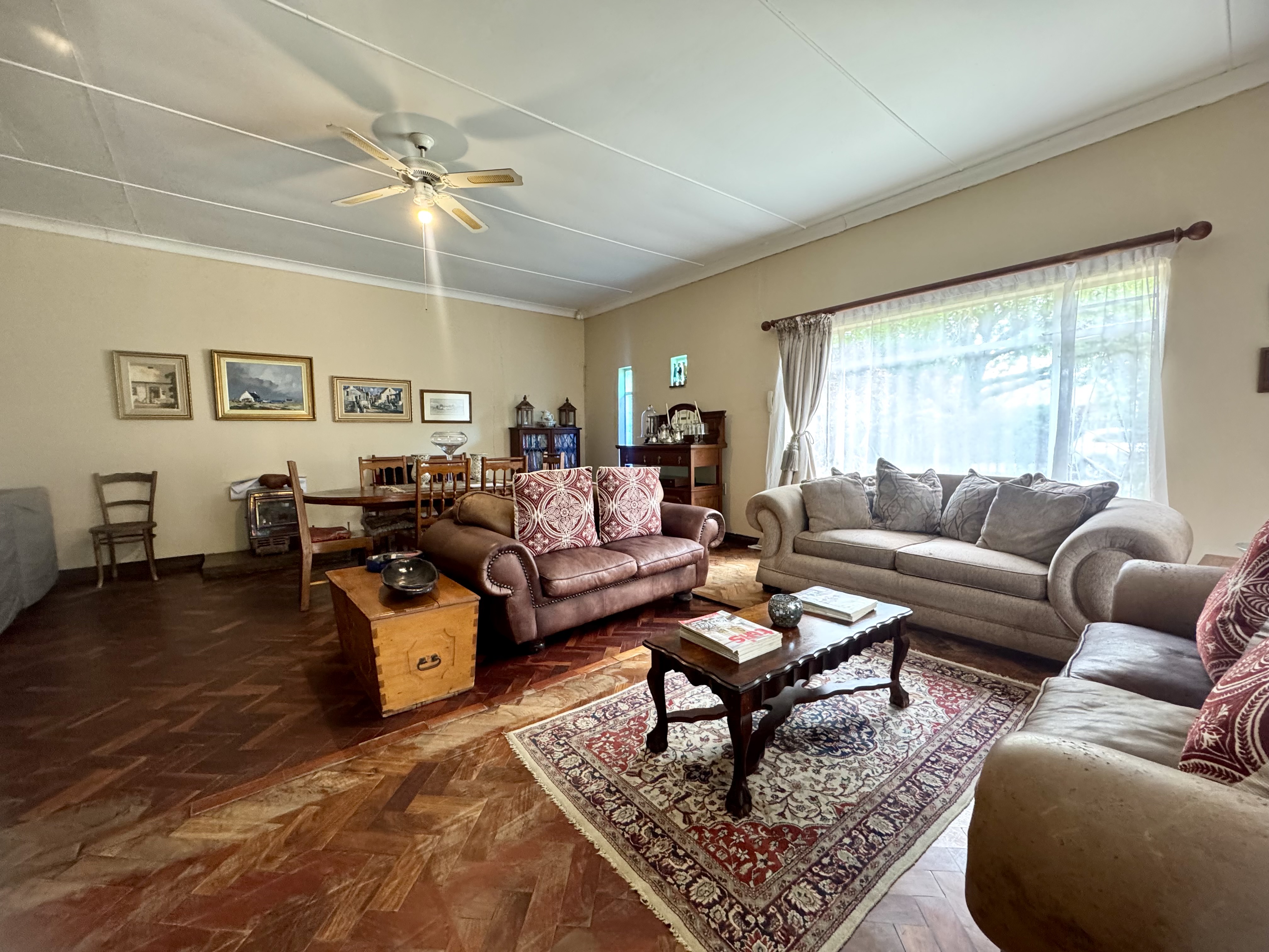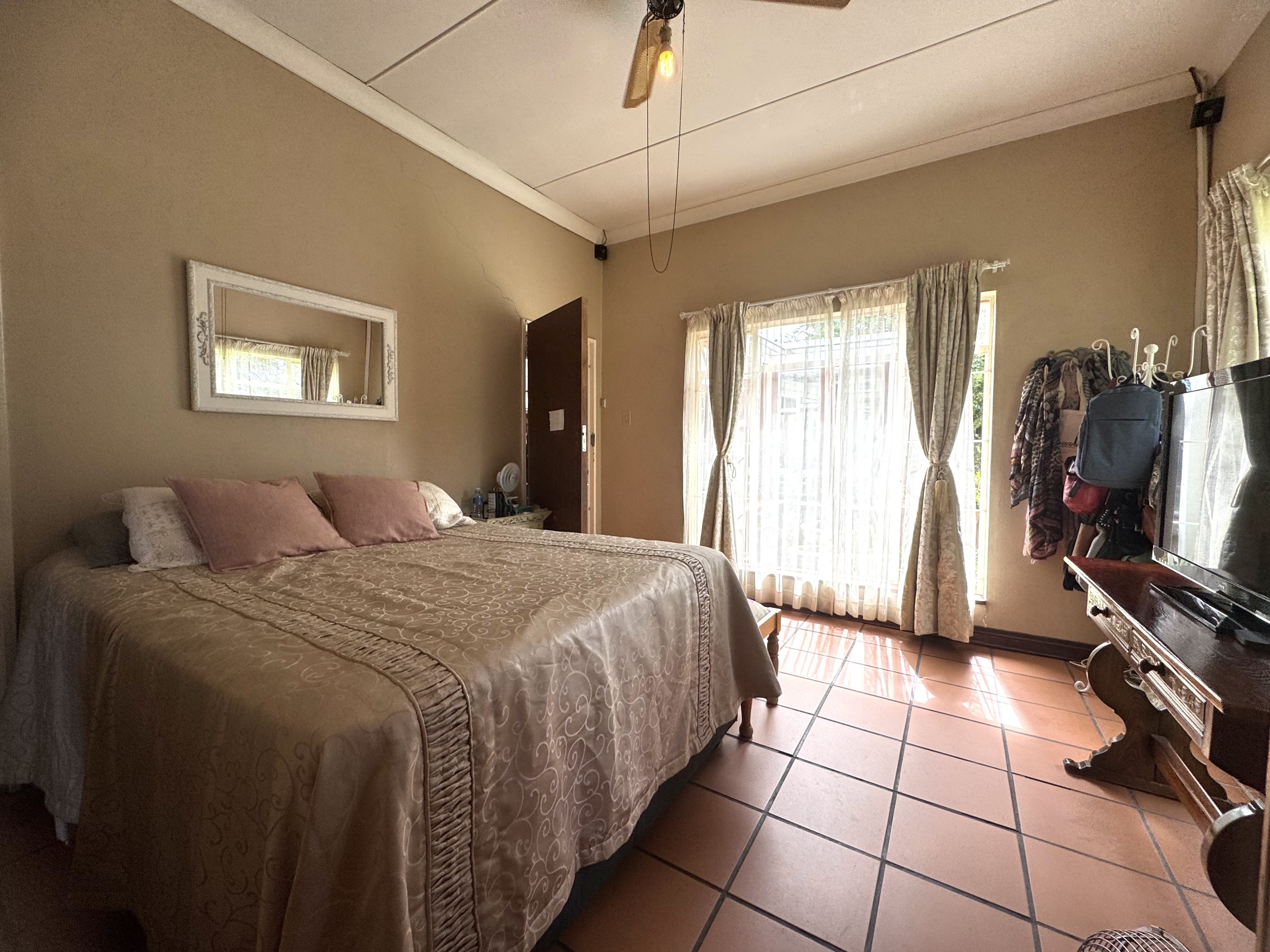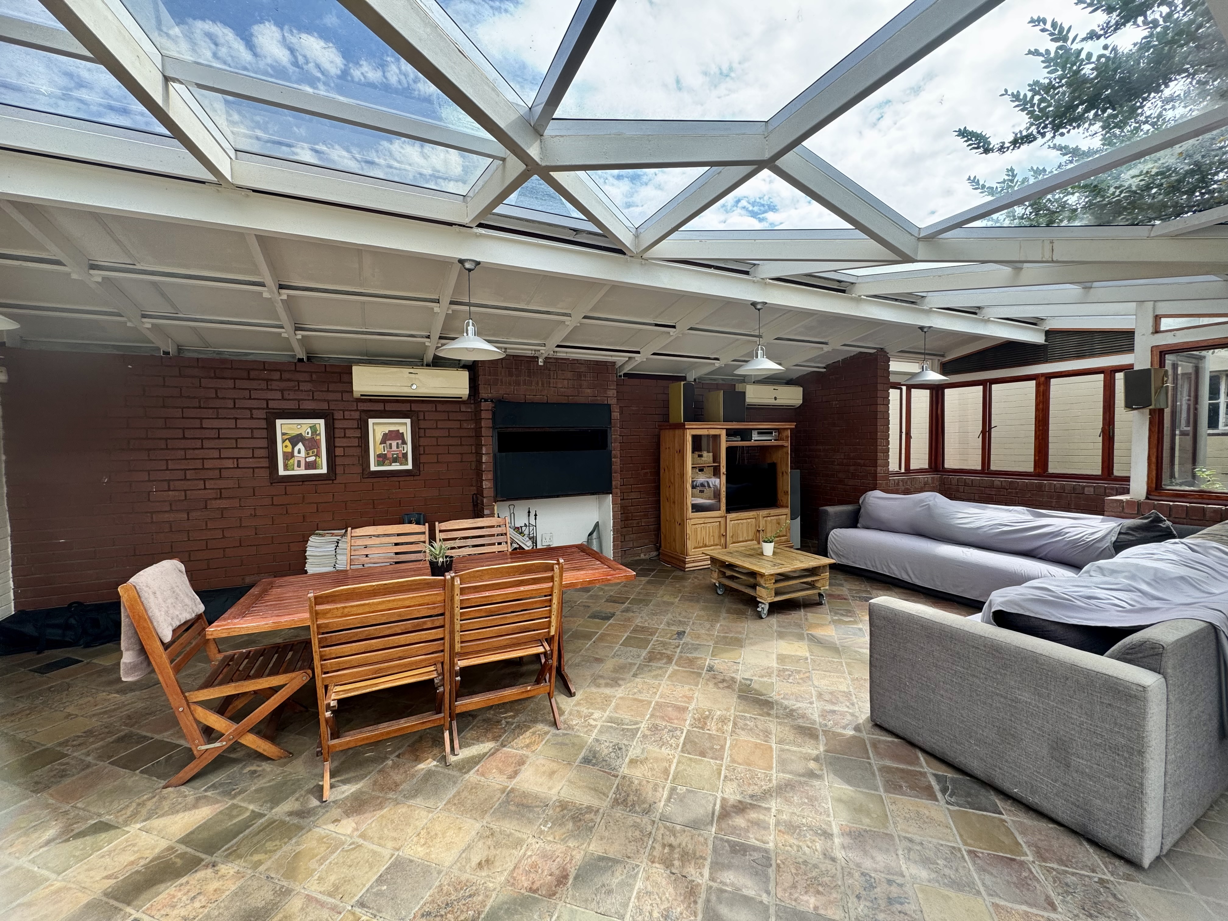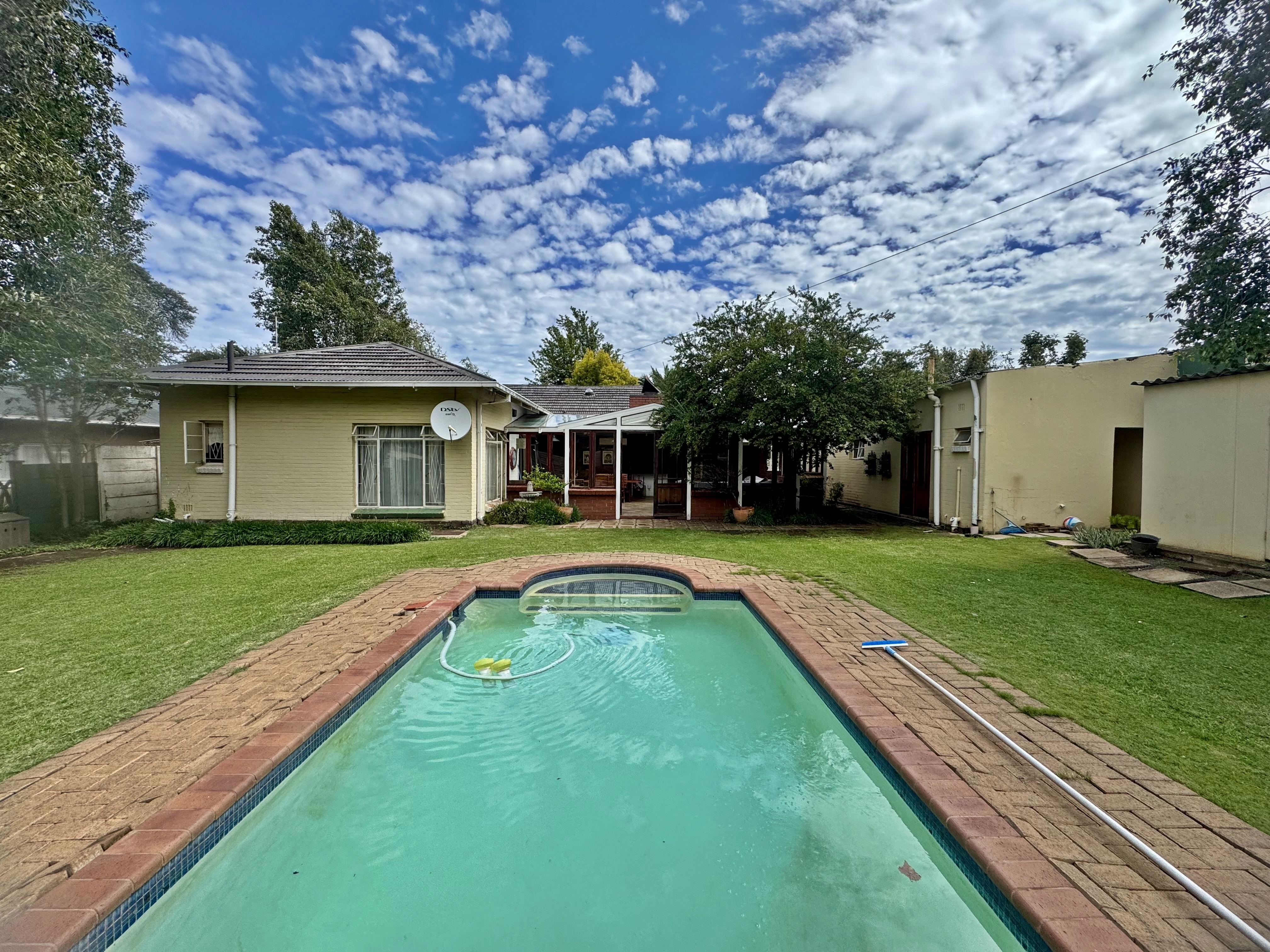 This delightful home offers a rare combination of spacious living, outdoor comfort, and practical features—making it ideal for families and entertainers alike. Set on a generously sized stand, the property boasts a beautifully maintained garden, enhanced by an irrigation system in both the front and back yards to keep it lush year-round. A sparkling swimming pool creates the perfect setting for summer relaxation and outdoor gatherings. Ample parking is available with a single garage, a double carport, and additional secure space for two more vehicles. Inside, the home welcomes you with an airy, open-plan layout that includes two spacious lounges, a dining area, and a skylit hallway that bathes the interior in natural light. The well-equipped kitchen features a built-in stove, double oven, and a separate scullery, offering both style and practicality. Underfloor heating in the second hallway adds cozy warmth during the winter months, while a solar tube geyser ensures energy-efficient water heating for the en-suite bathroom. Each of the three bedrooms is fitted with built-in cupboards and skylights, making them bright and inviting. The main bedroom includes a ceiling fan, its own luxurious en-suite bathroom with a chandelier, bath, and shower, as well as a versatile adjoining space perfect for a pajama lounge or home office. The home’s guest bathroom includes a bath and basin, with a separate toilet for added convenience. The highlight of the property is the exceptional entertainment area—complete with a built-in braai, two air conditioners, and elegant glass roof panels. Stacking wooden doors open onto the pool and garden, creating a seamless flow between indoor and outdoor living. Additional features include a garden shed for storage and a separate office space behind the garage. The home is fitted with pre-paid electricity and water, making budgeting simple and efficient. Don’t miss the chance to own this versatile and inviting home. Contact Annette Kasselman today to arrange your private viewing.