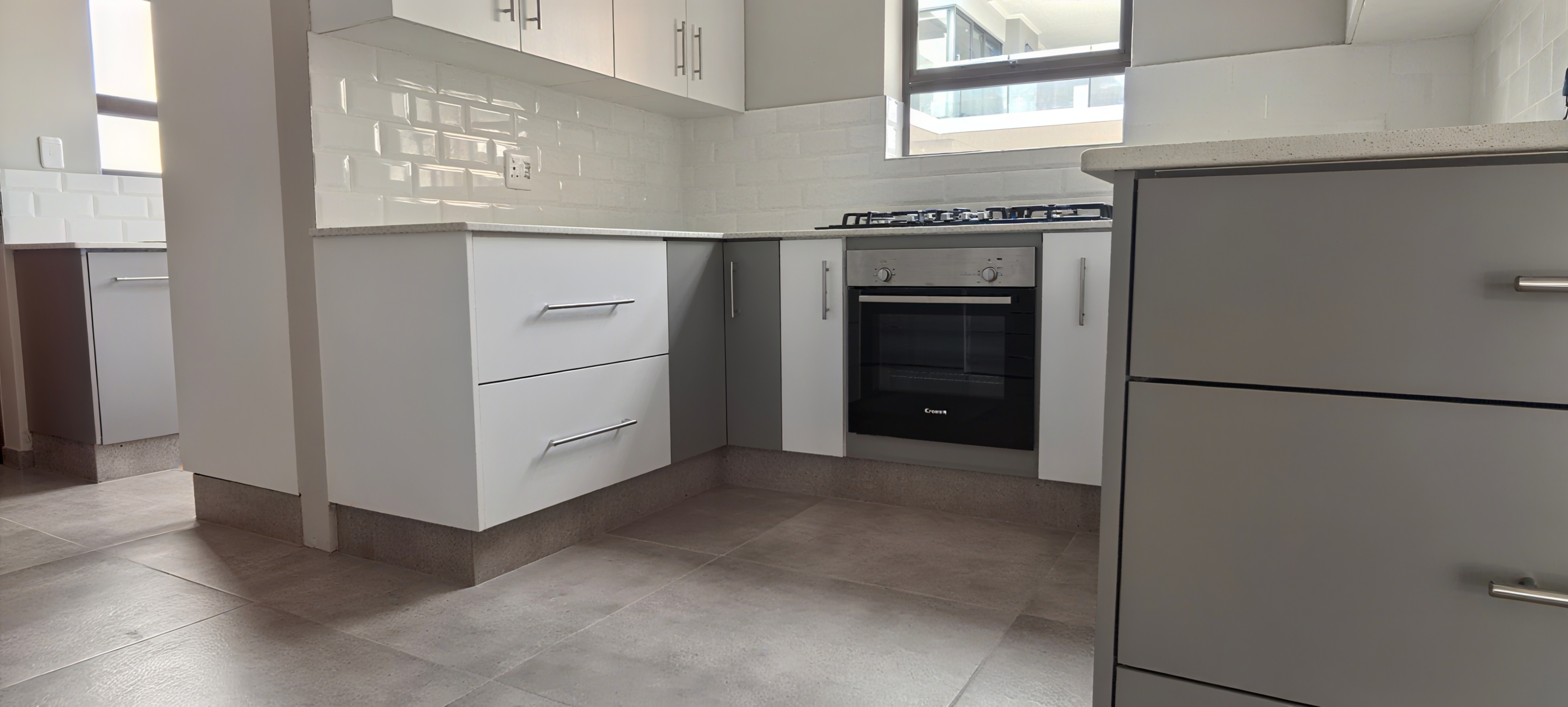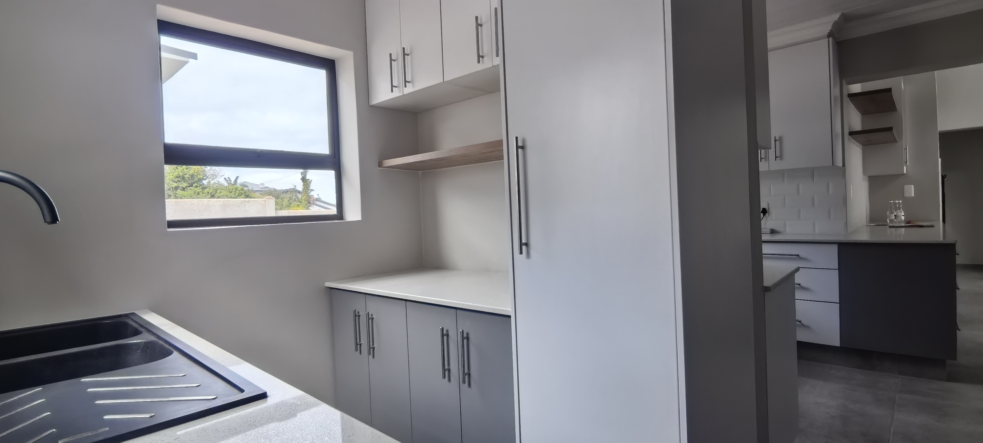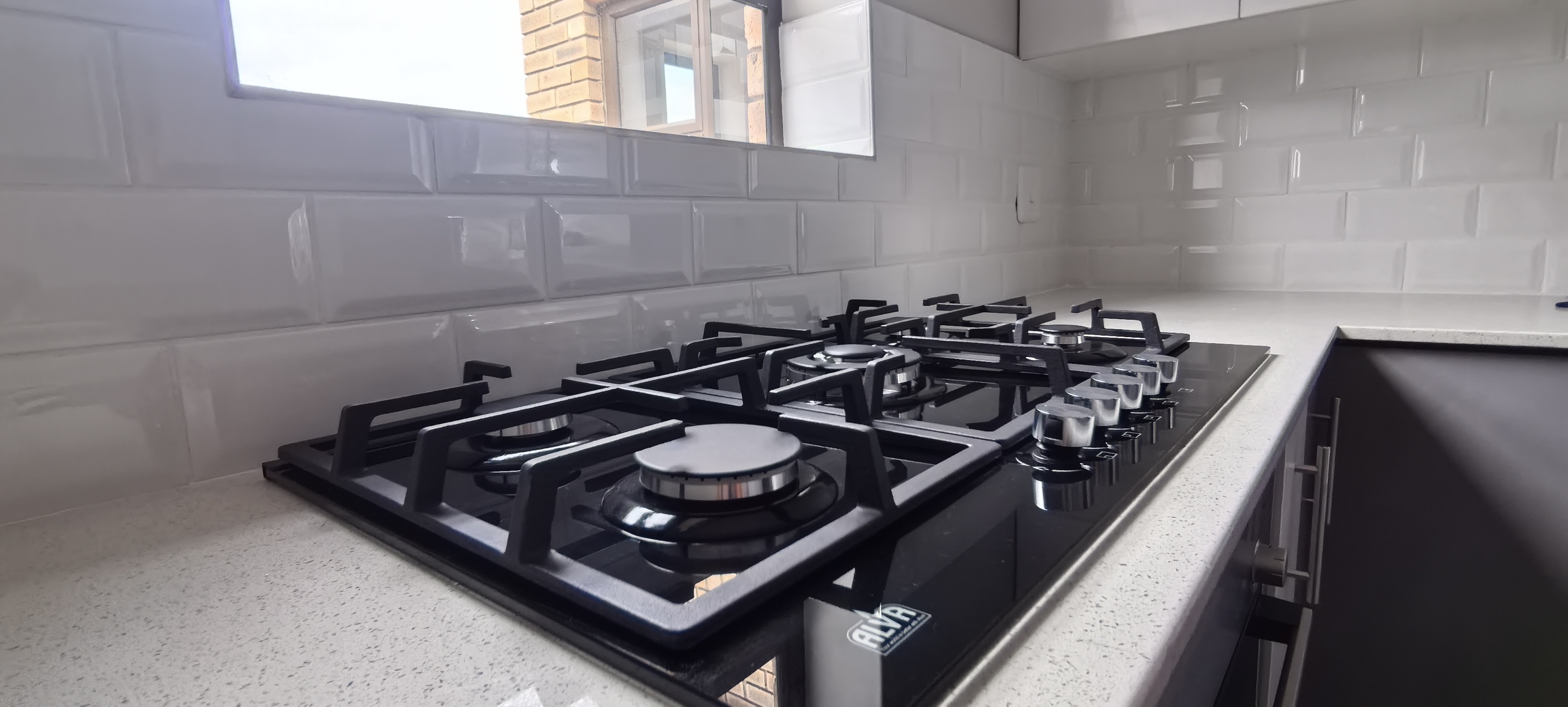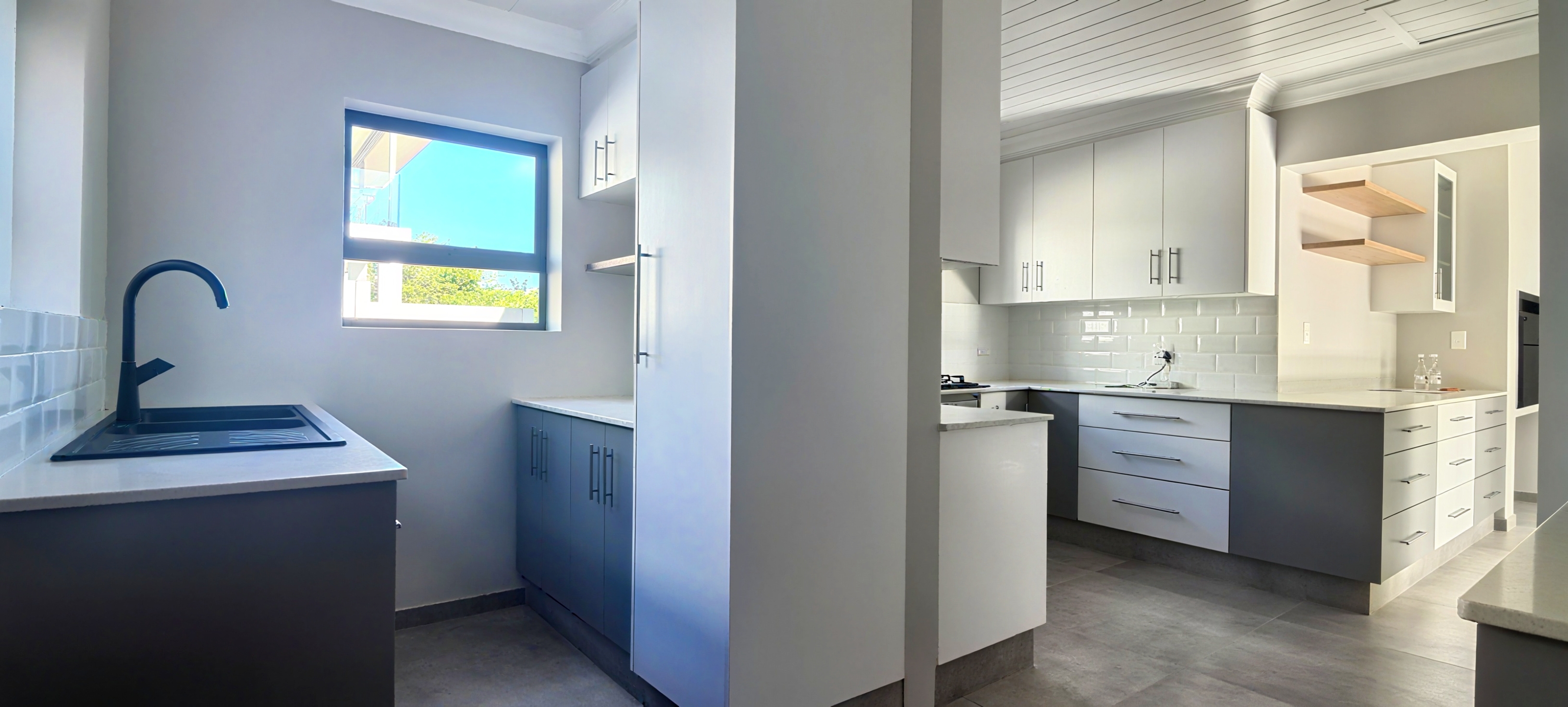 Contemporary Kitchen – Equipped with a gas hob, electric oven, and abundant cupboard space, plus a separate scullery with plumbing for both dishwasher and washing machine.