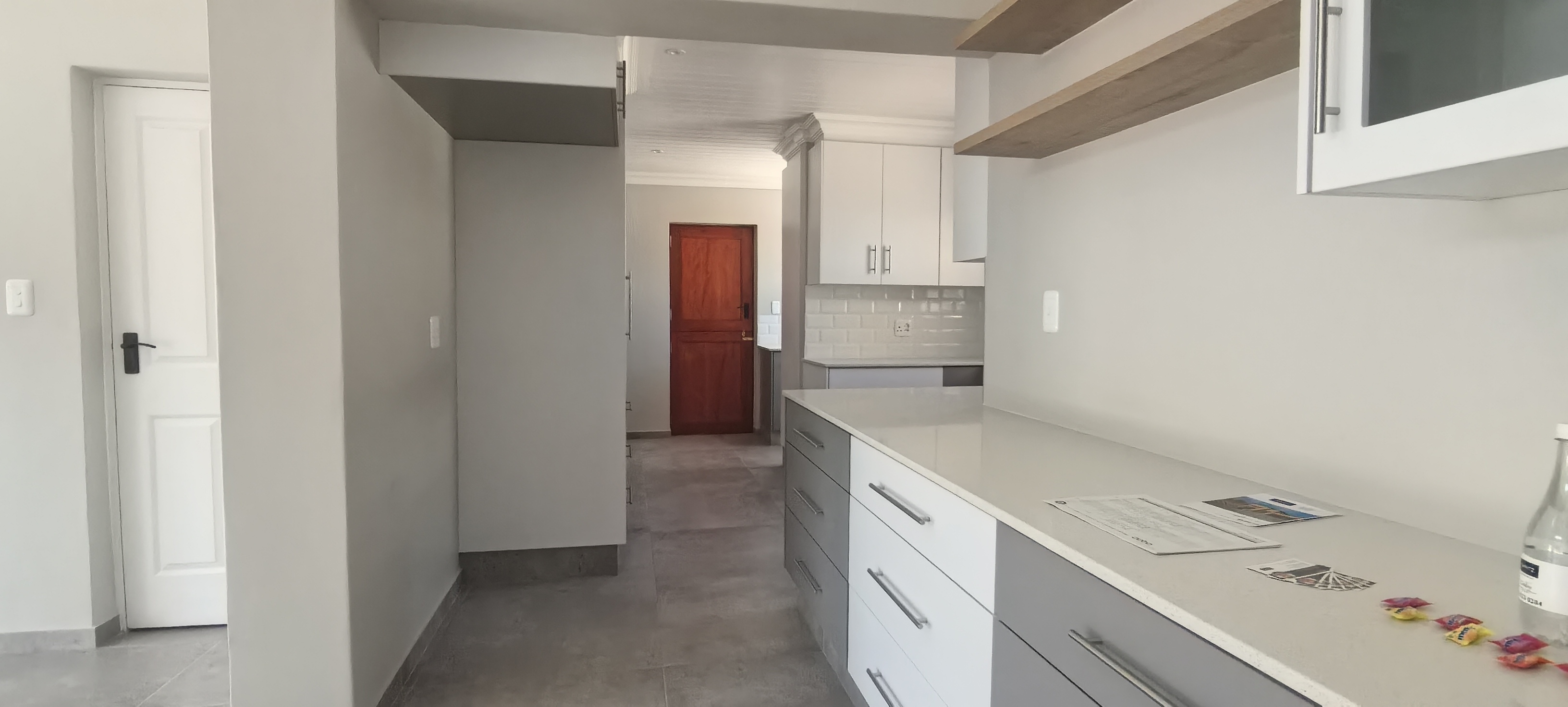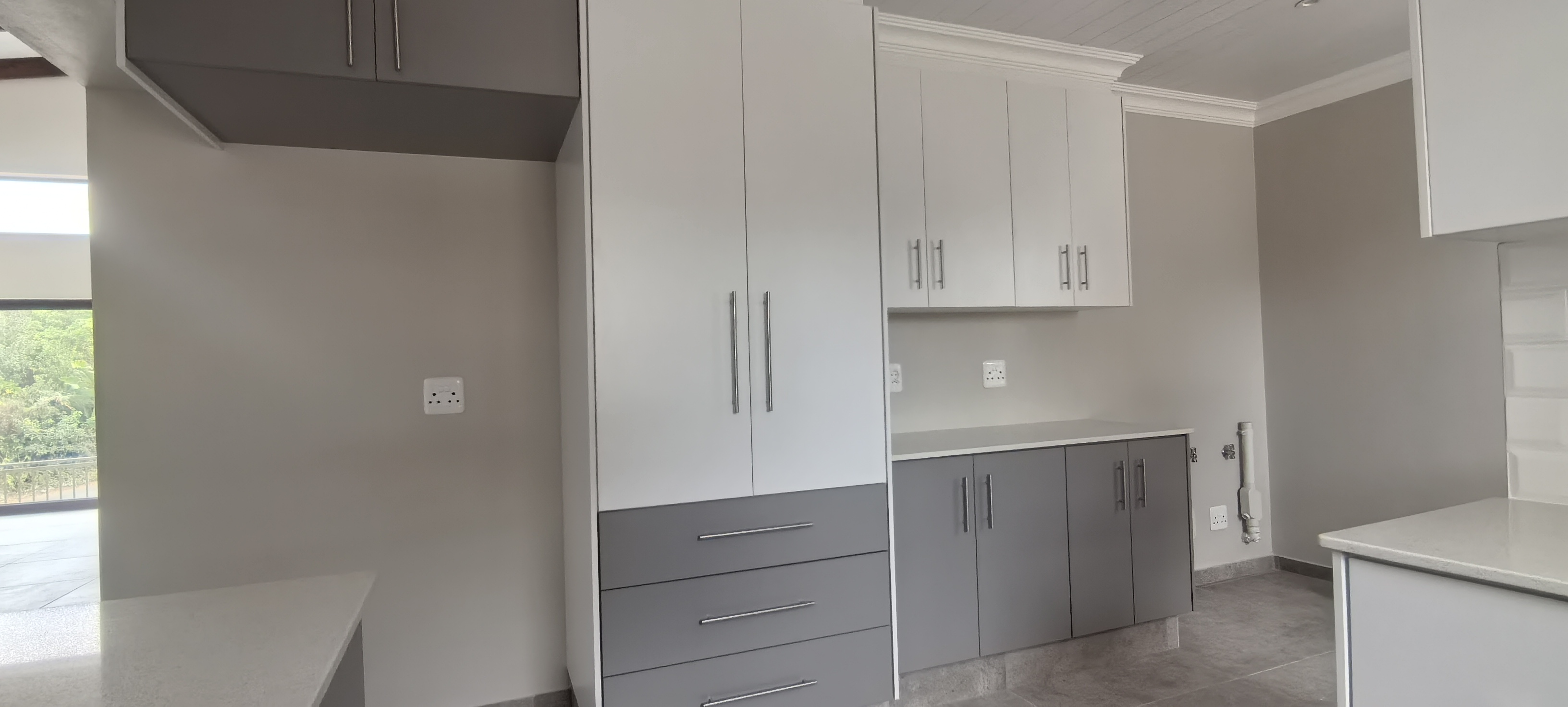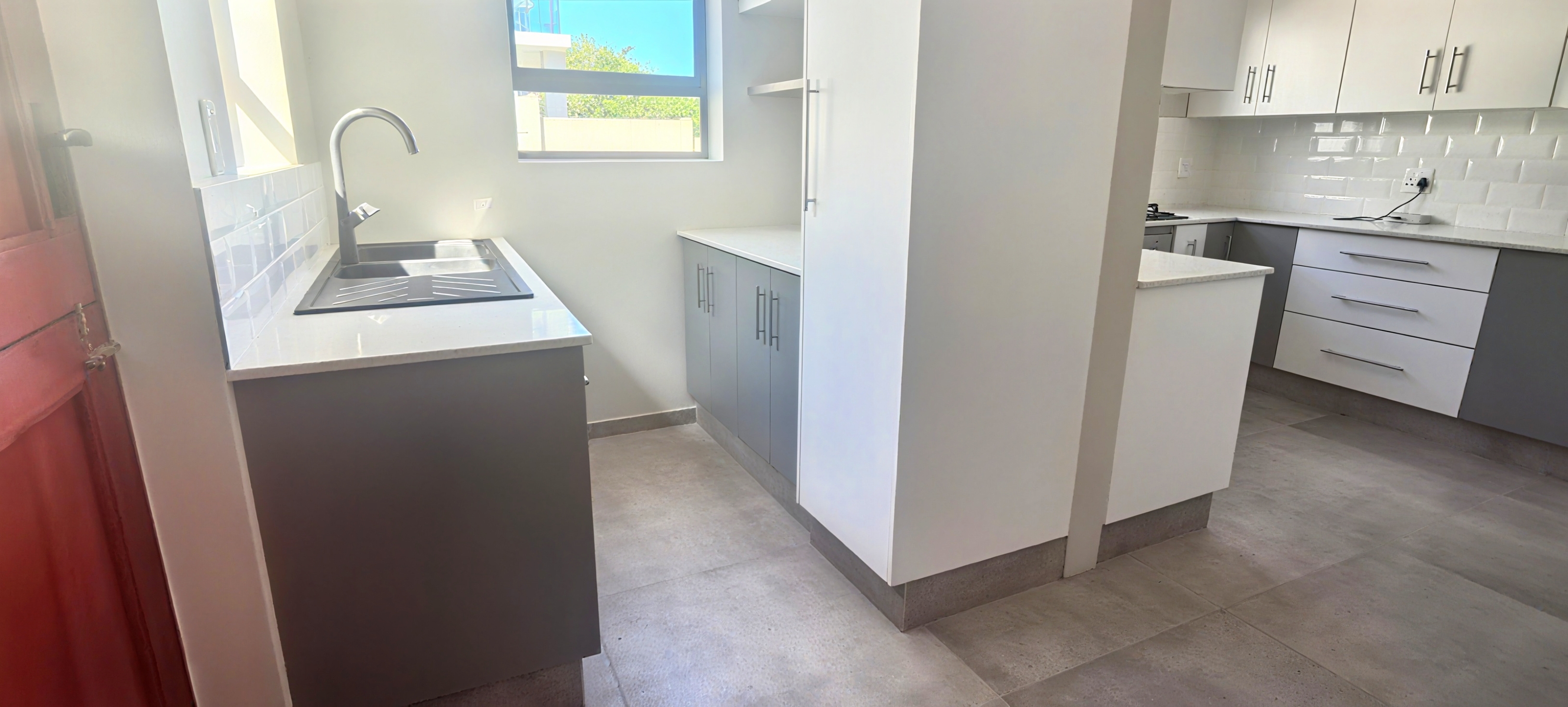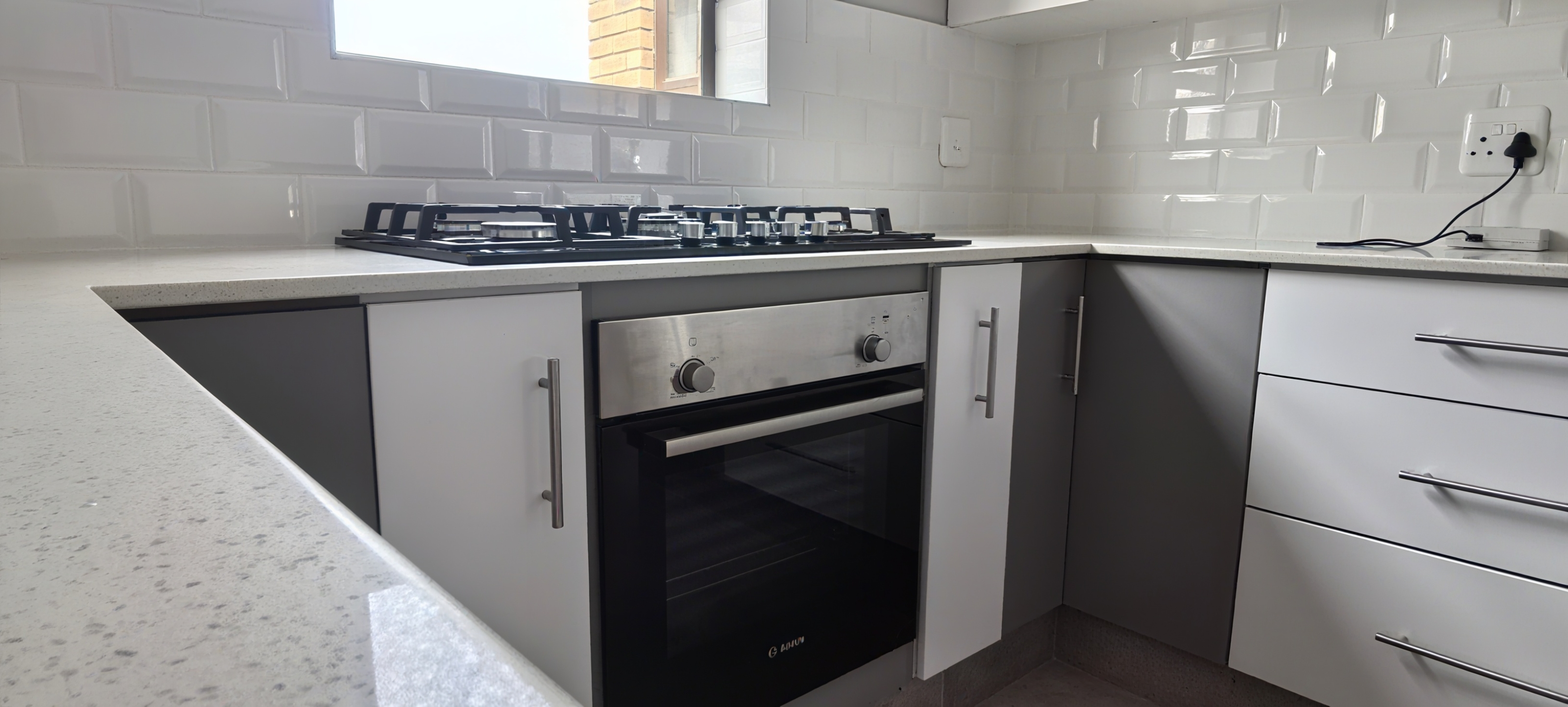 Contemporary Kitchen – Equipped with a gas hob, electric oven, and abundant cupboard space, plus a separate scullery with plumbing for both dishwasher and washing machine.