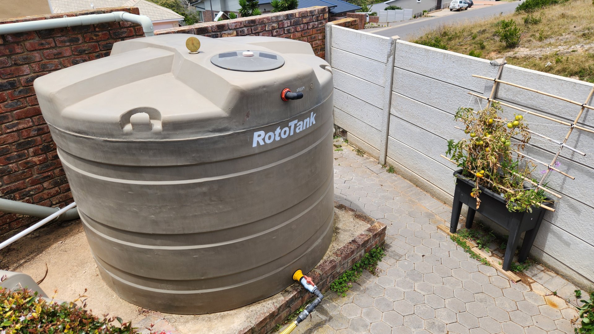 5 000 L water tank with pressure pump, filtration system and irrigation for the garden.
