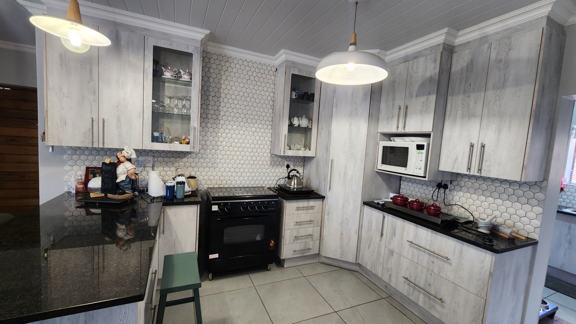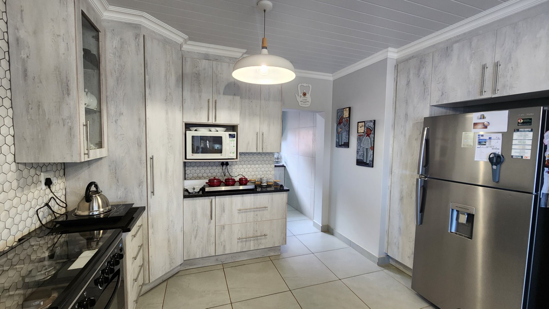 * Modern kitchen with ample cupboard space and separate scullery with space for three appliances.