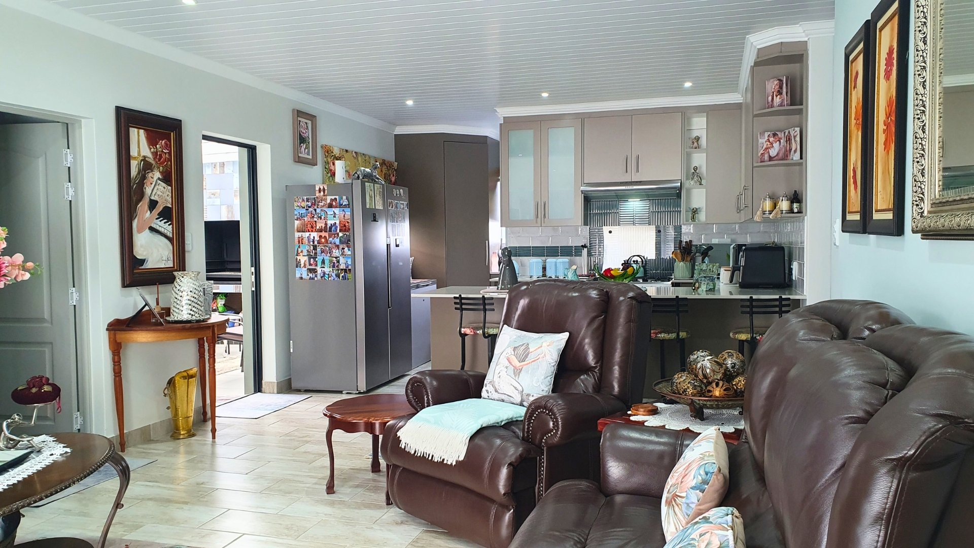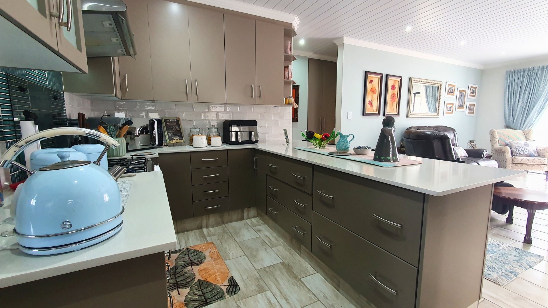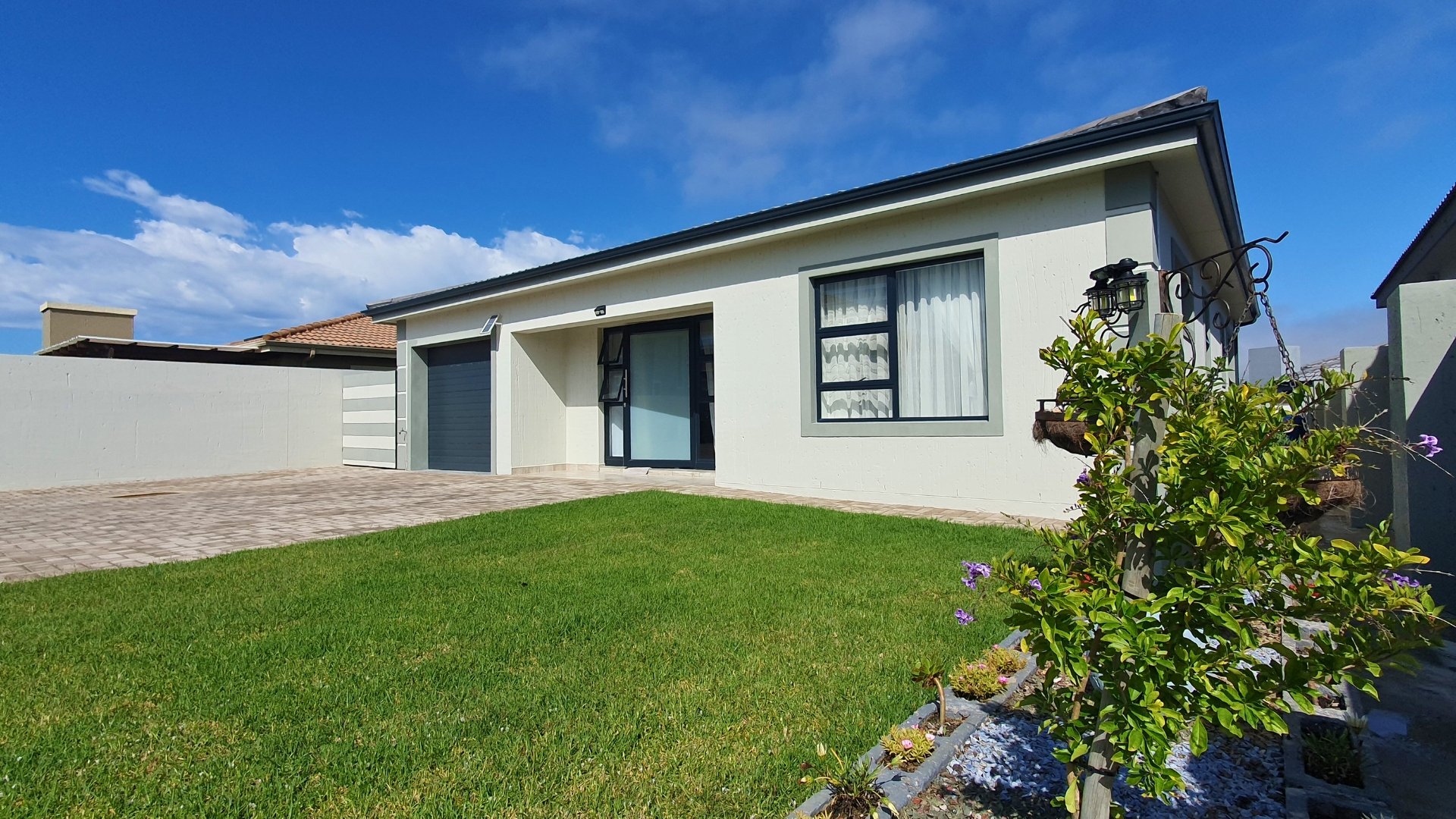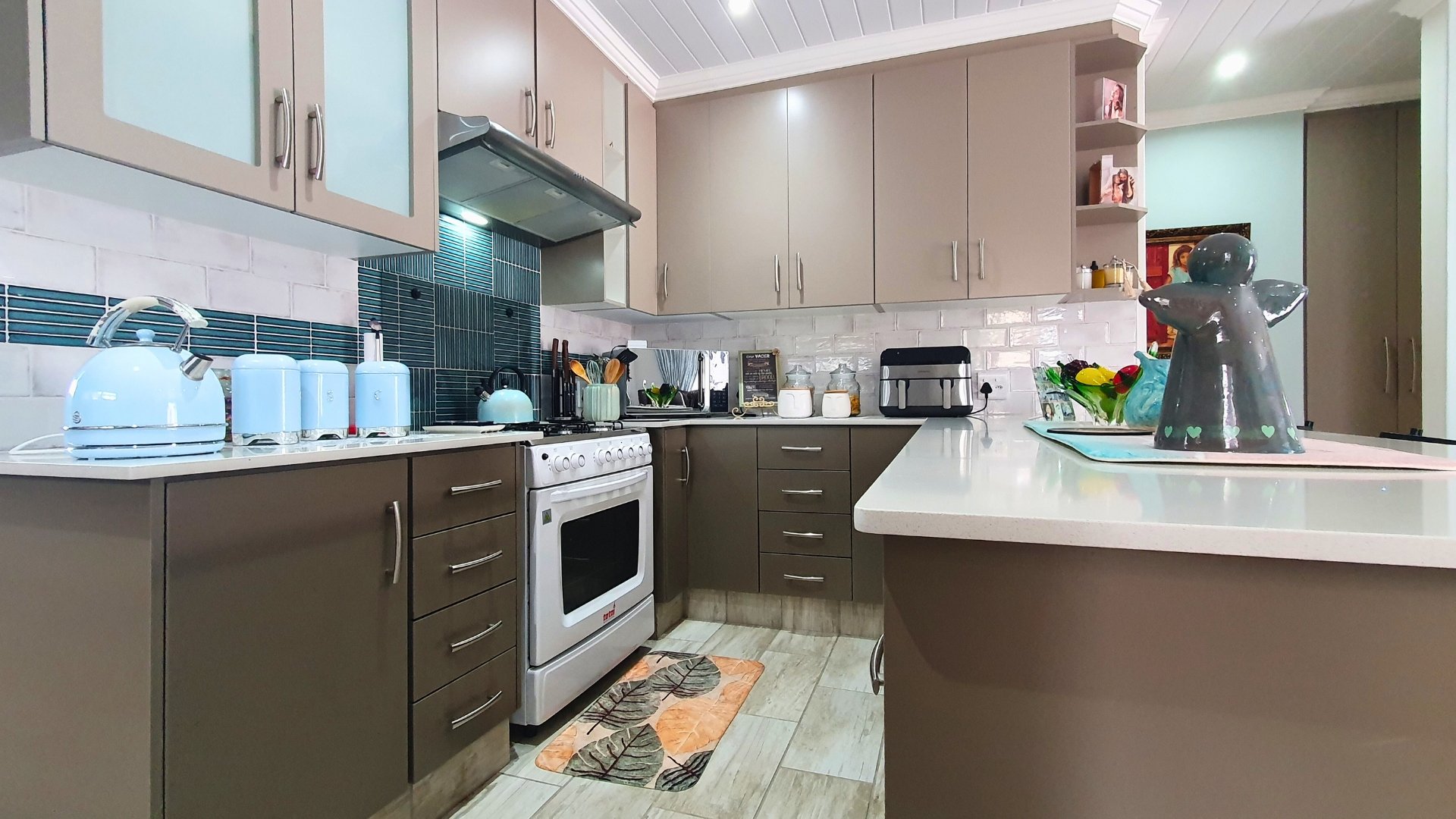 A welcoming entrance leads into the open-plan lounge and kitchen area, creating a seamless flow for relaxed living. The kitchen is beautifully finished with stunning granite countertops, a gas stove, stylish cabinetry, and a breakfast nook, making it both functional and inviting. Around the corner, a separate scullery provides additional cupboard space and a dedicated laundry area.