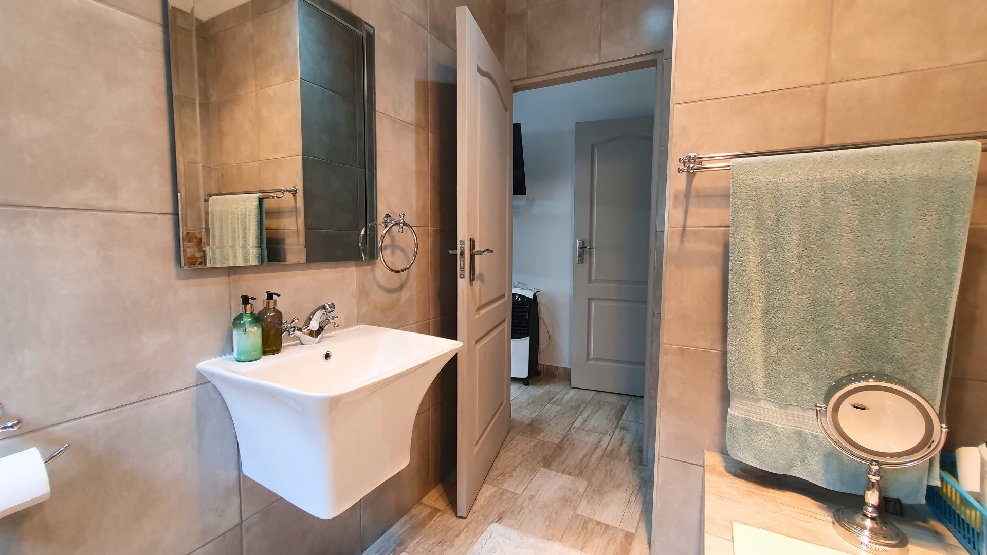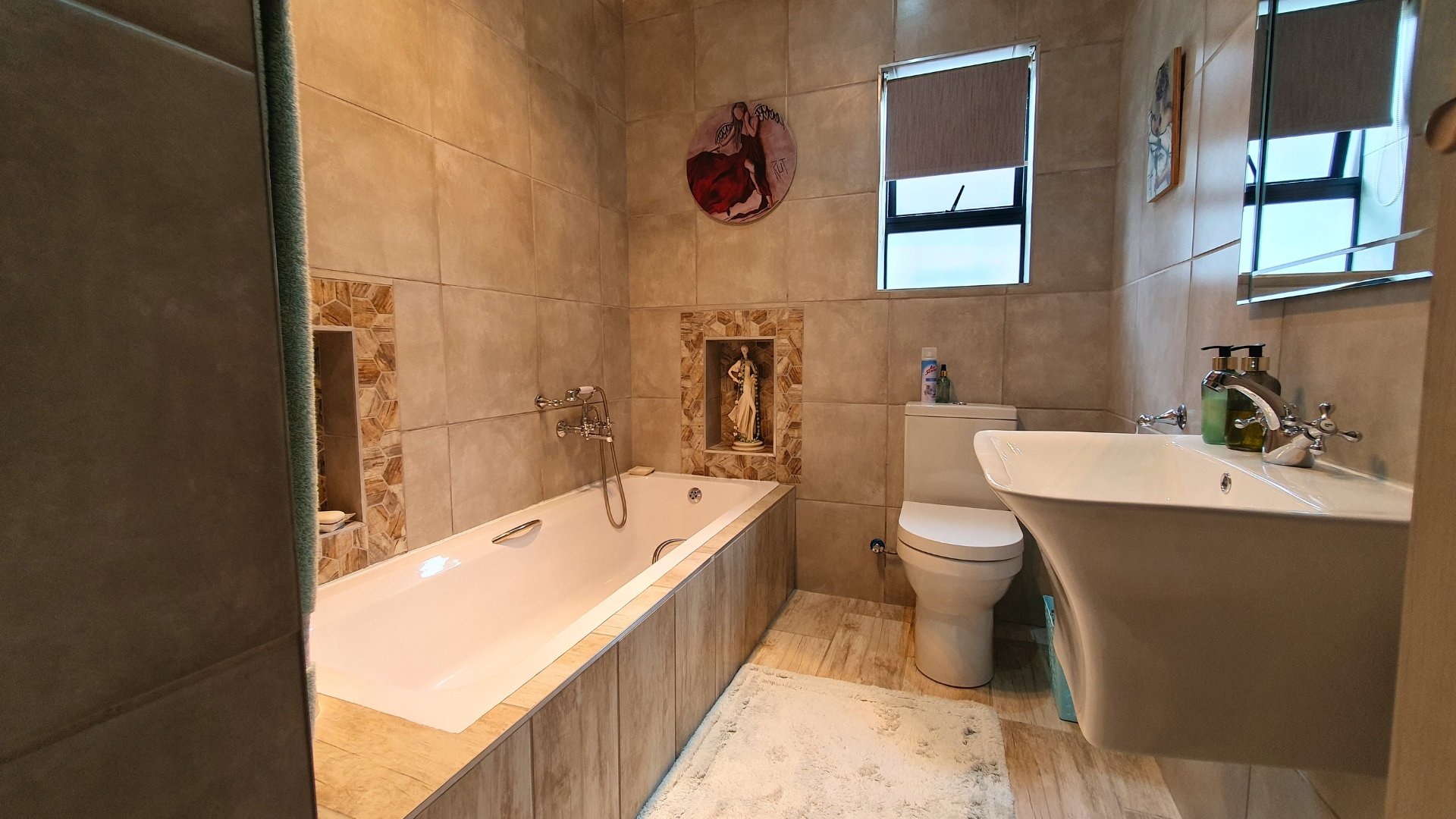 The home offers two spacious bedrooms and two well-appointed bathrooms. The guest bathroom includes a shower, toilet, and basin, while the main en-suite features a bath, toilet, and basin.
