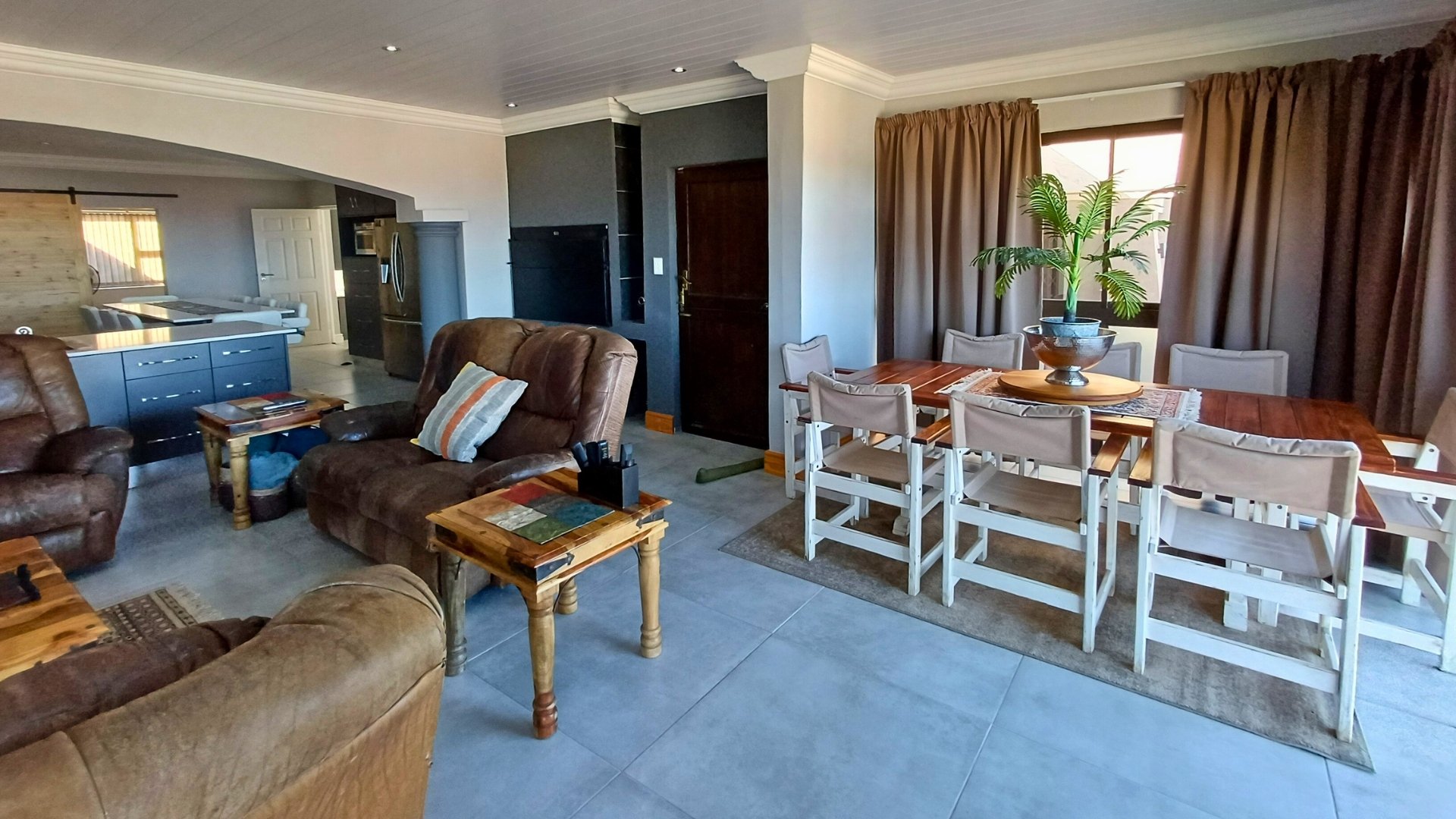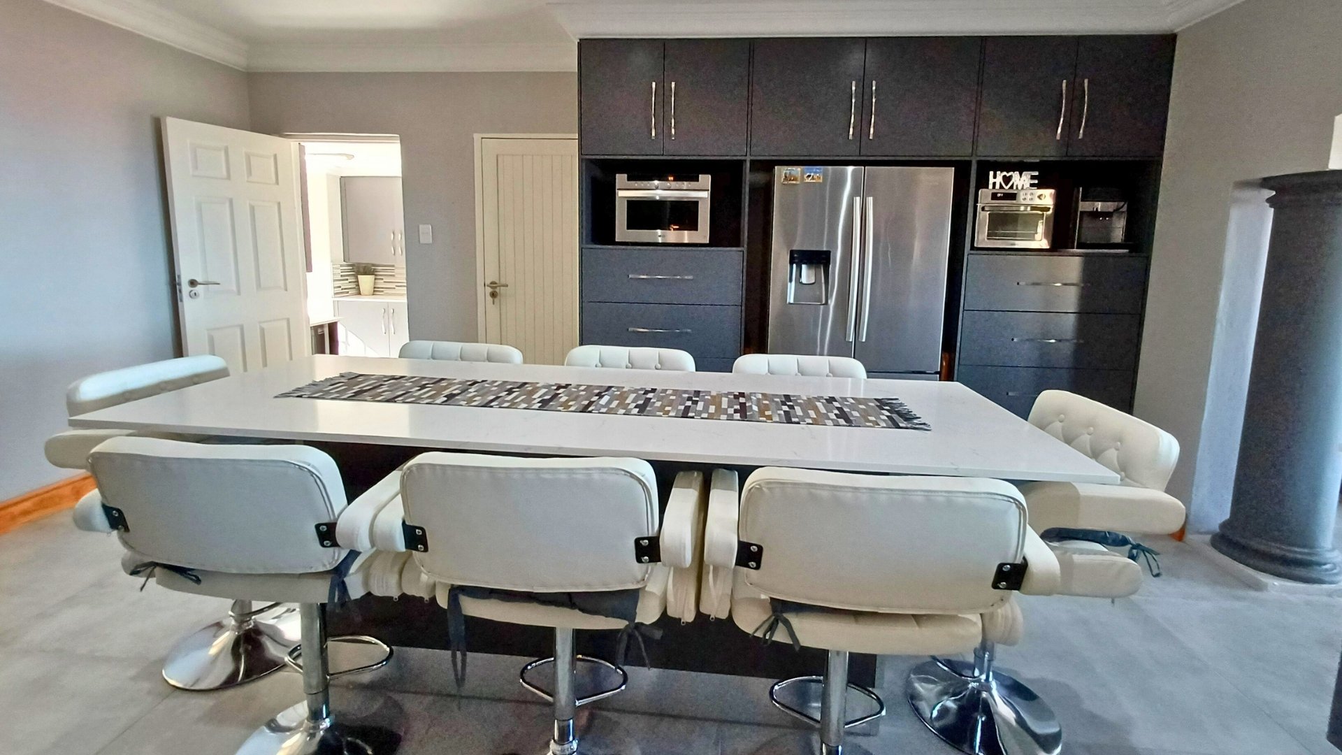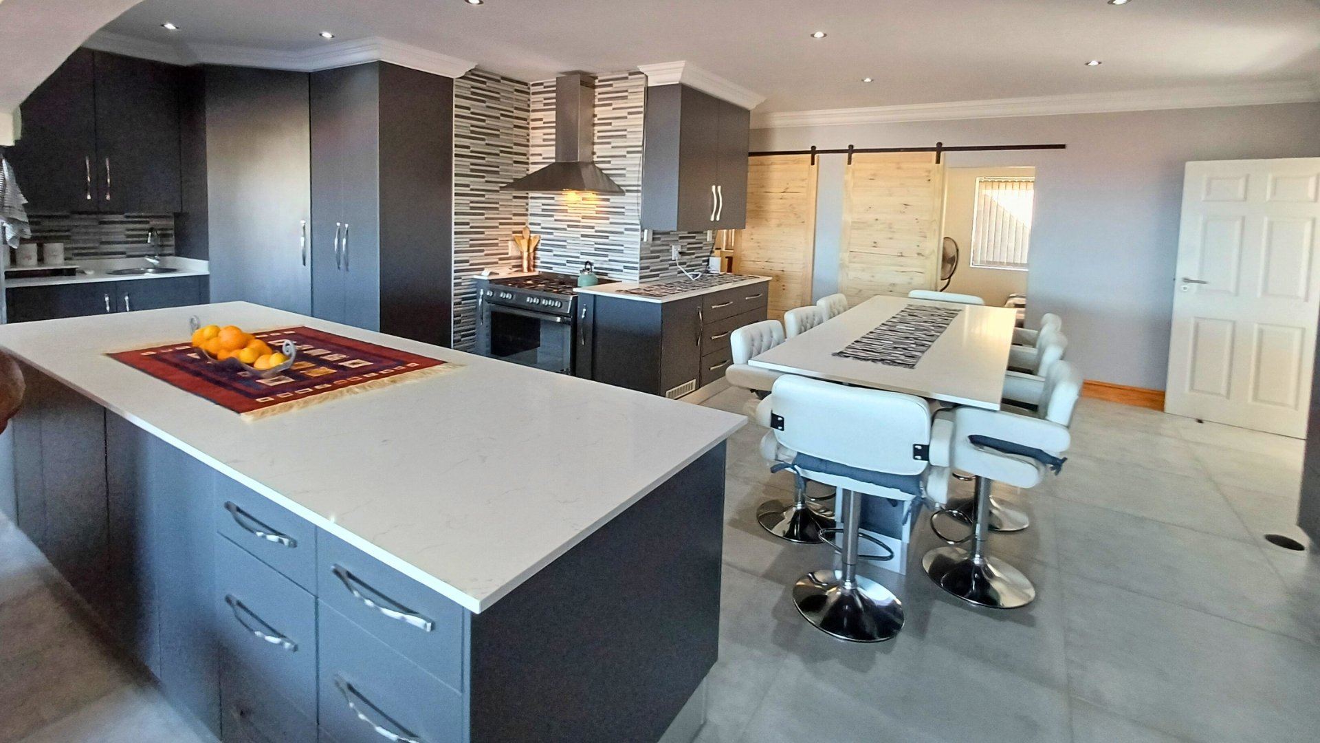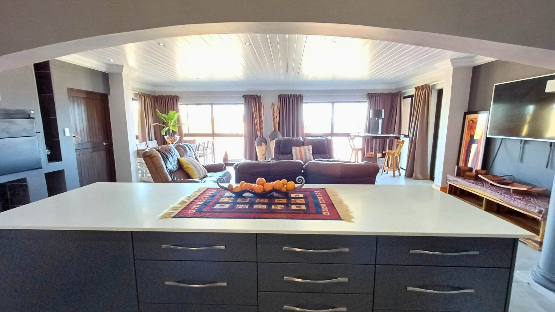 A seamless blend of living spaces welcomes you—an open-plan lounge, dining area, and braai room flow effortlessly into a brand-new modern kitchen with a separate scullery for added convenience. This wing offers four well-appointed bedrooms: two guest rooms sharing a bathroom and guest toilet, and two spacious en-suite main bedrooms. The upstairs master suite, complete with a full en-suite bathroom, opens onto a covered balcony, where you can take in the breathtaking ocean views.