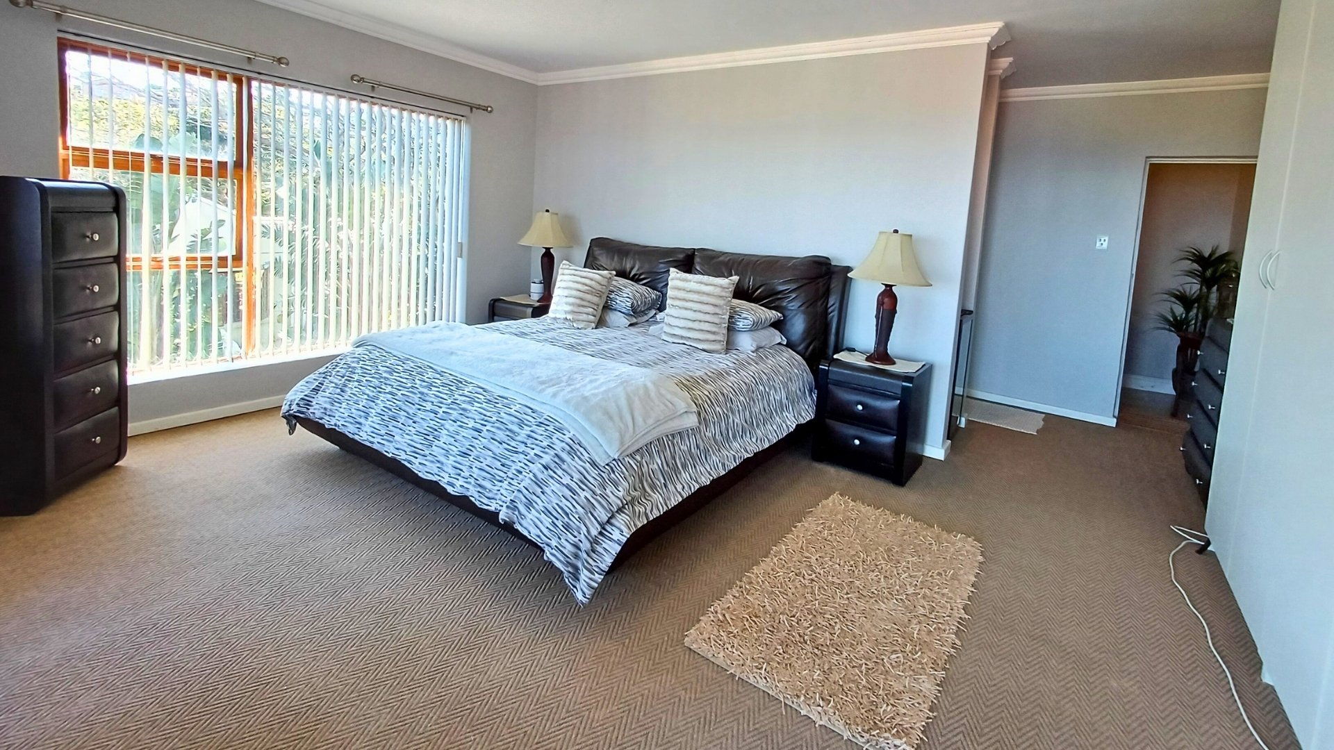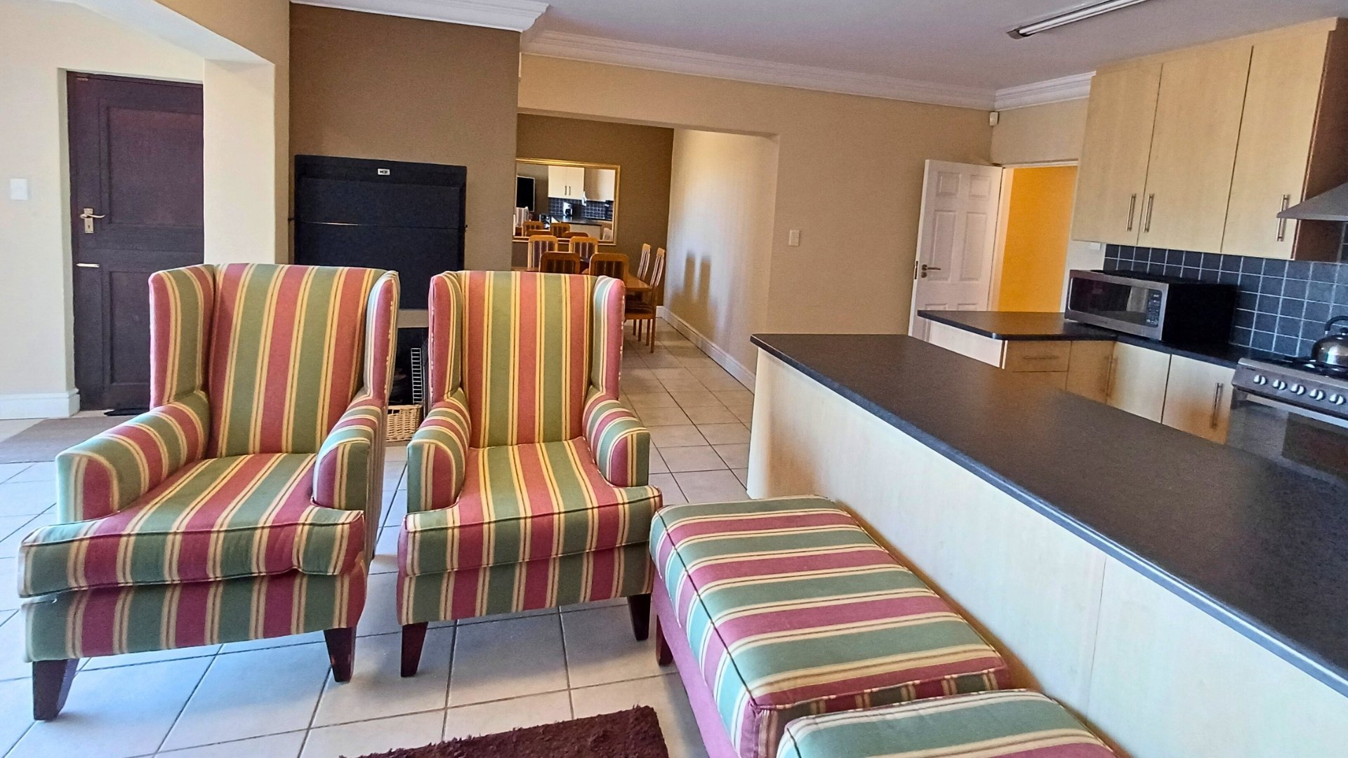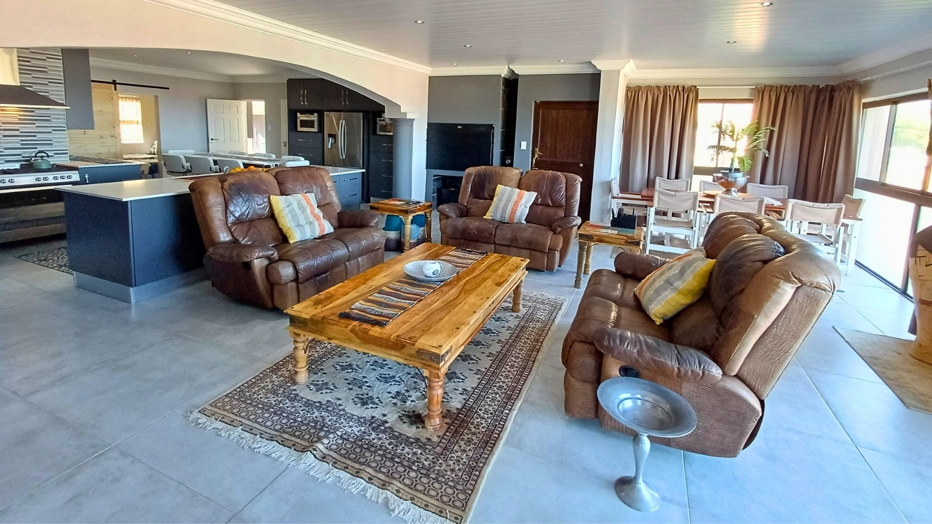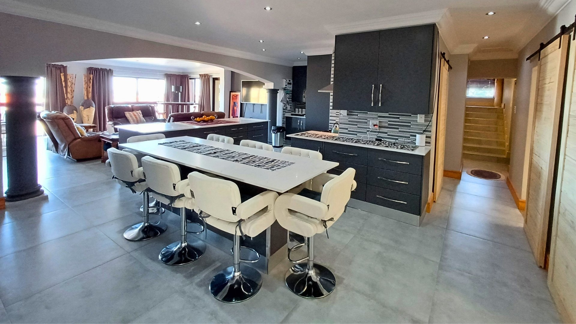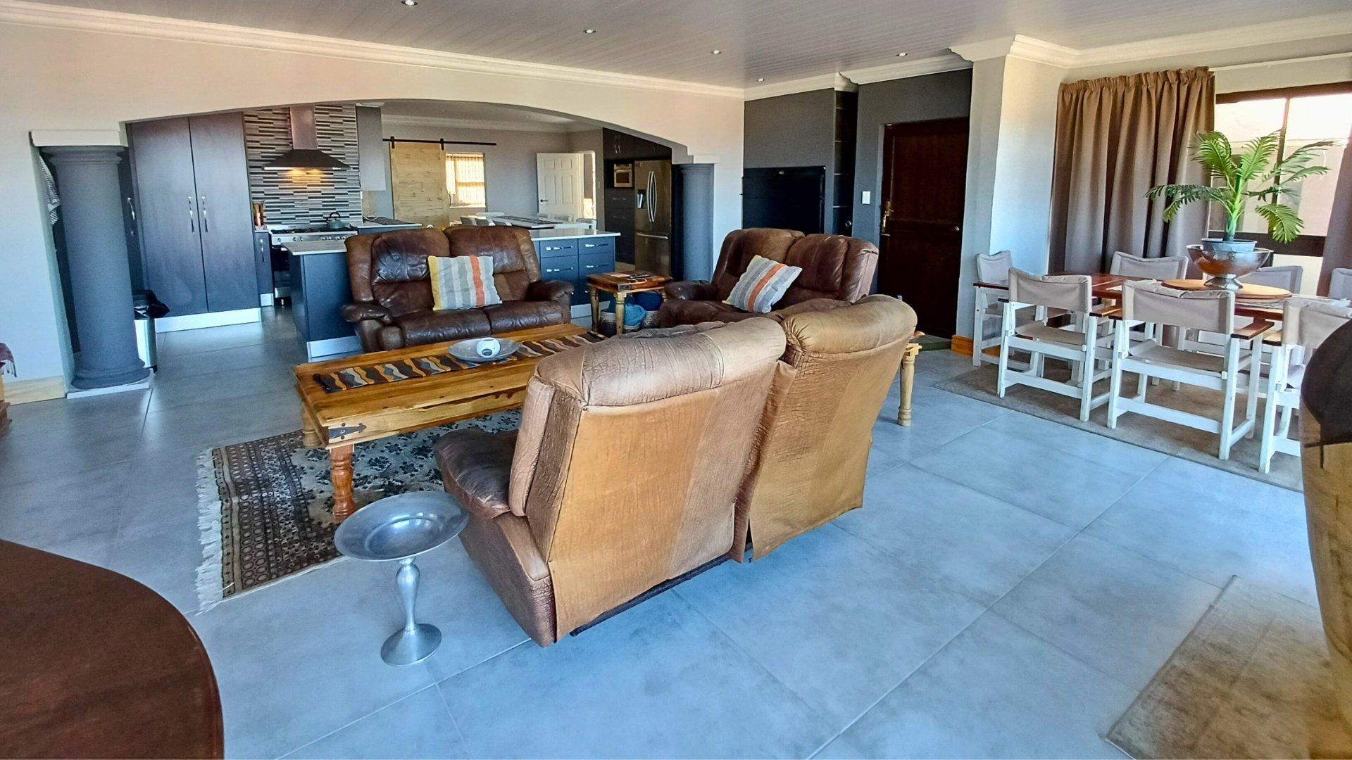 A seamless blend of living spaces welcomes you—an open-plan lounge, dining area, and braai room flow effortlessly into a brand-new modern kitchen with a separate scullery for added convenience. This wing offers four well-appointed bedrooms: two guest rooms sharing a bathroom and guest toilet, and two spacious en-suite main bedrooms. The upstairs master suite, complete with a full en-suite bathroom, opens onto a covered balcony, where you can take in the breathtaking ocean views.