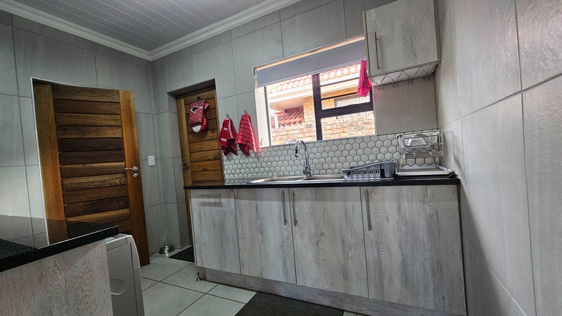 Modern kitchen with ample cupboard space, granite tops, and a separate scullery with space for three appliances