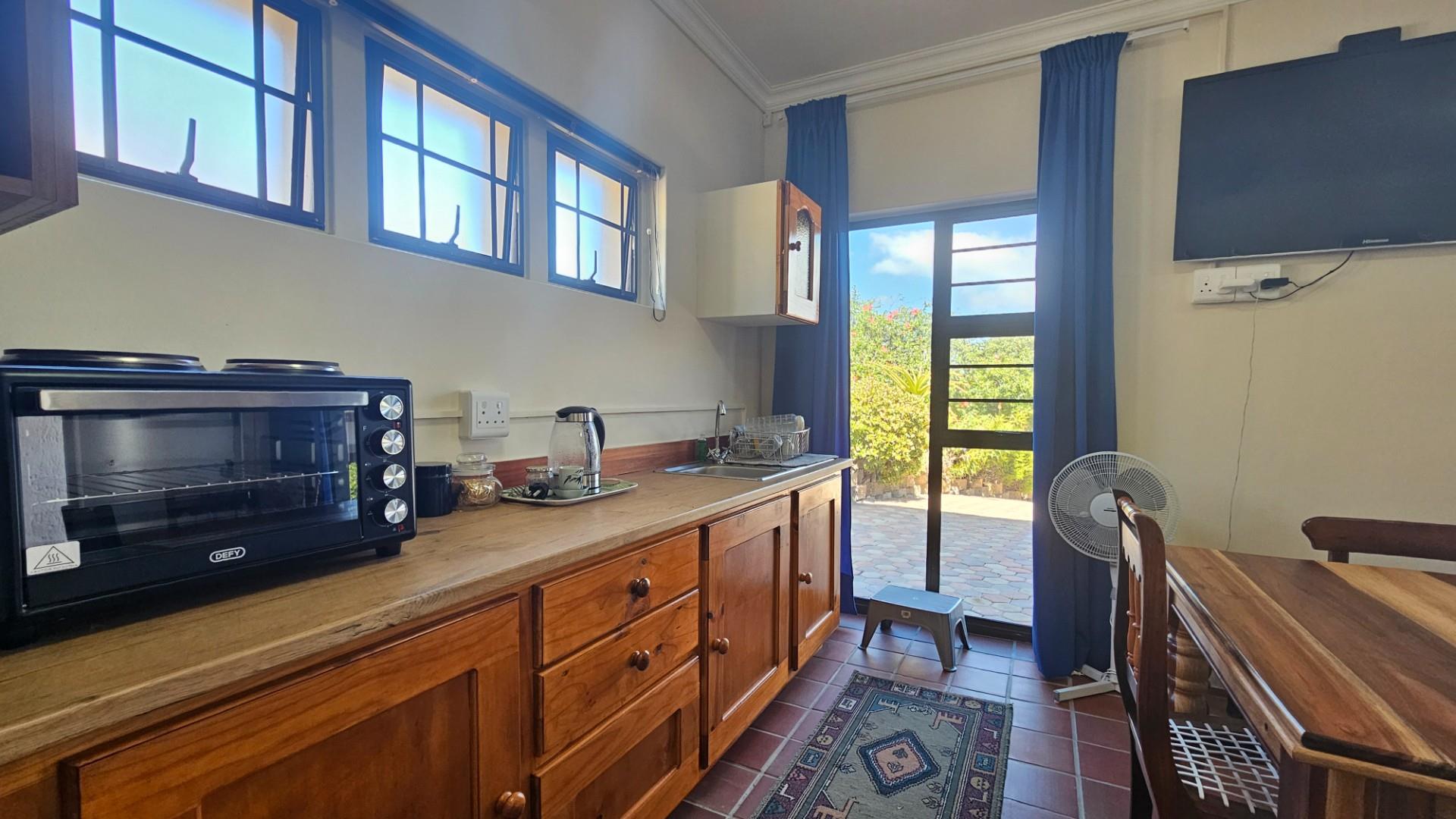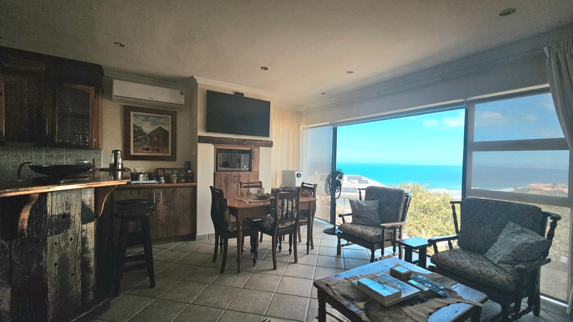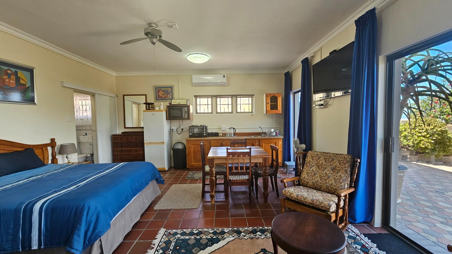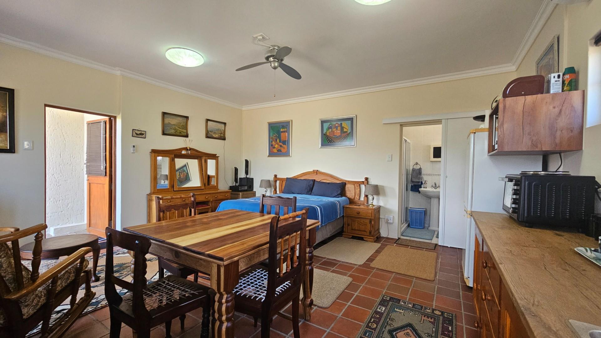 An air-conditioned bachelor flatlet with sea views, built-in kitchen cupboards and basin, and an en-suite bathroom with shower, basin, and toilet. The space easily accommodates a double bed, small lounge suite, and kitchen table. A patio door opens onto a paved private patio, making it ideal for guests or rental income.