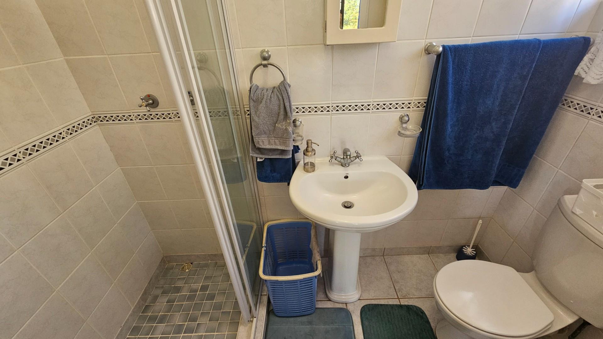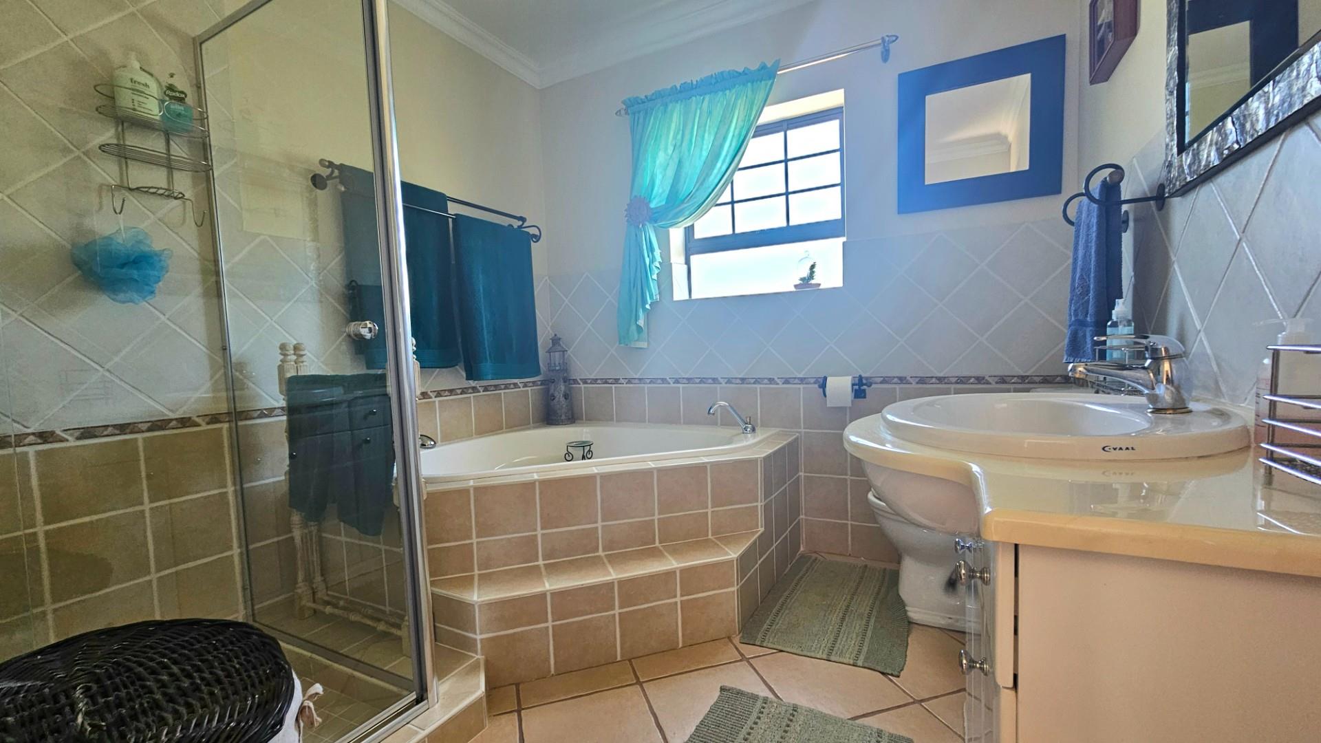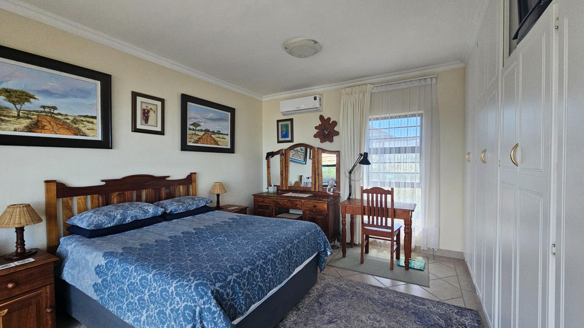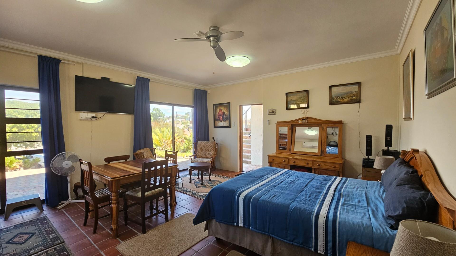 An air-conditioned bachelor flatlet with sea views, built-in kitchen cupboards and basin, and an en-suite bathroom with shower, basin, and toilet. The space easily accommodates a double bed, small lounge suite, and kitchen table. A patio door opens onto a paved private patio, making it ideal for guests or rental income.