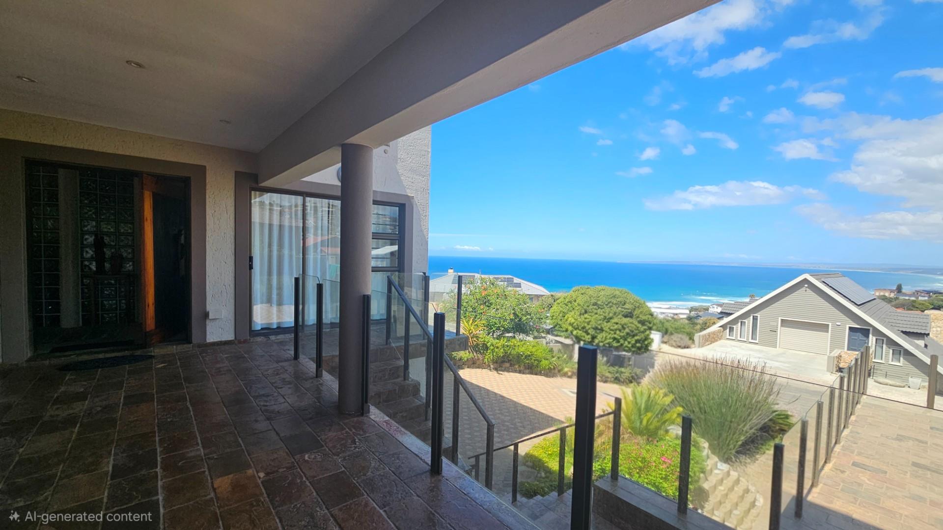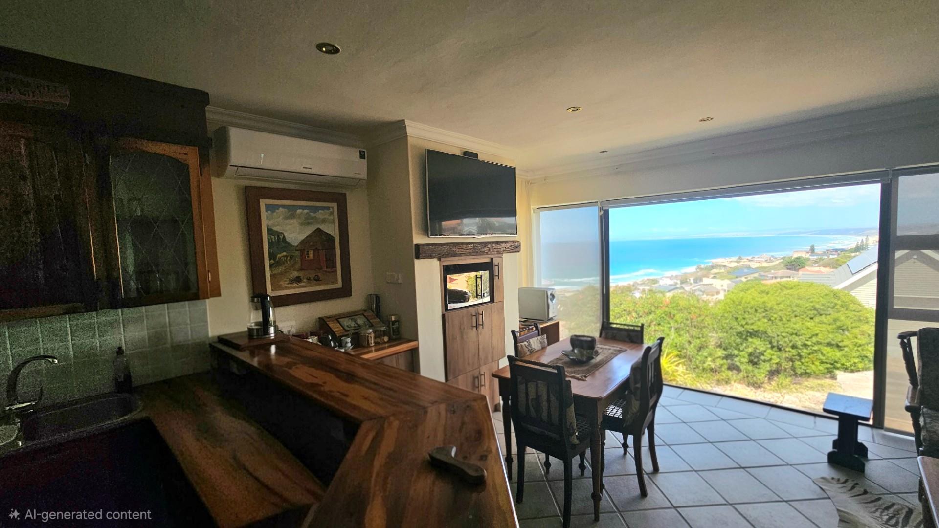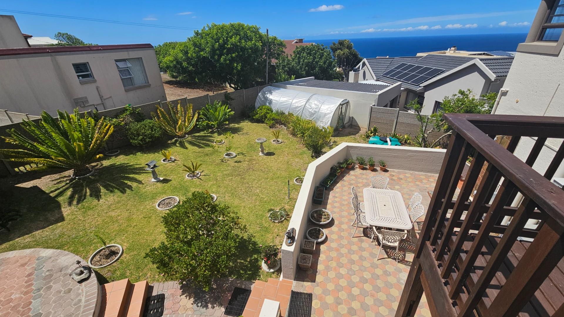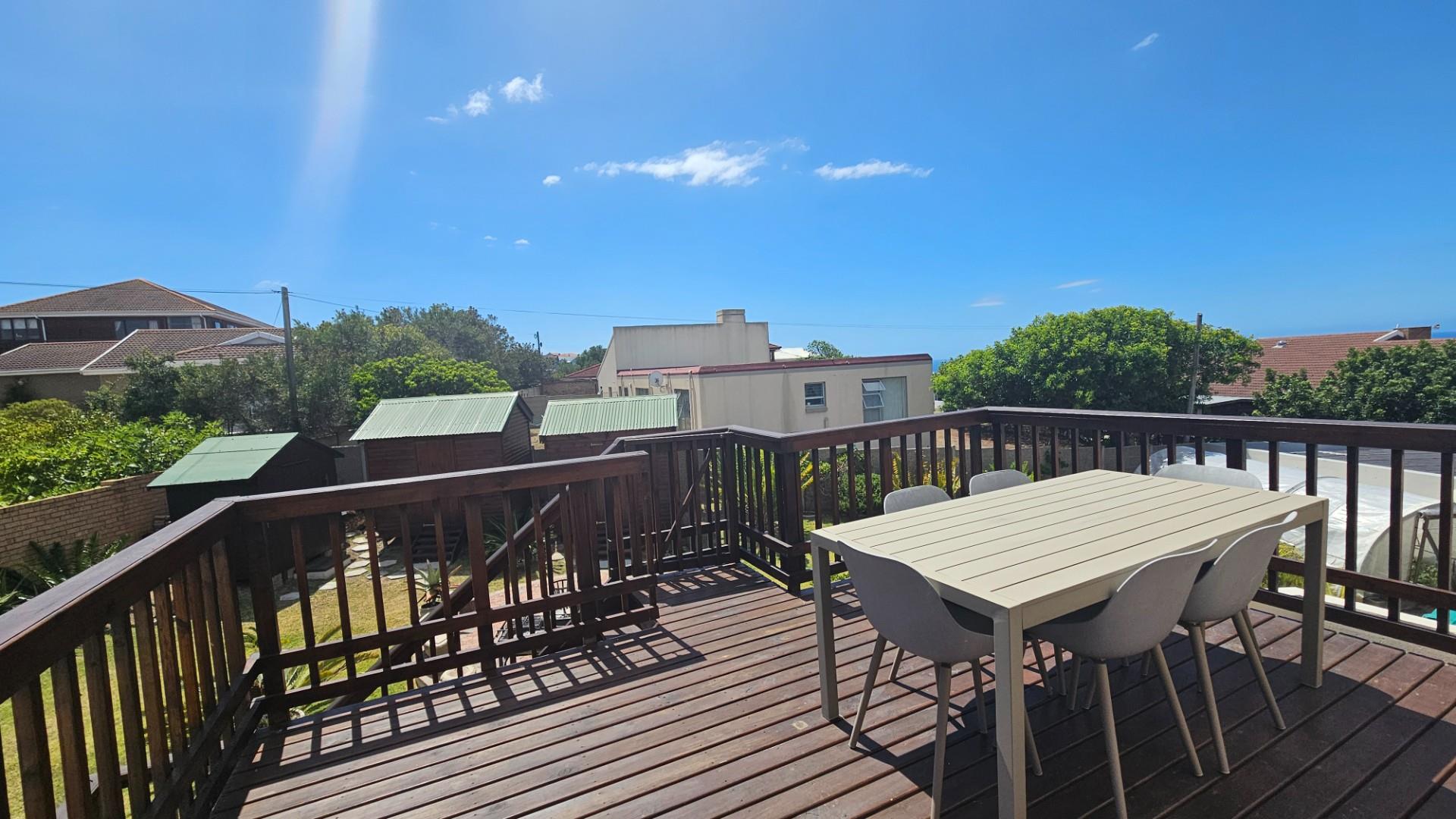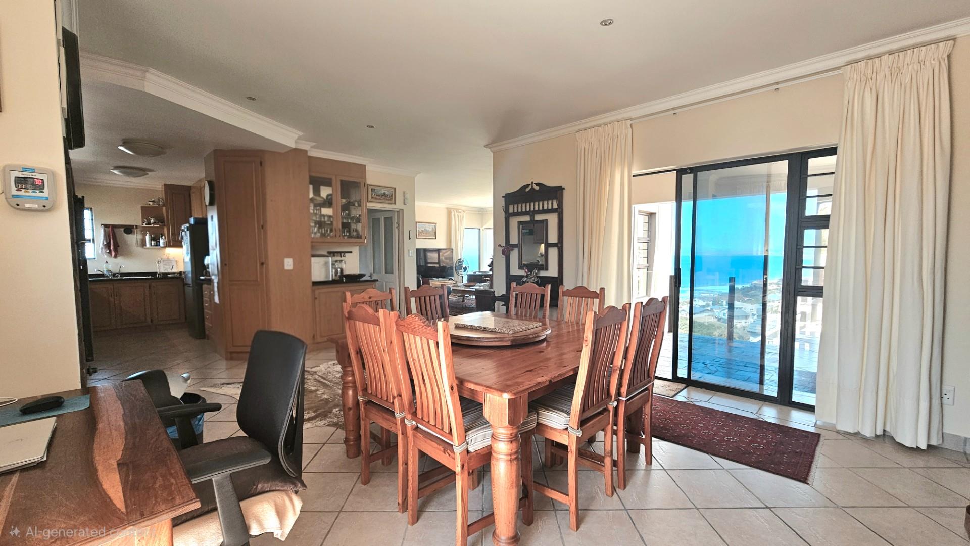 The open-plan tiled dining room, also air-conditioned, enjoys direct access to a sea-facing balcony on one side, while the opposite side leads to a wooden deck with staircase descending into a beautifully maintained back garden.