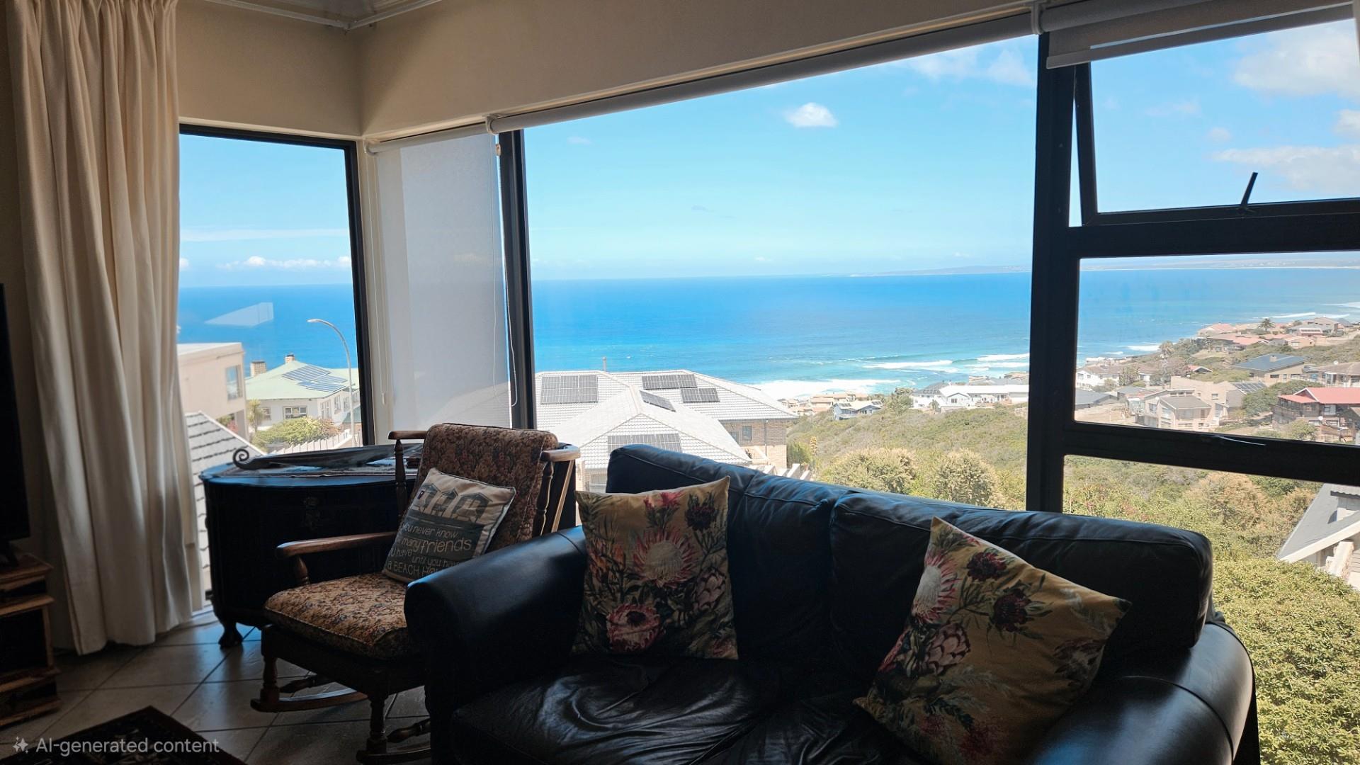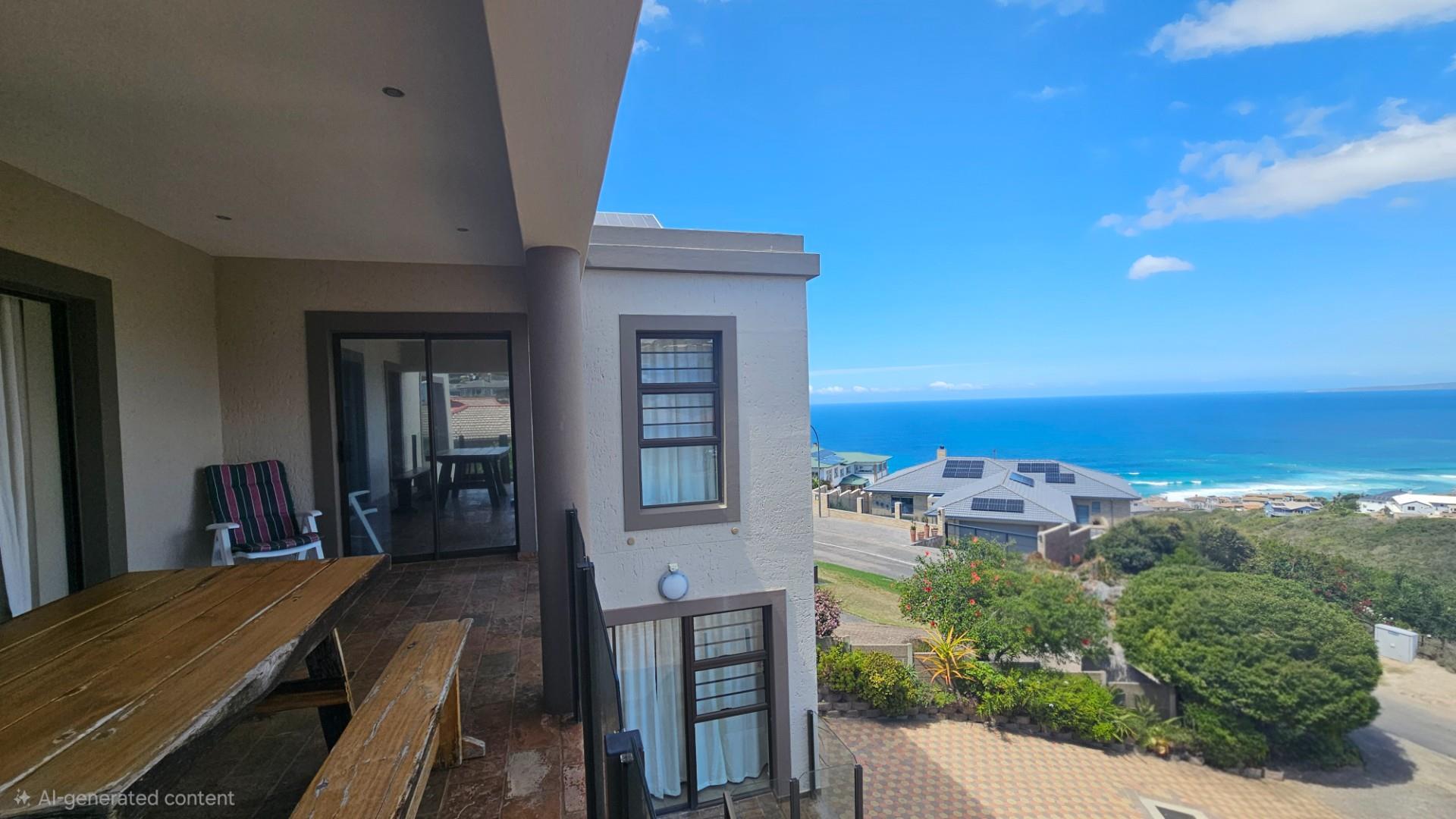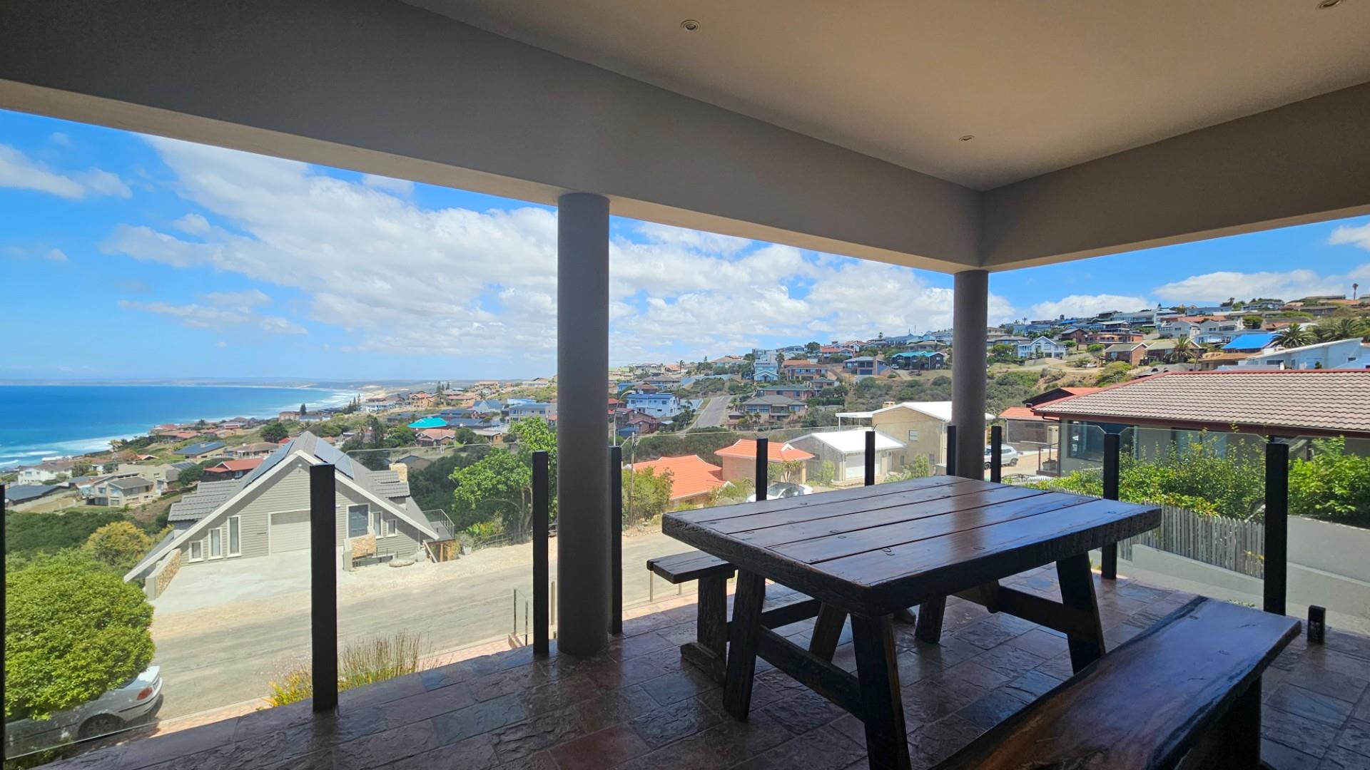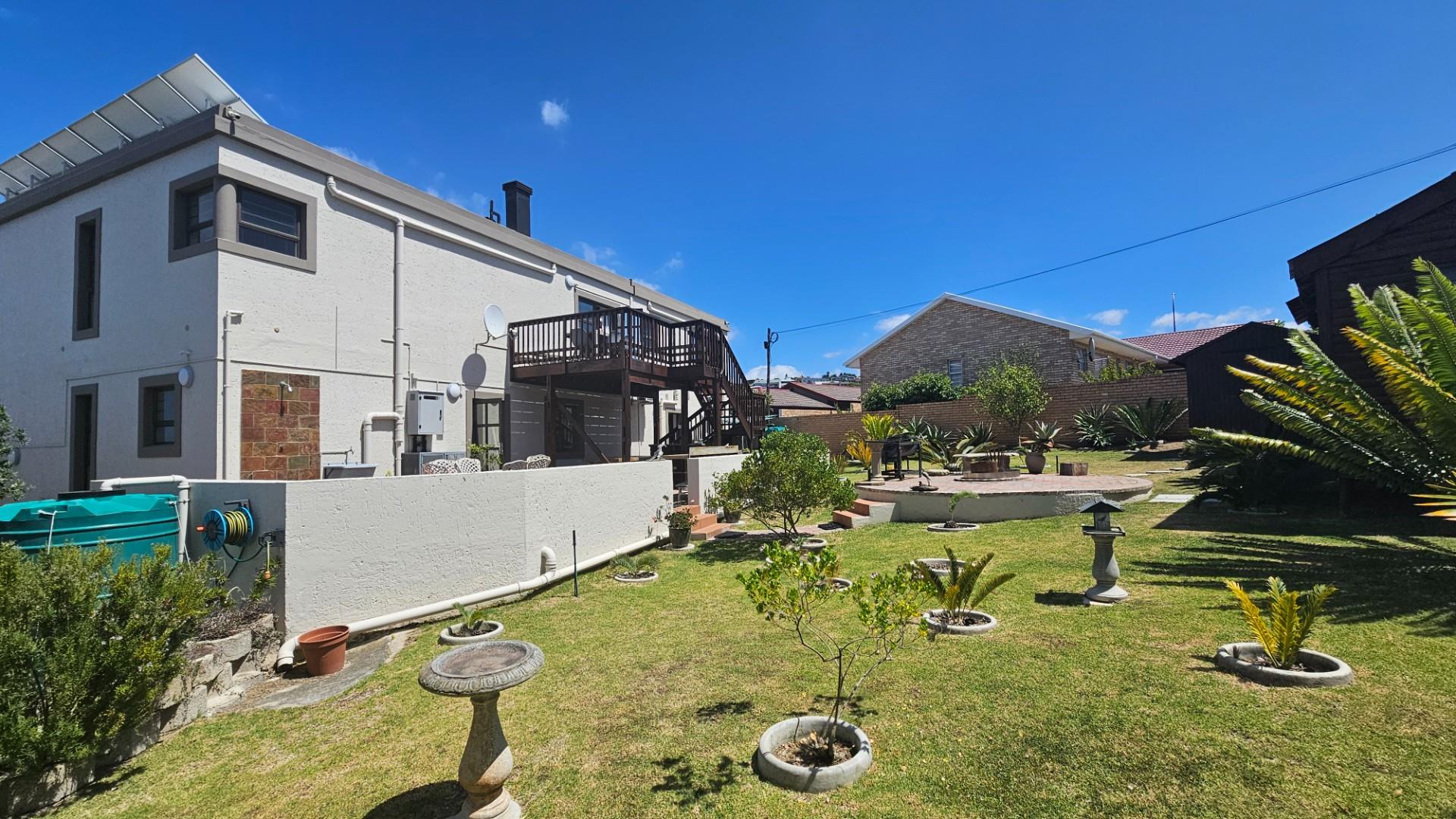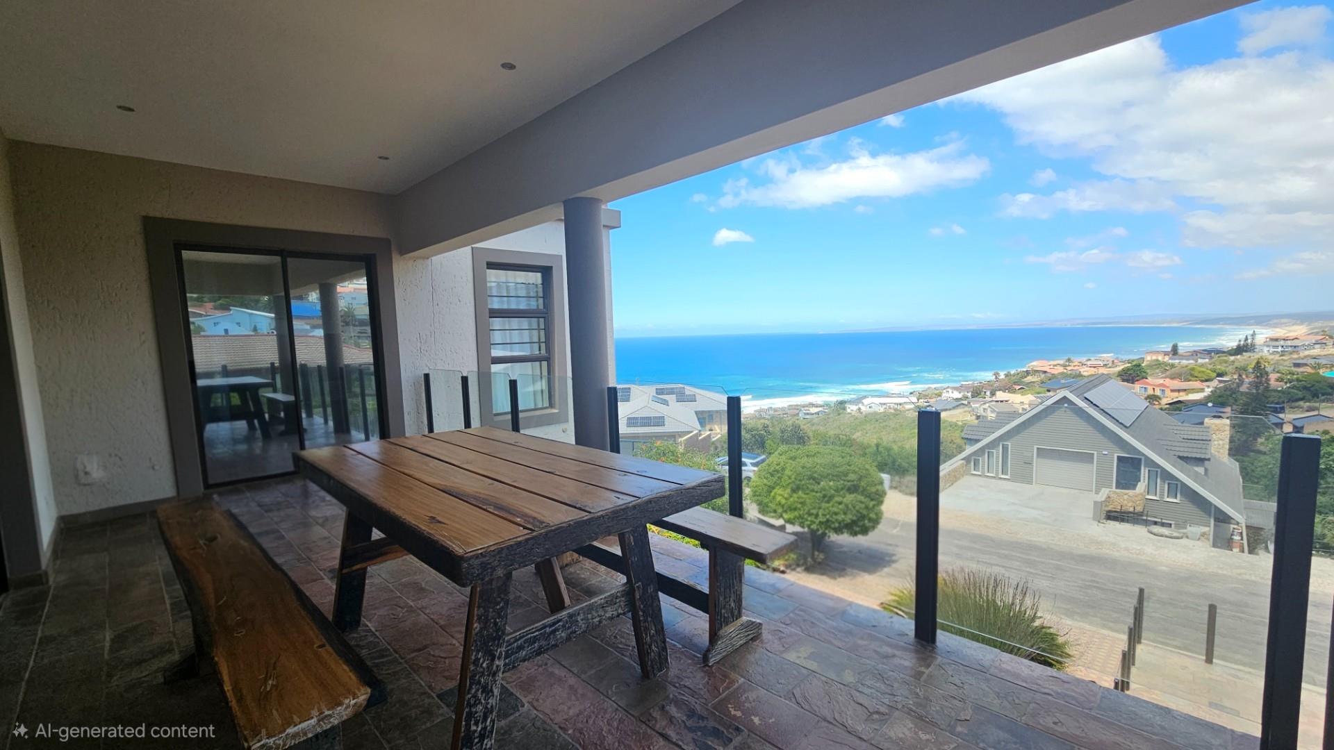 The open-plan tiled dining room, also air-conditioned, enjoys direct access to a sea-facing balcony on one side, while the opposite side leads to a wooden deck with staircase descending into a beautifully maintained back garden.