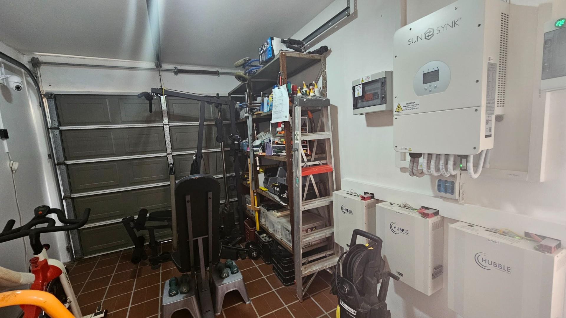 8kVA Sunsynk inverter, 16 × 550W solar panels, and three 5.5kVA batteries, providing ample power to run the home off-grid. System fully controllable via cellphone.