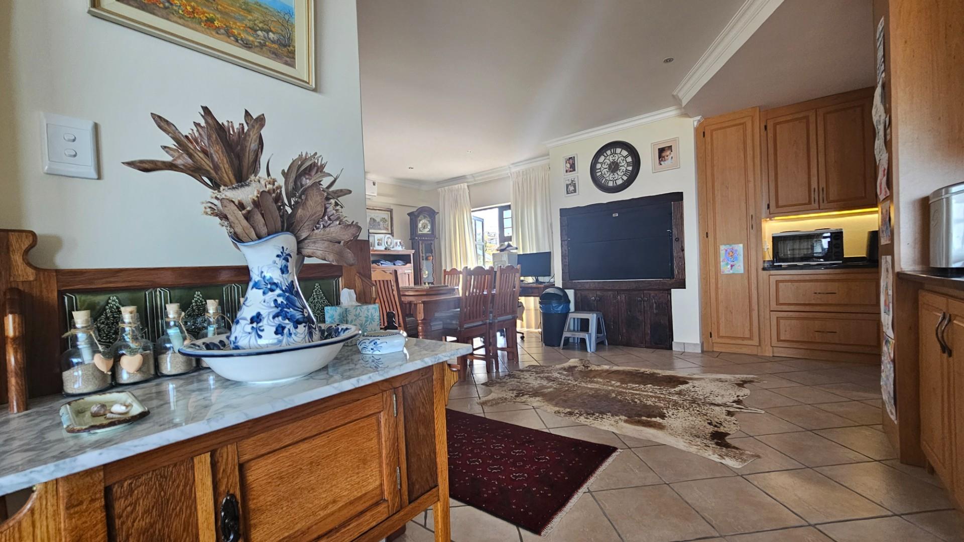 The modern open-plan kitchen features granite countertops, exquisite built-in wooden cupboards, a stove with gas hob and electric oven, and a large built-in braai seamlessly connecting the kitchen and dining area. A dishwasher connection point is already in place.