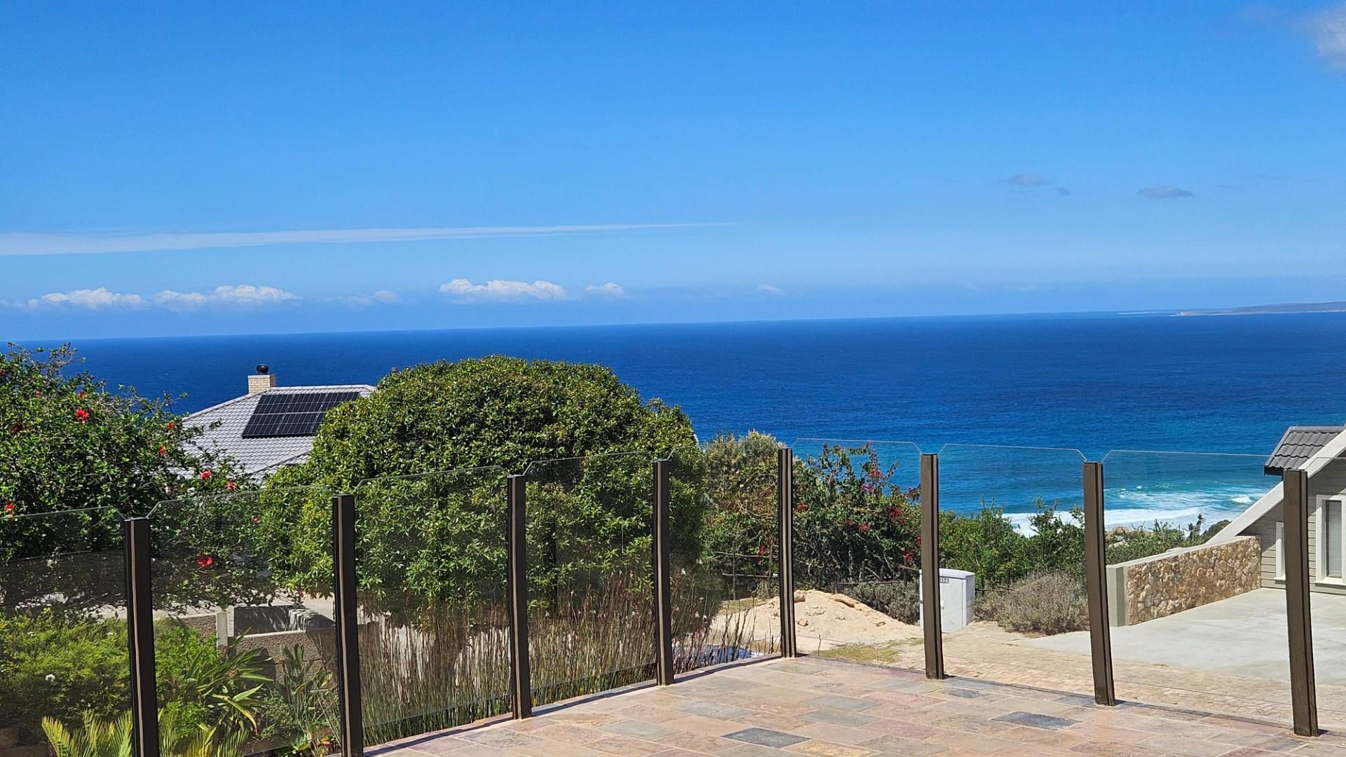 Double garage with electric roll-up doors. The concrete roof is cleverly utilized as an entertainment or relaxation deck, complete with glass railings and sea views — the perfect spot to watch the sun set over the ocean.