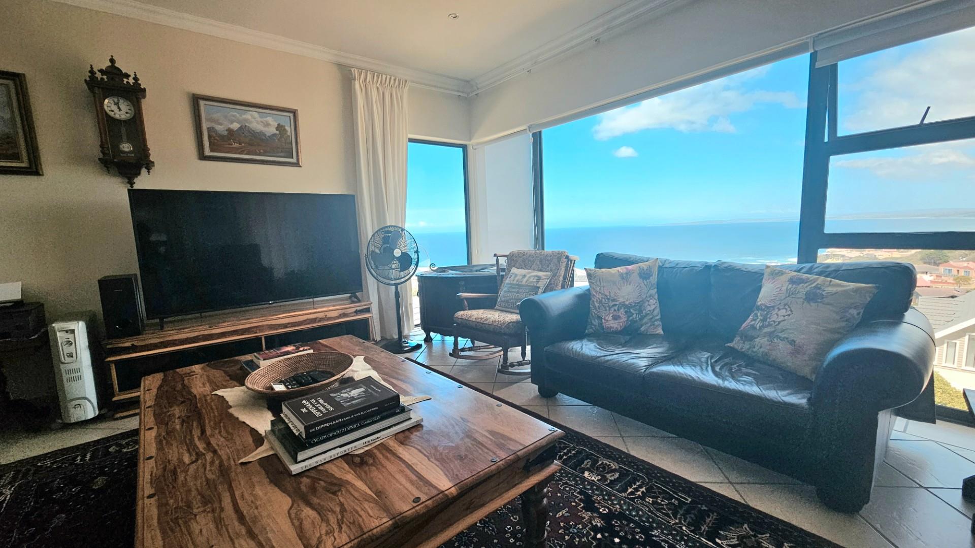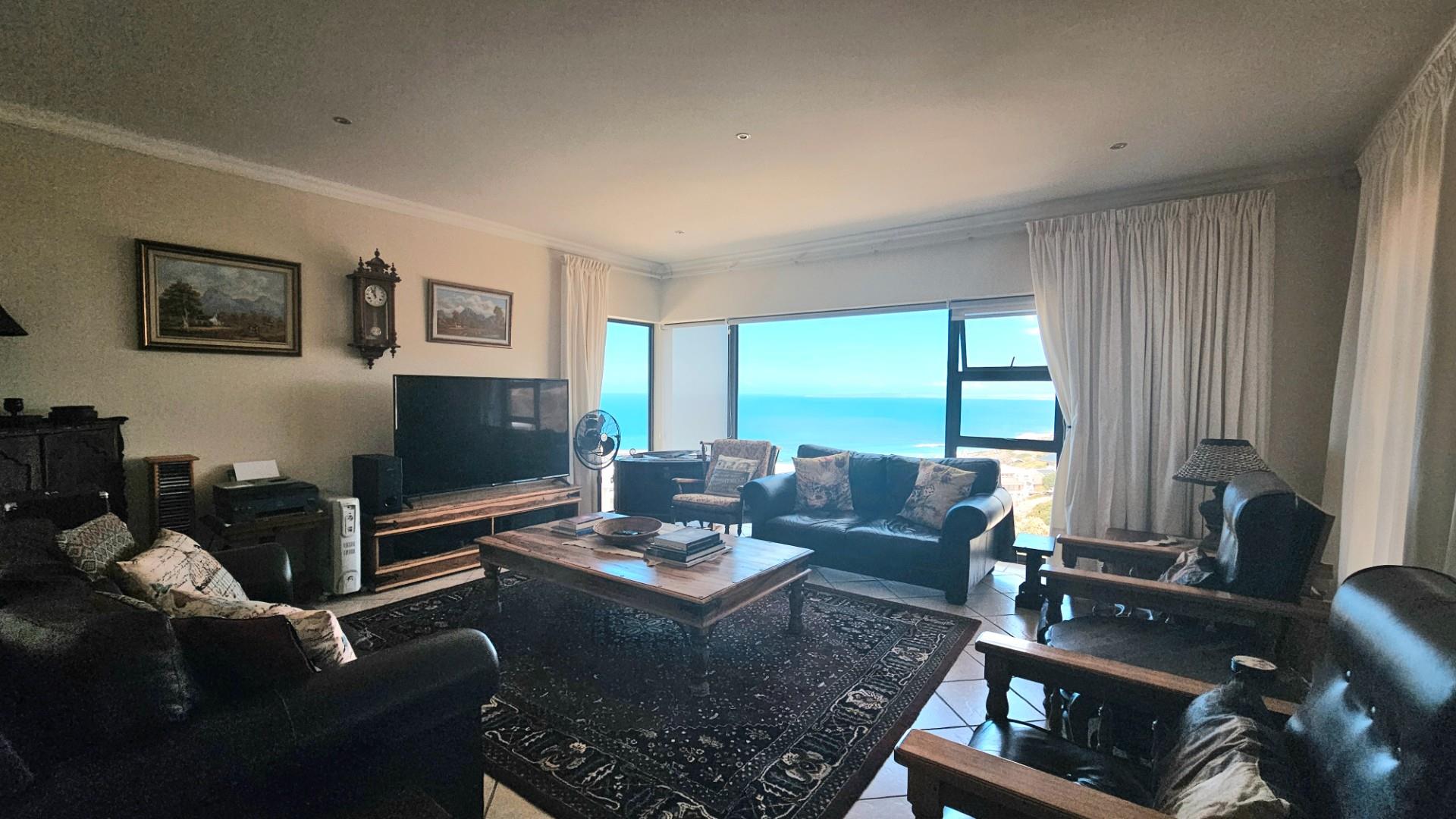 A spacious tiled lounge / TV room, air-conditioned and bathed in natural light, opens onto a balcony with glass railings, allowing uninterrupted ocean vistas.