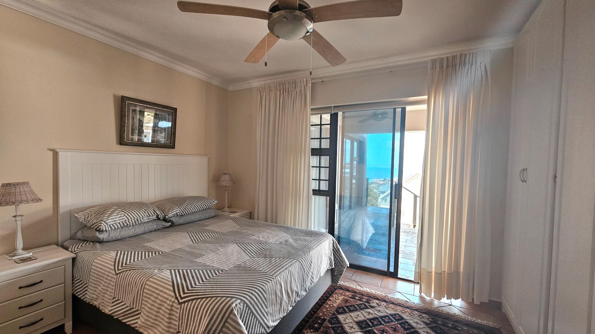 Two generously sized tiled bedrooms, both with built-in cupboards and ceiling fans, each enjoy their own private access to a patio with stunning views of the bay.